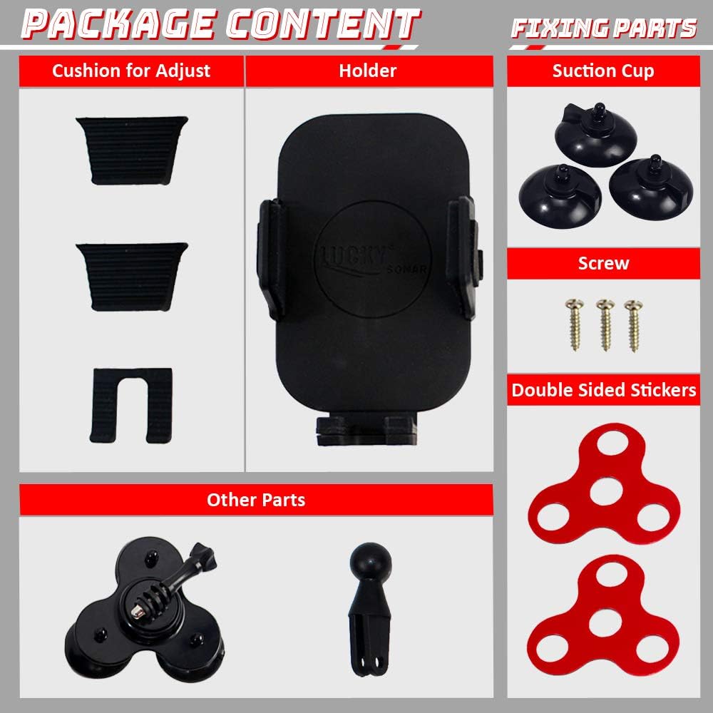 •  ◆ Designed for Fish Finder & Phone : LUCKY fish finder mount is designed to free your hands when you are fishing or driving. The mounting design is focus on sturdy and steady for both base and holder, so that the fish finder or phone won’t drop down in vibrations. The phone ball mount can be wildly applied in truck, car, marine, kayak and etc.