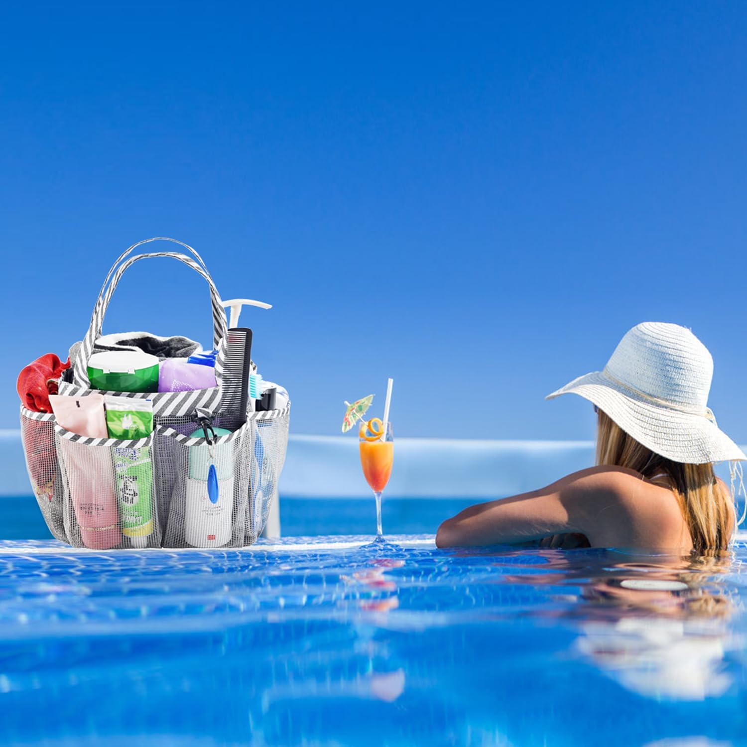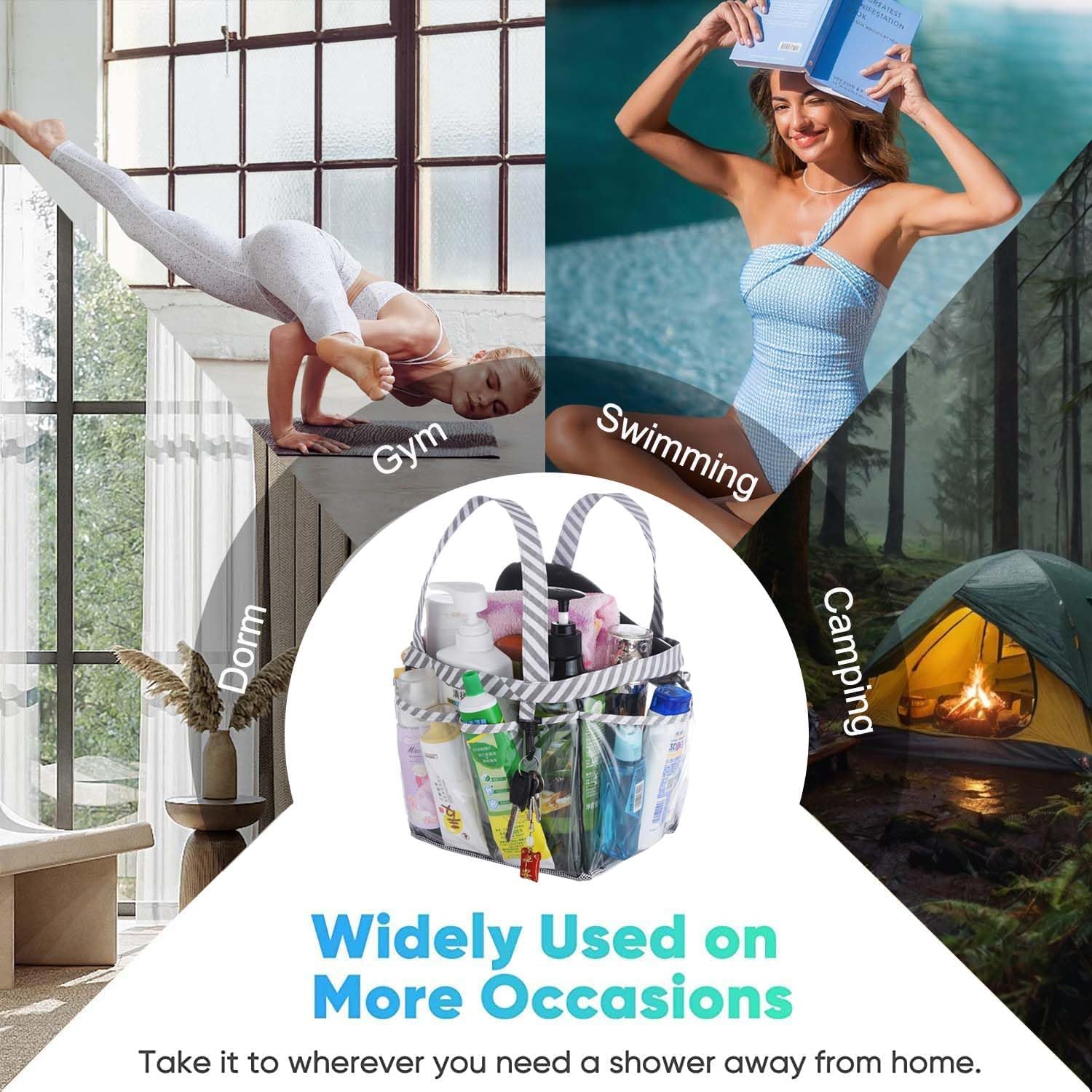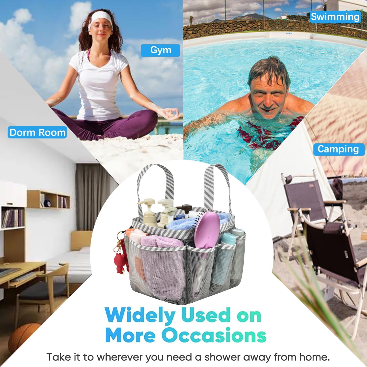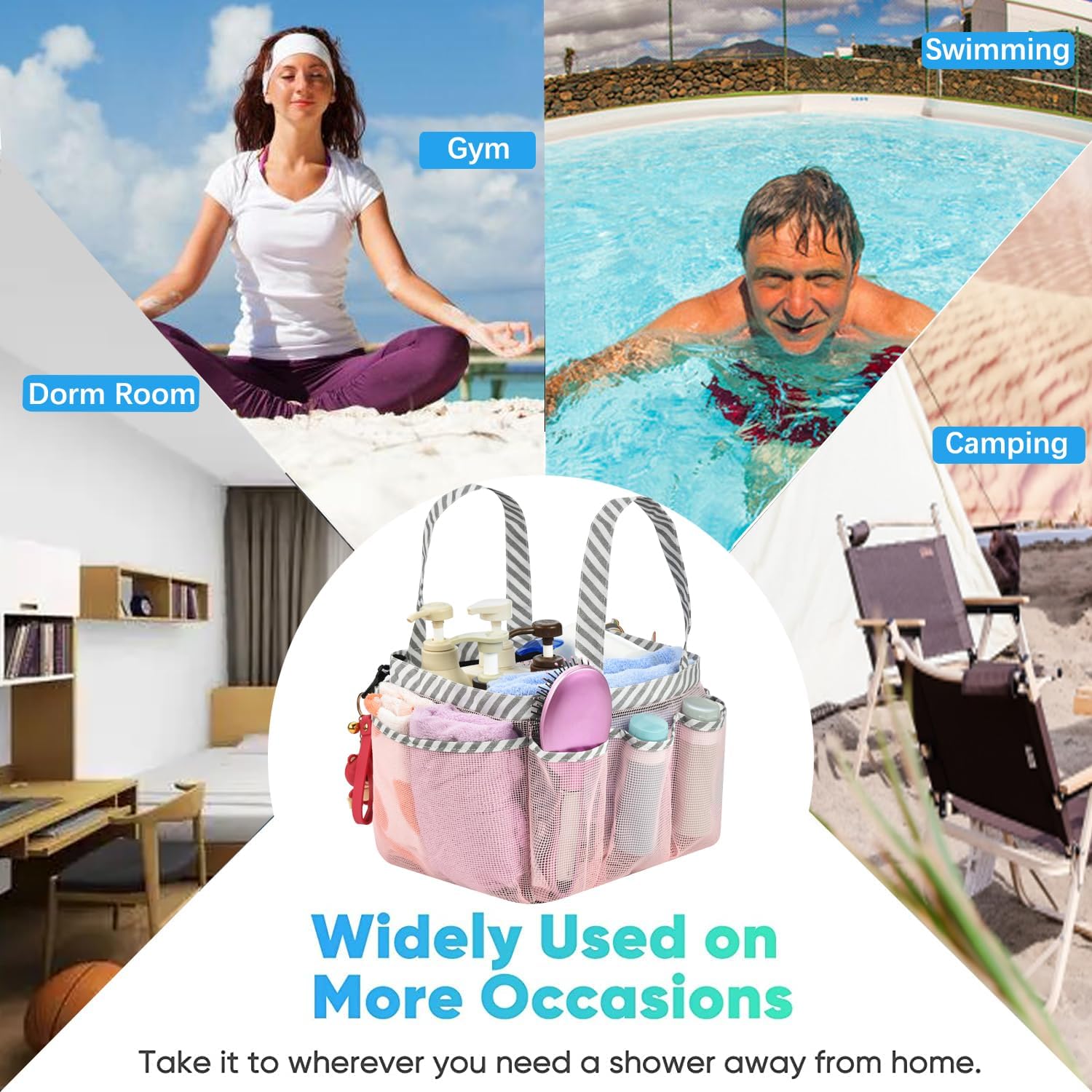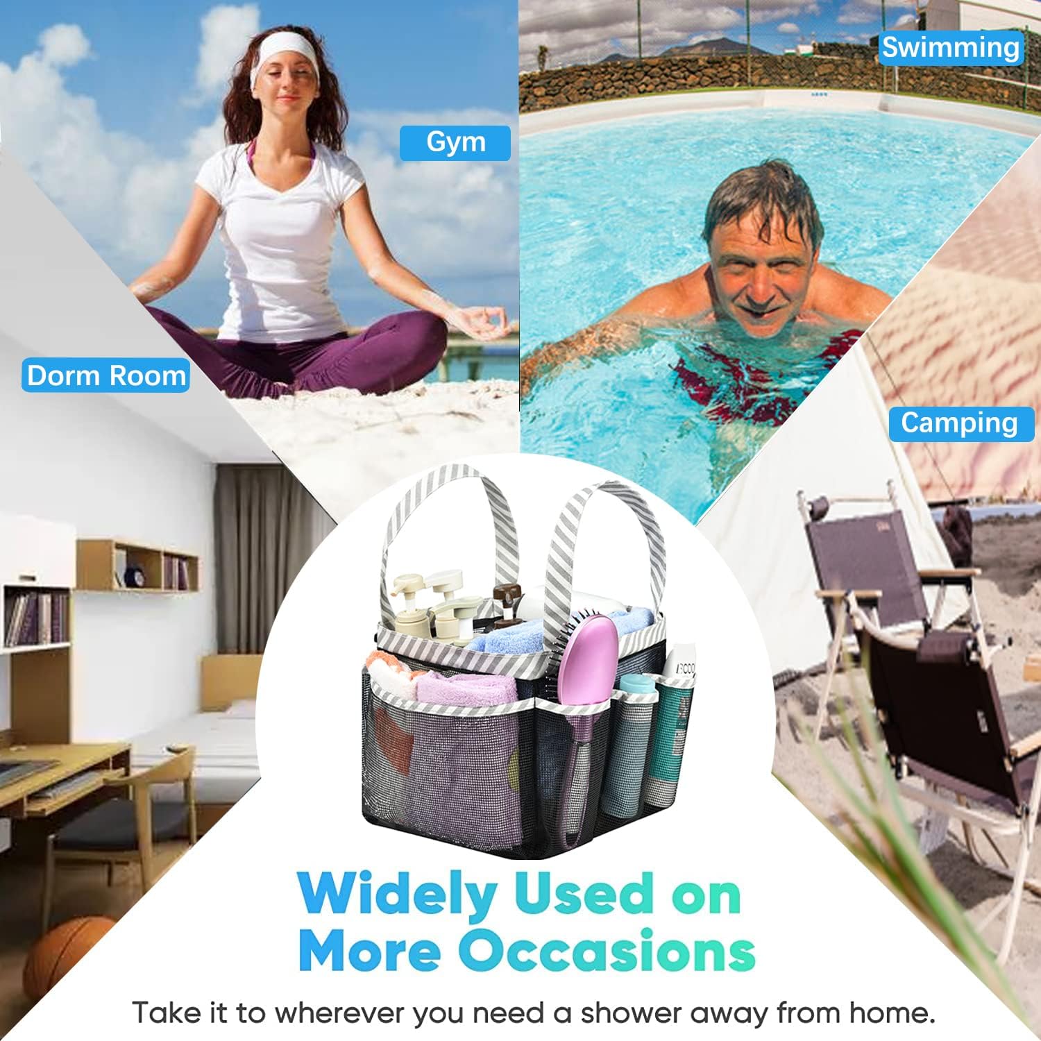 • Portable bathroom tote. Hanging shower tote caddy over the door, showerhead or put it on a shower stand in the corner. Perfect college dorm shower caddy for camp, travel, gym, swimming.