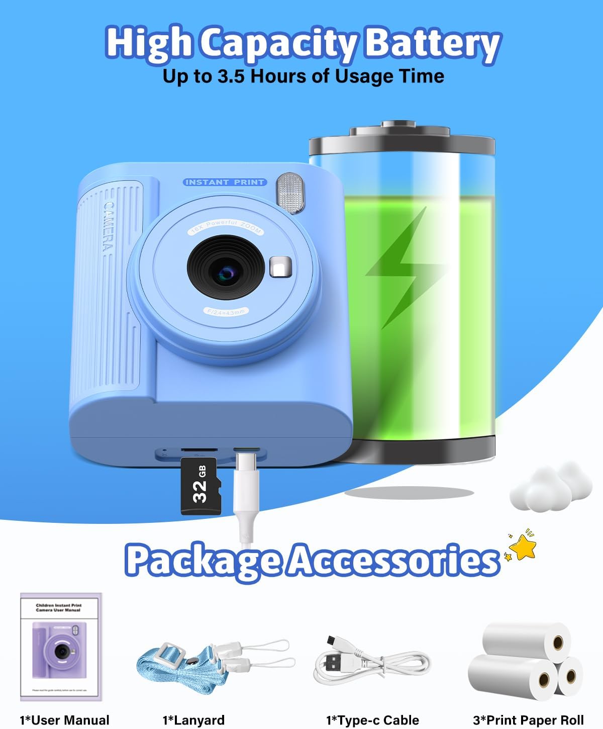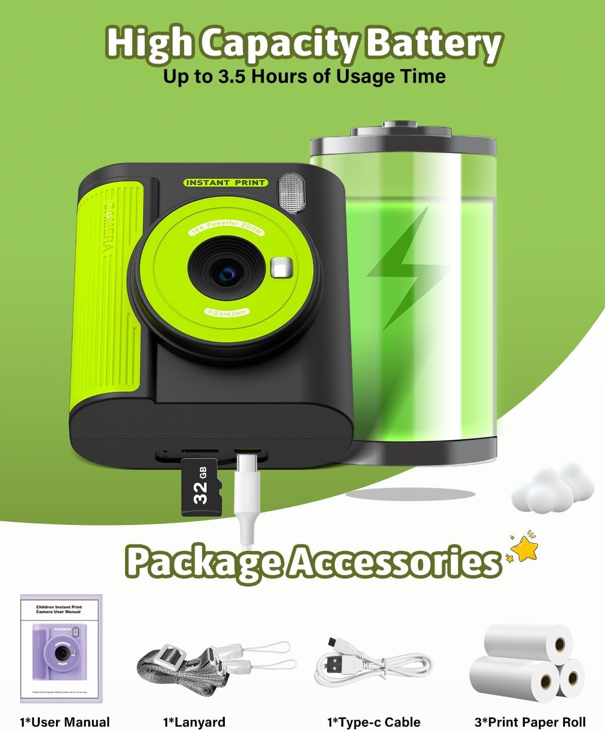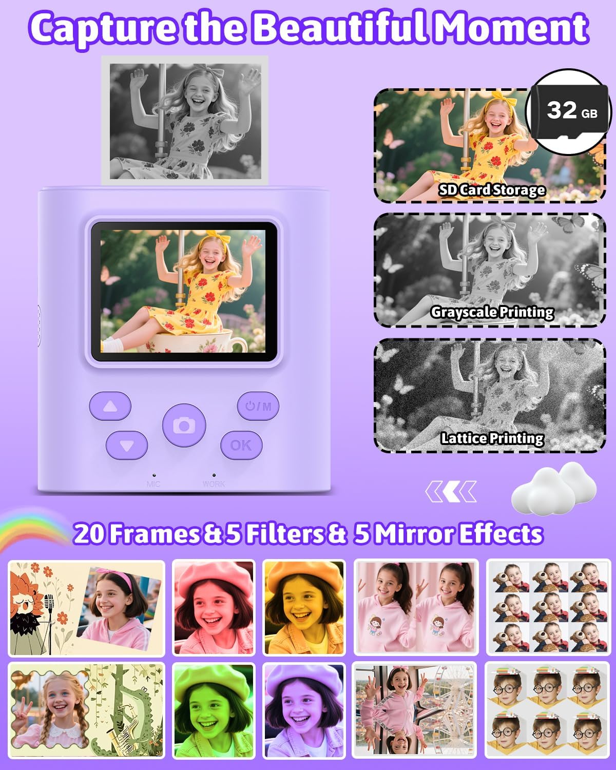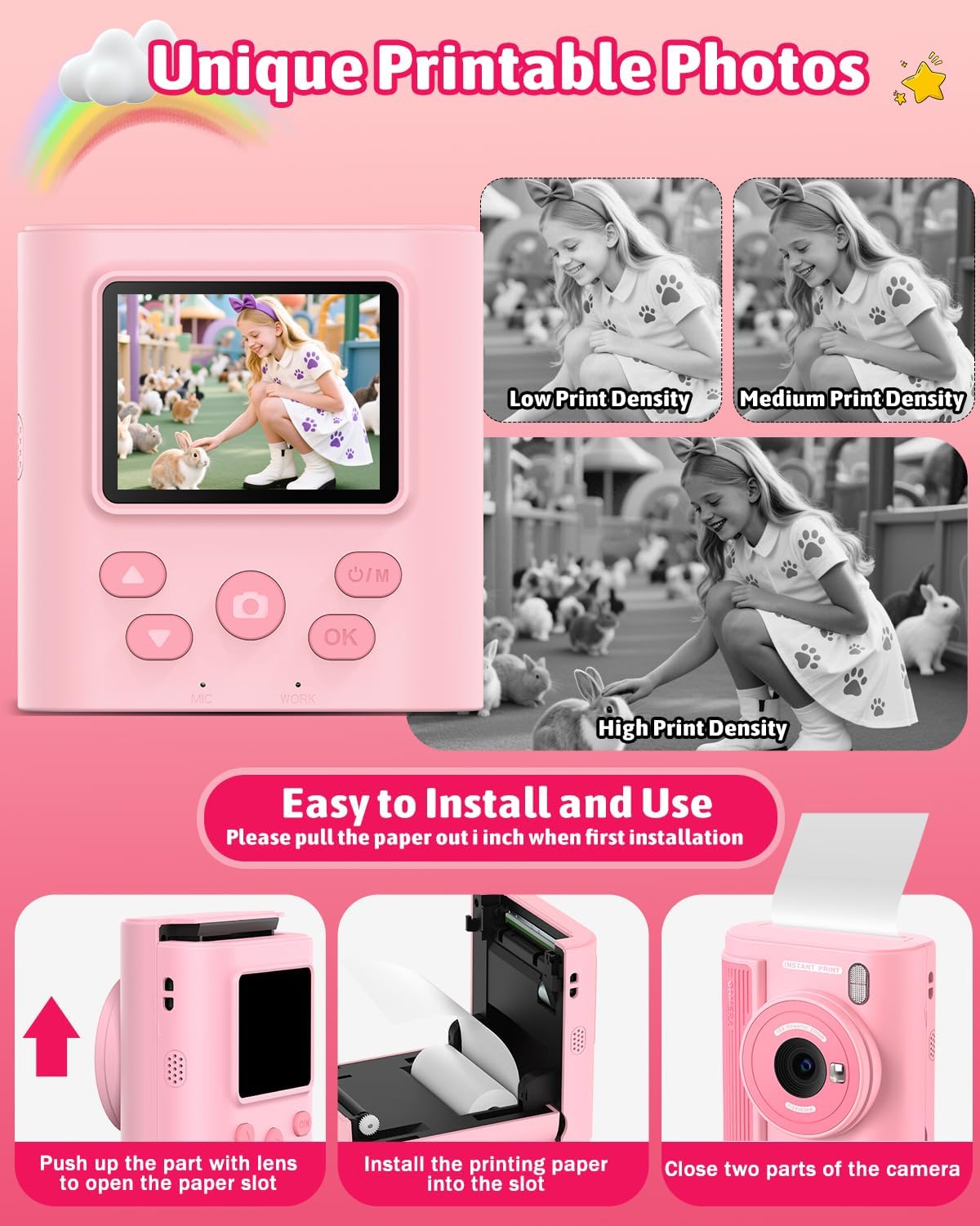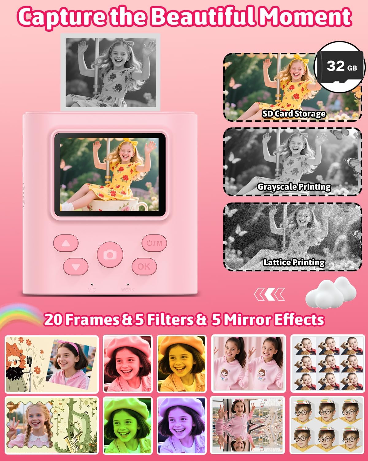 •  Instant Print and Safe Thermal Technology: Capture memories and print them instantly using ink-free, child-safe thermal printing—no messy ink cartridges or harmful materials. Prints high-quality B&W photos in seconds, perfect for creative projects and keepsakes.