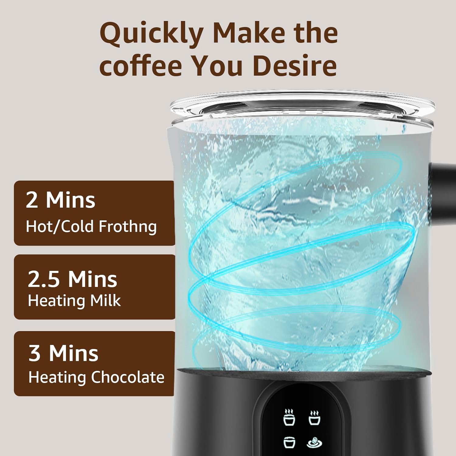 4-in-1 Multifunctional Design: Whether you're a coffee novice or an experienced barista, you can easily use our milk frother to heat up milk, create dense hot foam, cold foam, or delicious hot chocolate milk all with one button. Enjoy the perfect blend of coffee and milk at home