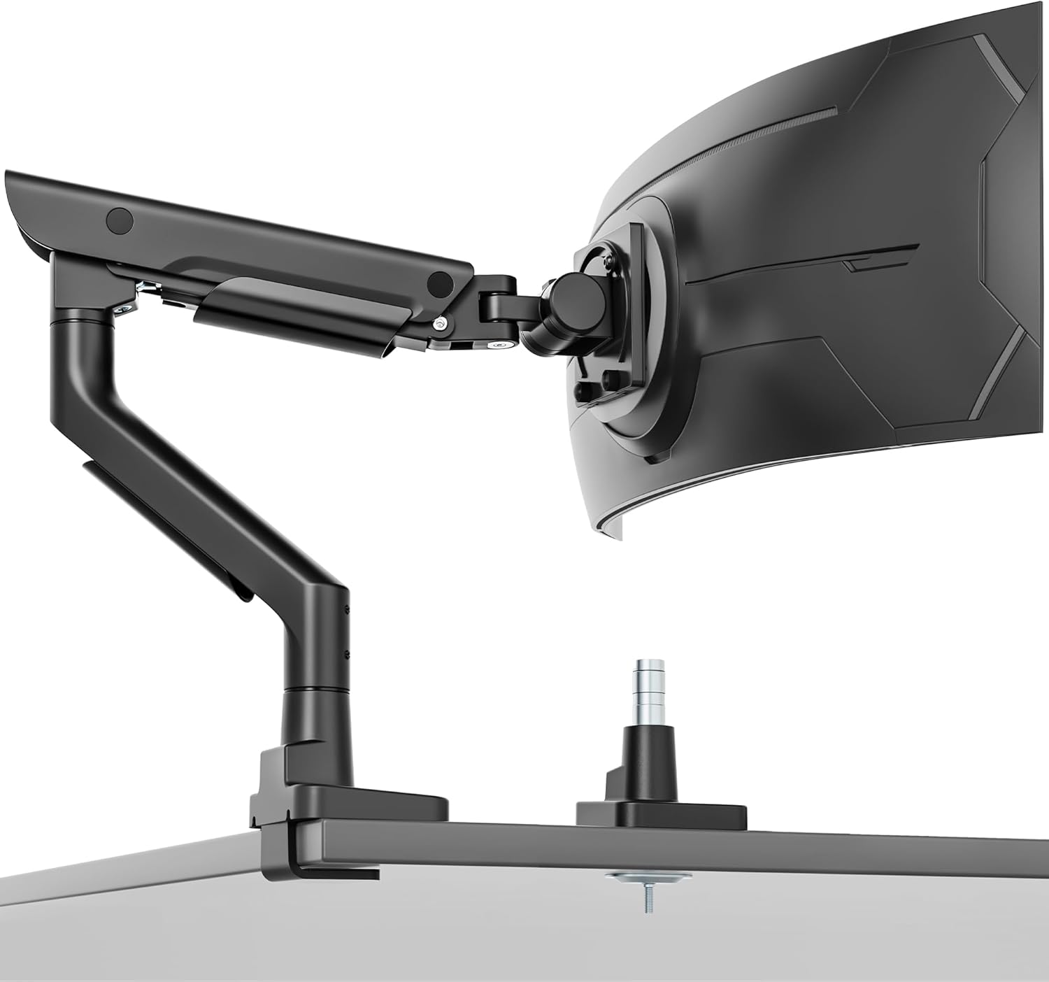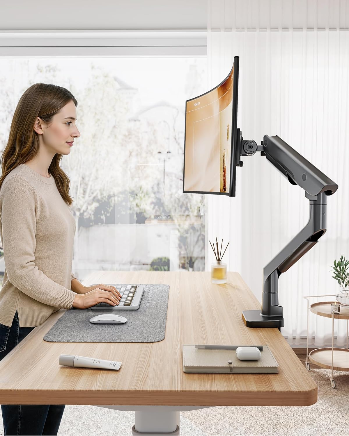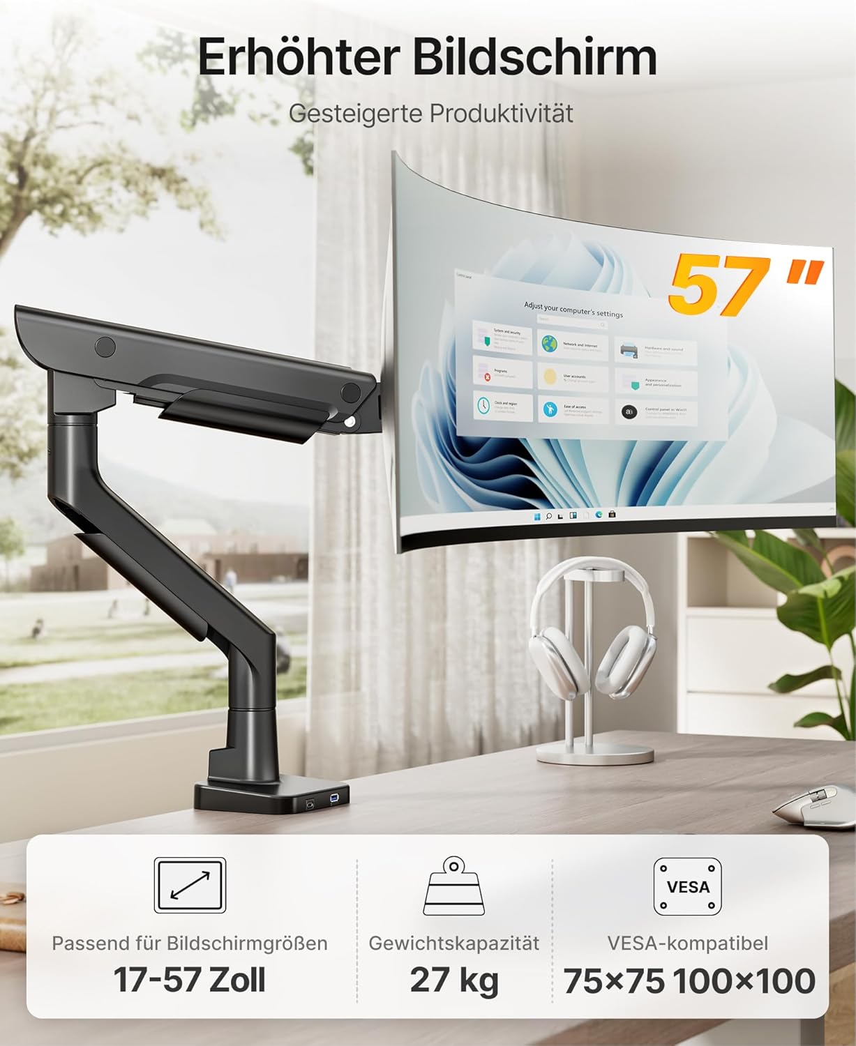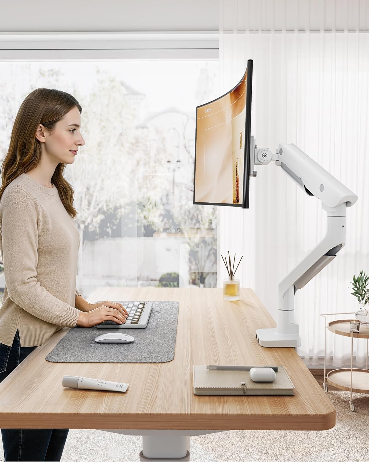 - 【Ultra-Stable Support up to 59.4 lbs & 57” Displays】Supports monitors from 17" to 57" and up to 59.4 lbs, including ultrawide and curved displays. Compatible with both 75x75mm and 100x100mm VESA mounting patterns, this arm ensures a rock-solid hold and flexible adjustment for even the largest screens in your setup.