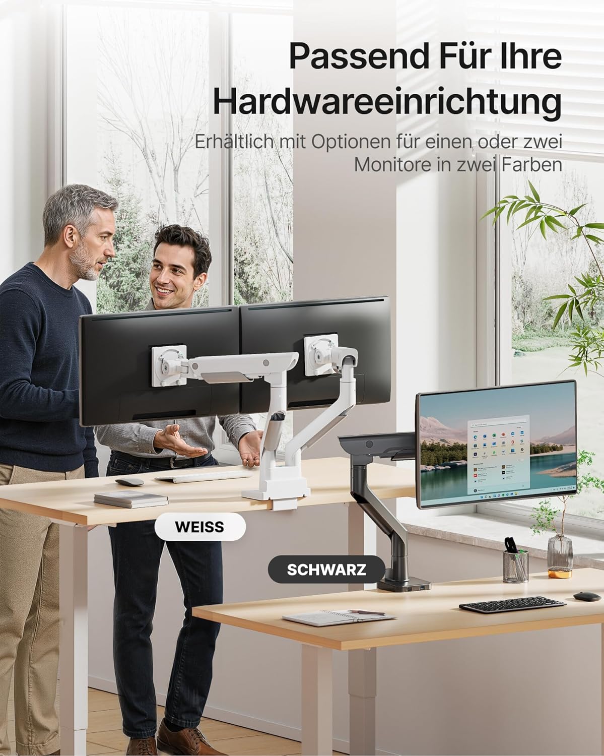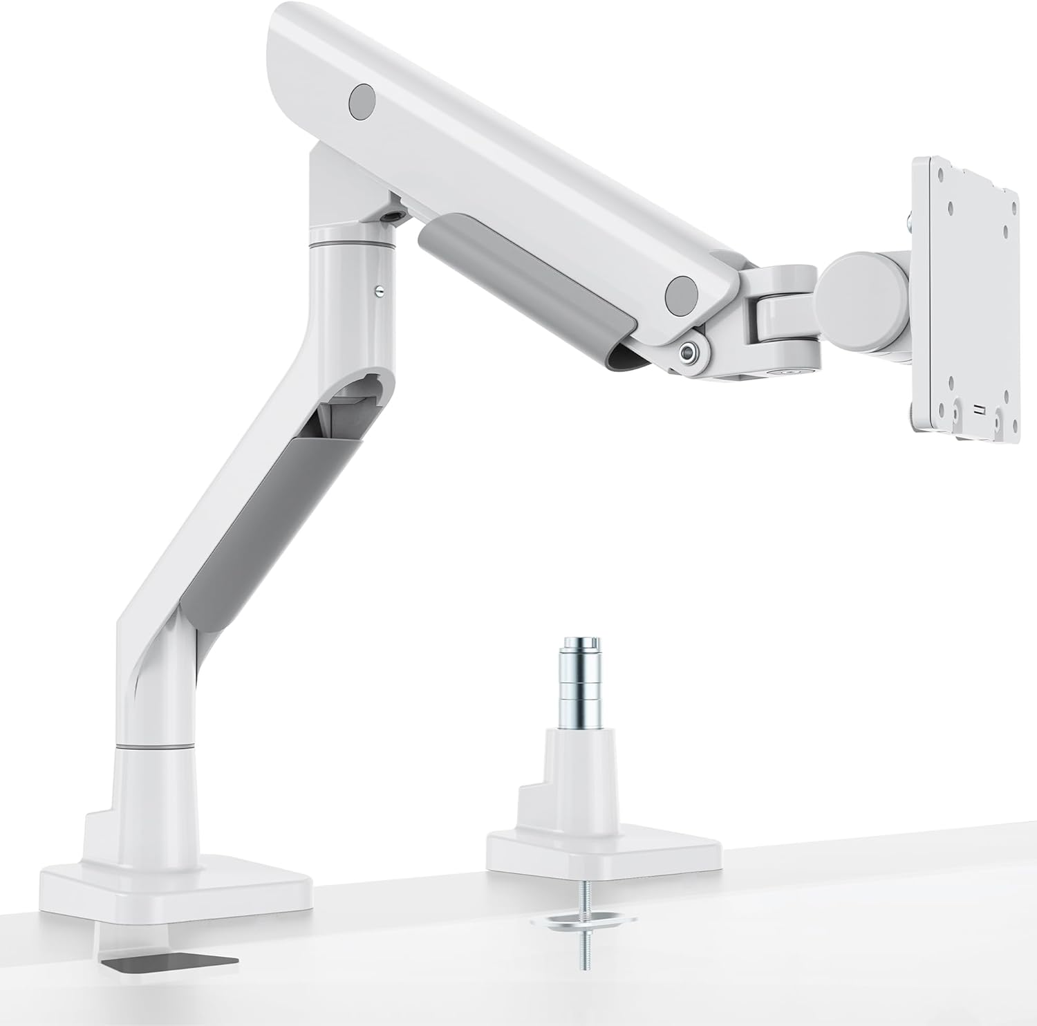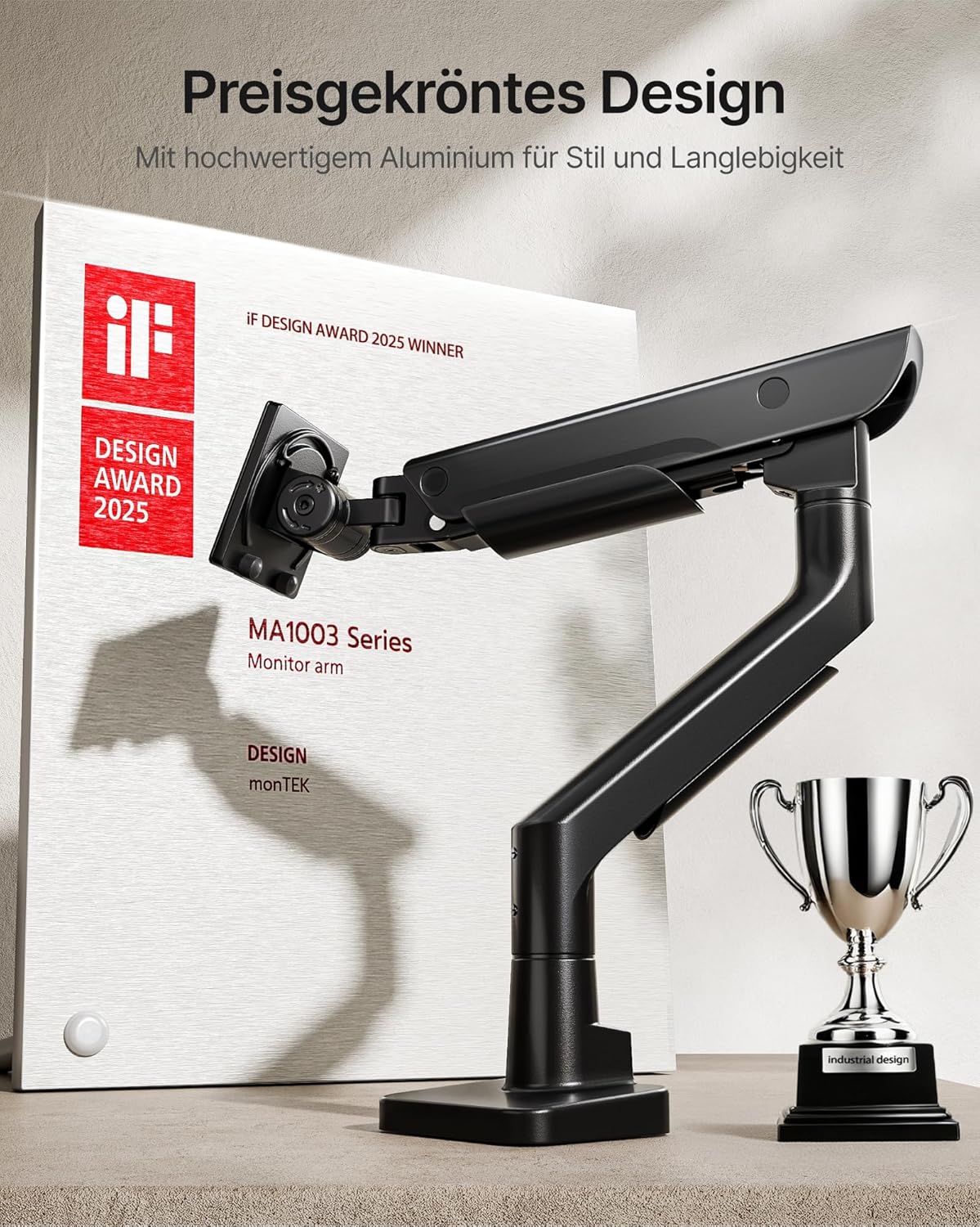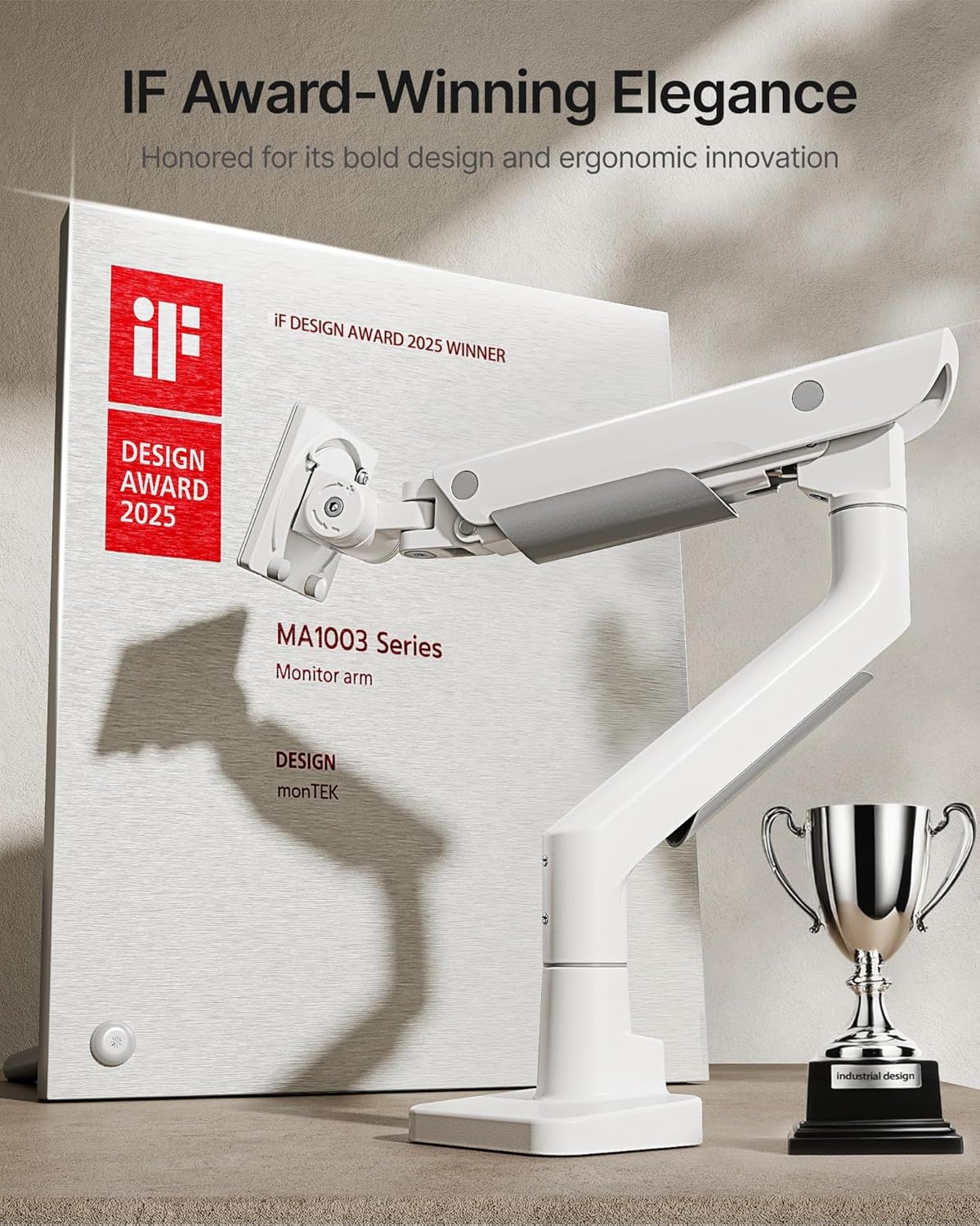 - 【Award-Winning Design & Premium Aluminum Build】Crafted from high-grade aluminum and honored with an iF Design Award, this monitor arm blends exceptional durability with refined aesthetics. The hidden gas spring tension port ensures a sleek look while enabling long-term strength and performance.