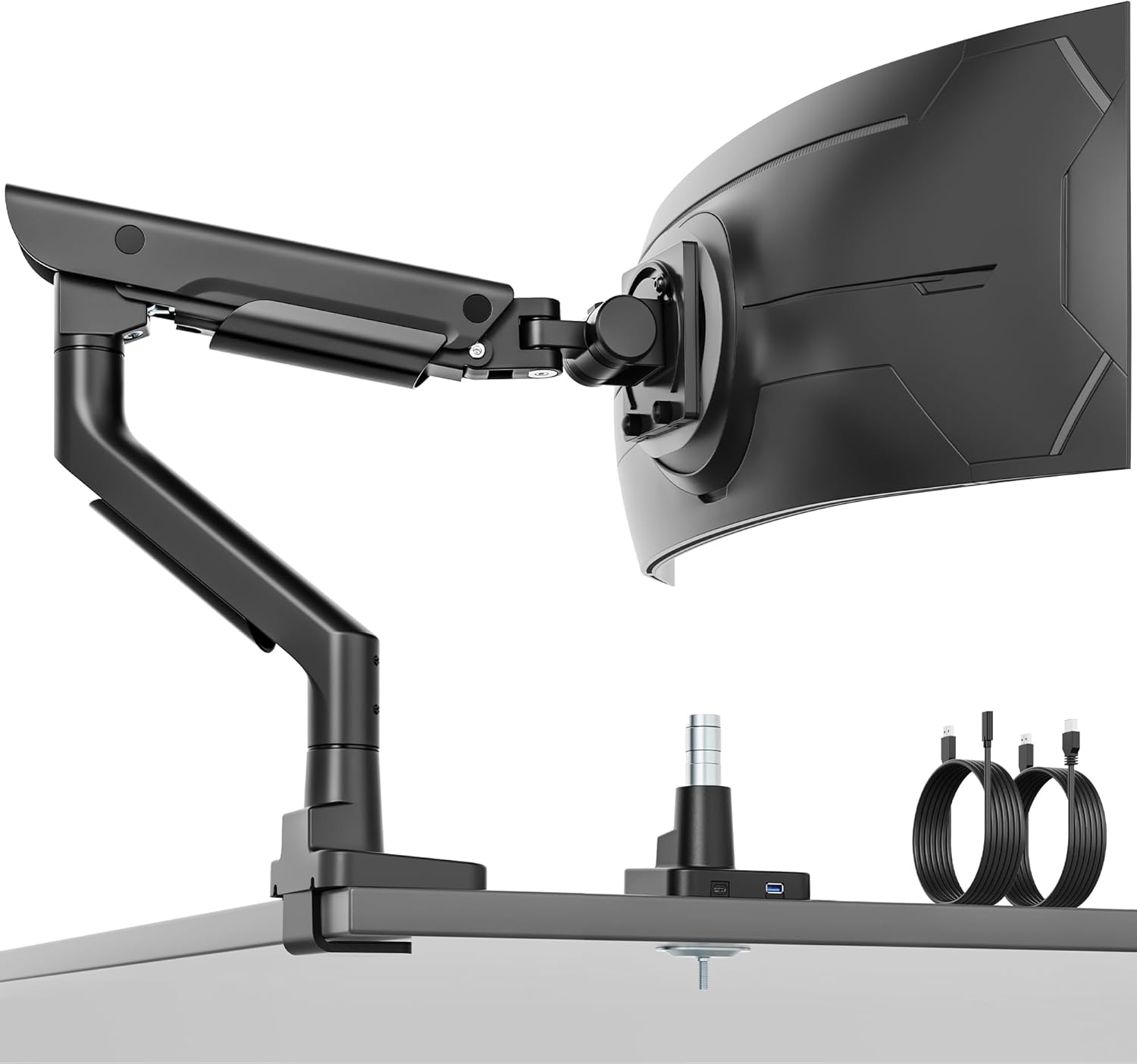 monTEK Premium Aluminum Monitor Arm for 17–57” Ultrawide Screens up to 59 lbs, USB 3.0 Single Desk Mount with Adjustable Gas Spring, Quick-Release Plate, 10-Min Assembly, Clamp/Grommet, VESA 100x100
