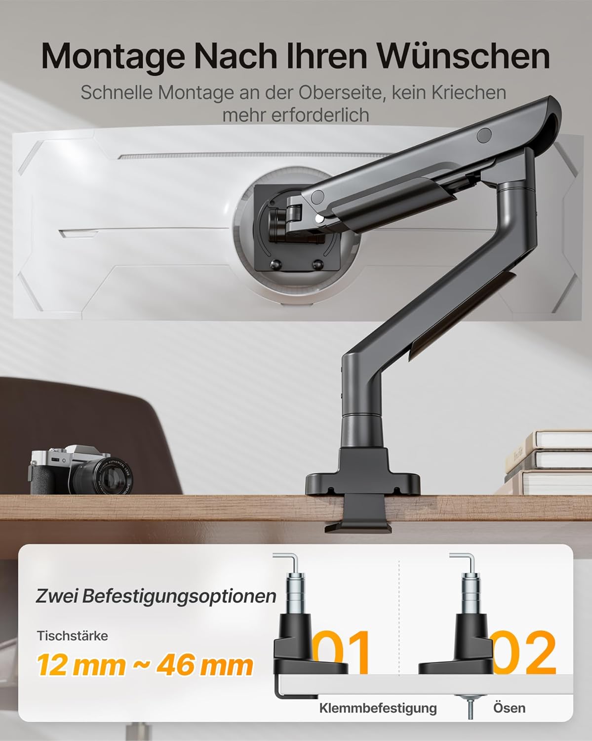 - 【Quick 10-Min Assembly – No Crawling Under Desk】Install in just 10 minutes using the topside-mounted C-clamp or grommet—no need to reach under your desk. Features a tool-free quick-release VESA plate and detachable arm joint for a streamlined setup. Fits desks from 0.47" to 1.8" thick.