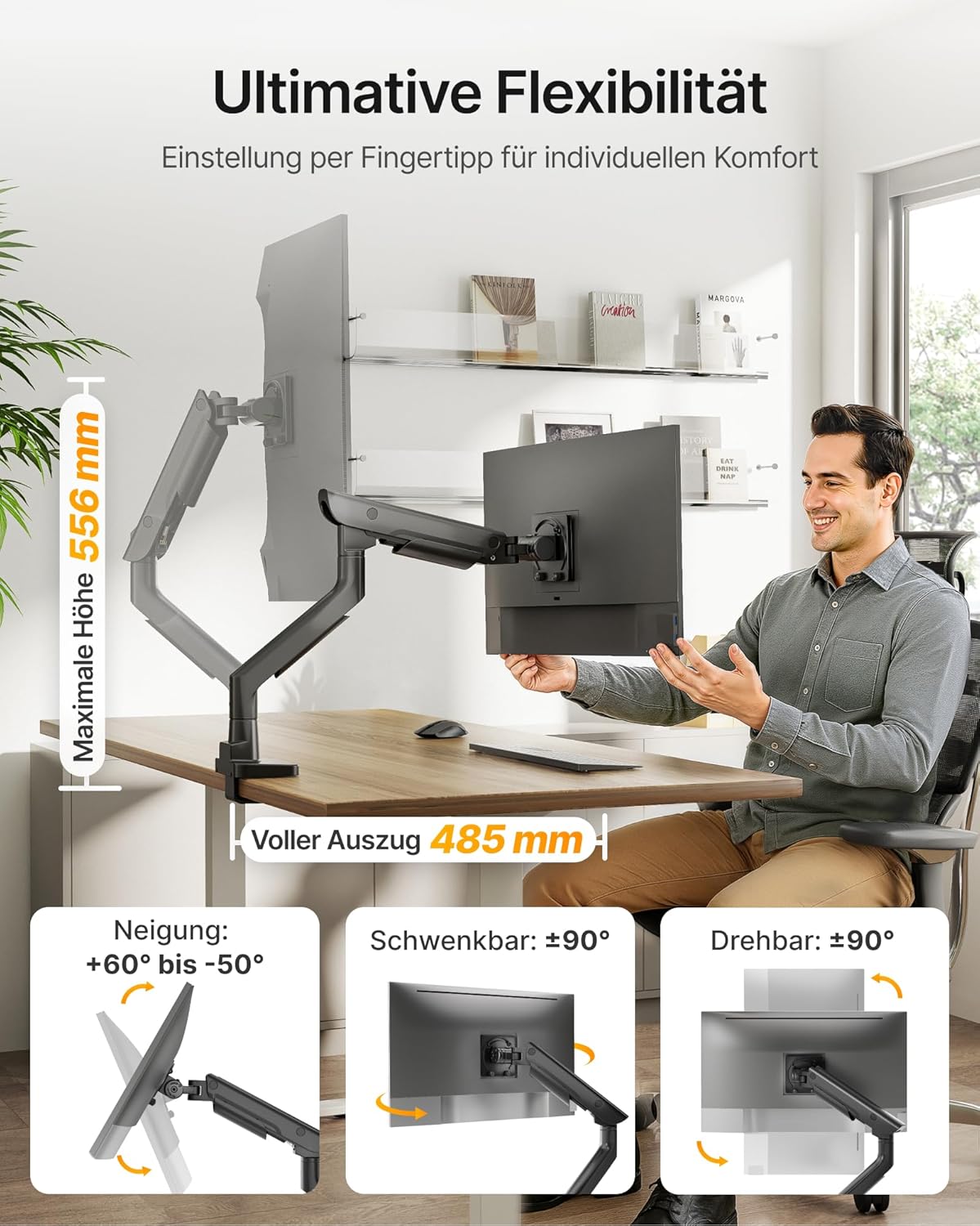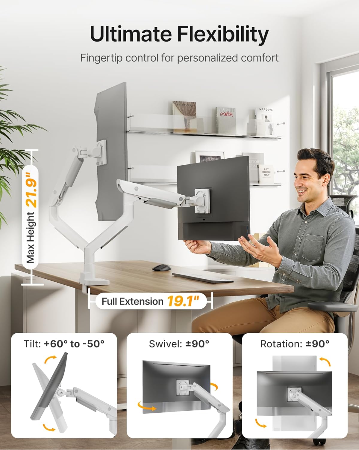 - 【Ultra-Wide Flexible Adjustment】Enjoy effortless ergonomic tuning with tilt from +60° to -50°, ±90° swivel, and ±90° rotation. The upgraded one-way bearing head structure enables smoother motion and precise control. Extend the arm up to 19.1” or lift it to a max height of 21.9” with ease.