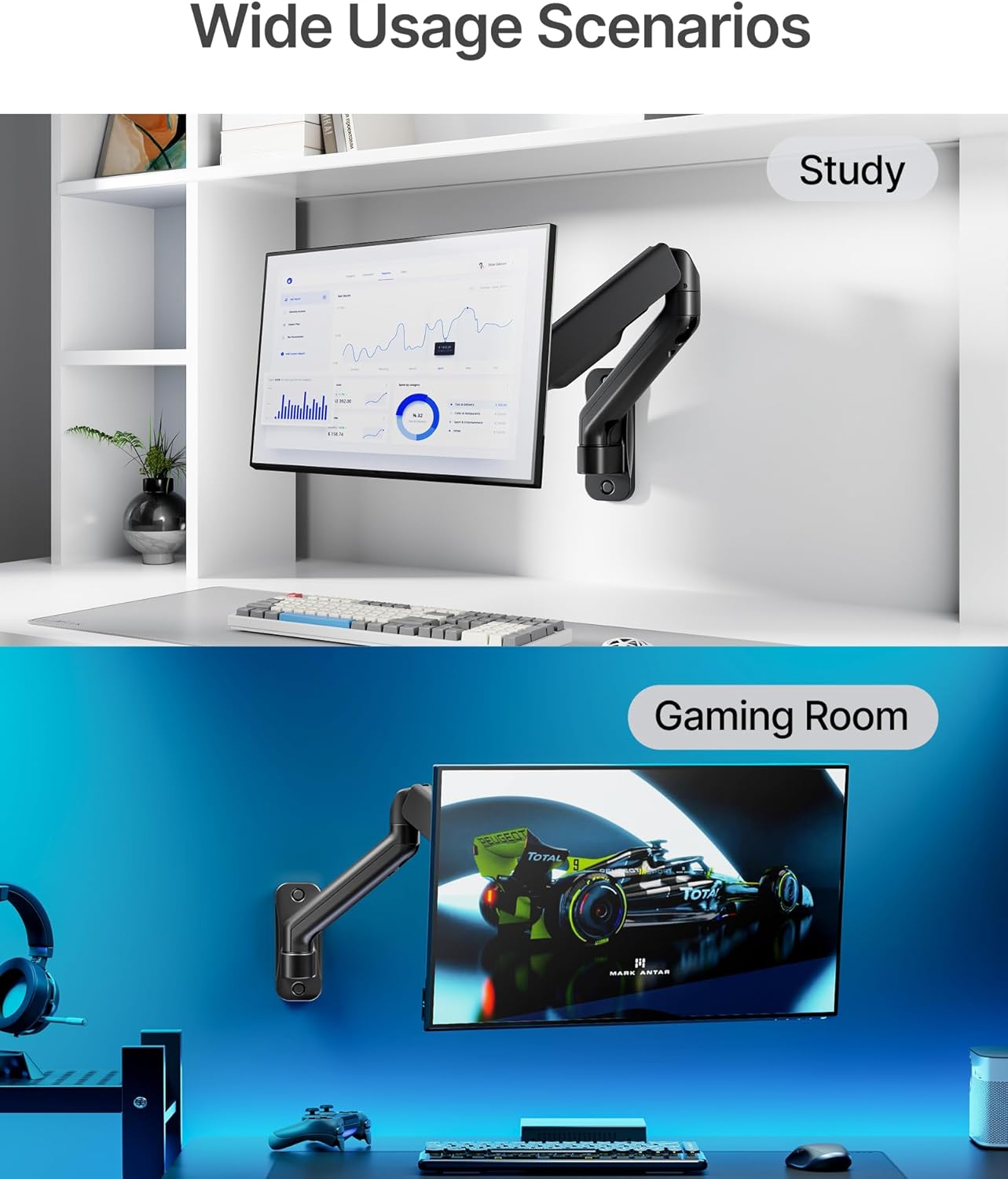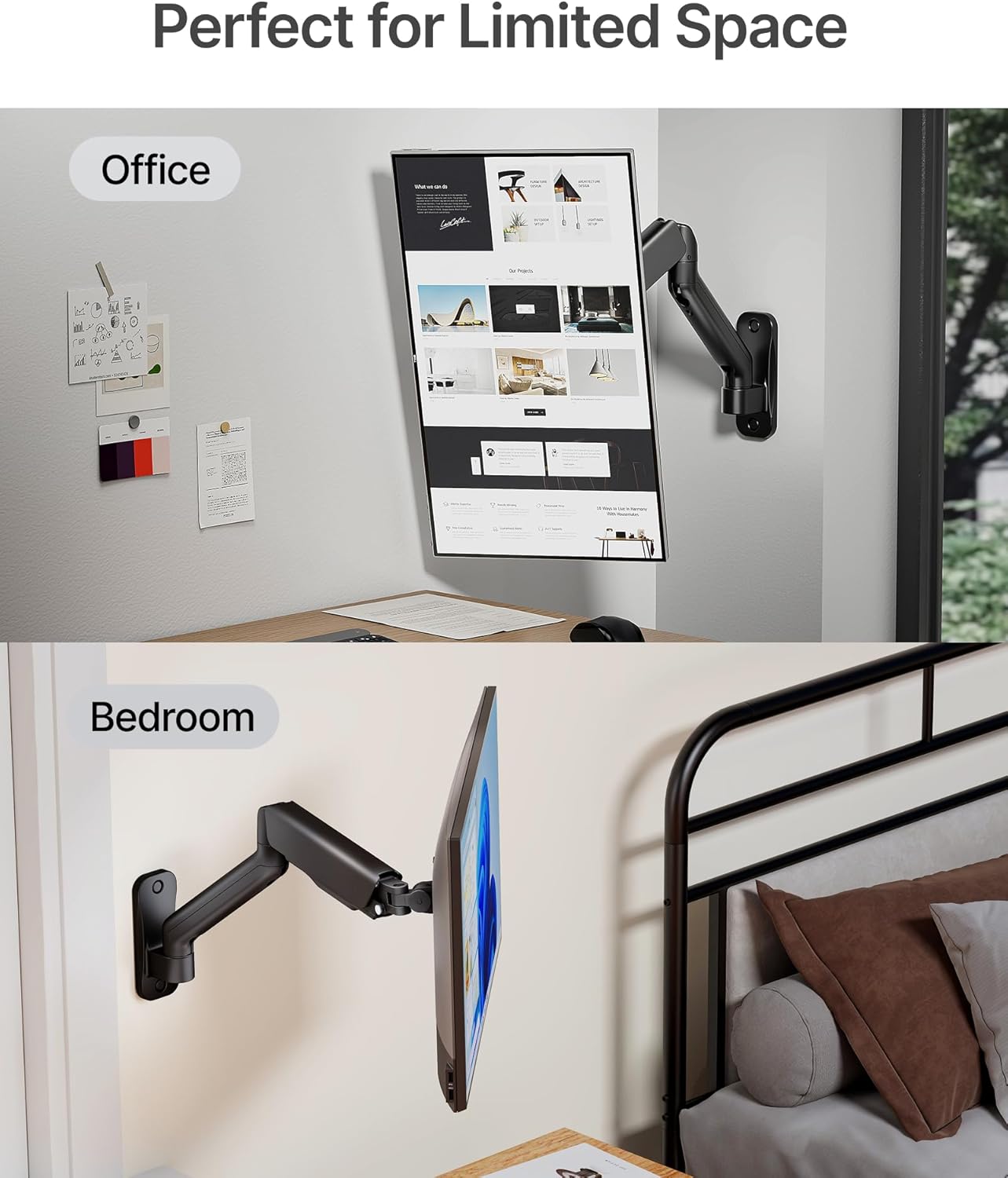 - 【Maximize Your Desk Space】Mount your monitor to the wall and instantly free up your valuable desk space. The monitor mount has a classic look that fits in any environment, while the integrated cable management system keeps wires organized and your workspace neat and tidy. Whether you're working, watching TV, monitoring or live streaming, this monitor wall mount brings both style and functionality to your setup
