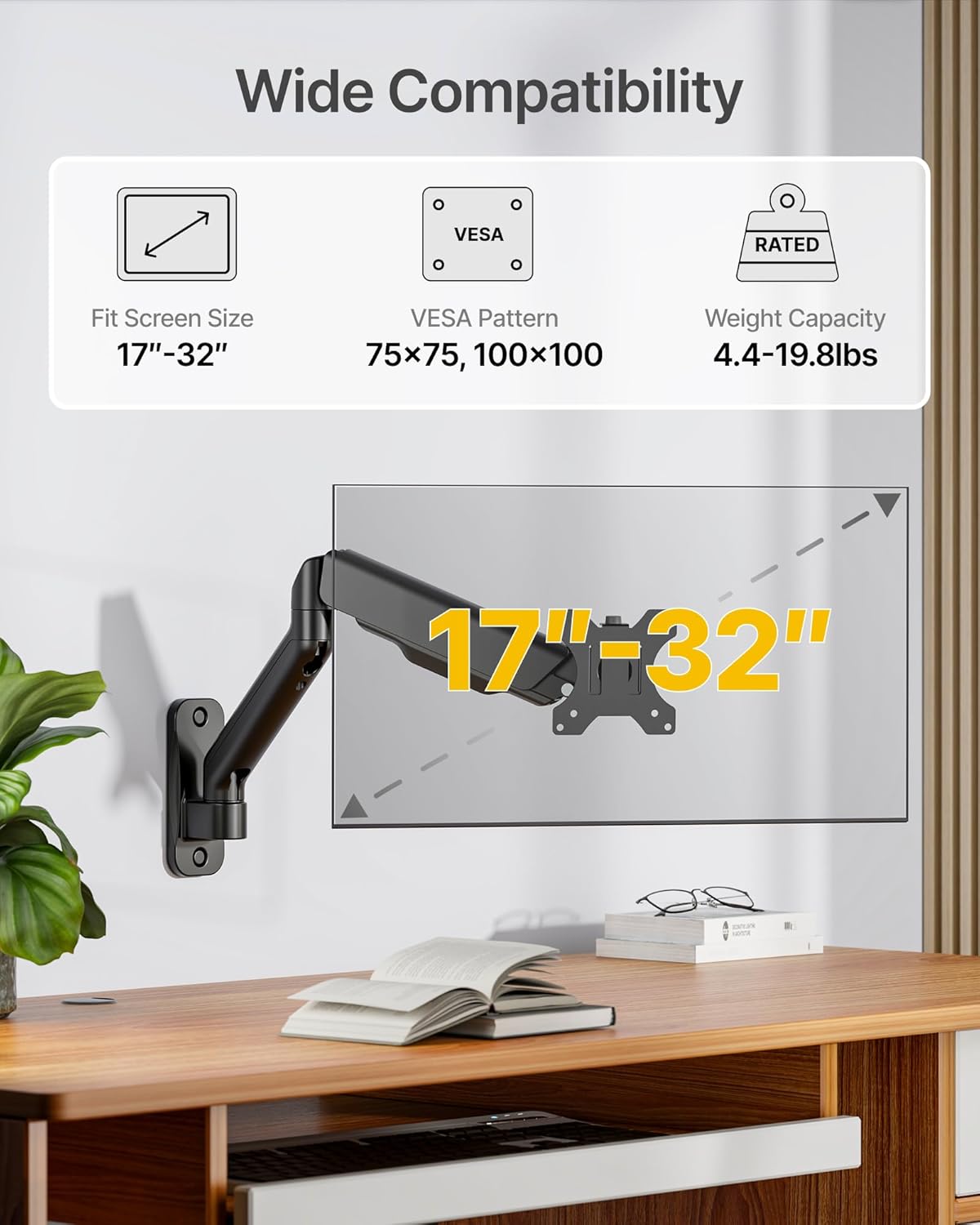 monTEK Single Monitor Wall Mount for 17 to 32 inch Flat/Curved Screens, Holds to 19.8 lbs, Full Motion Adjustable Mechanical Spring Monitor Arm, 75x75/100x100 VESA Wall Mount, Black