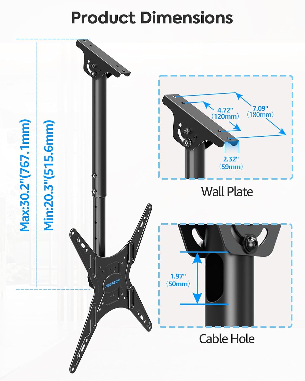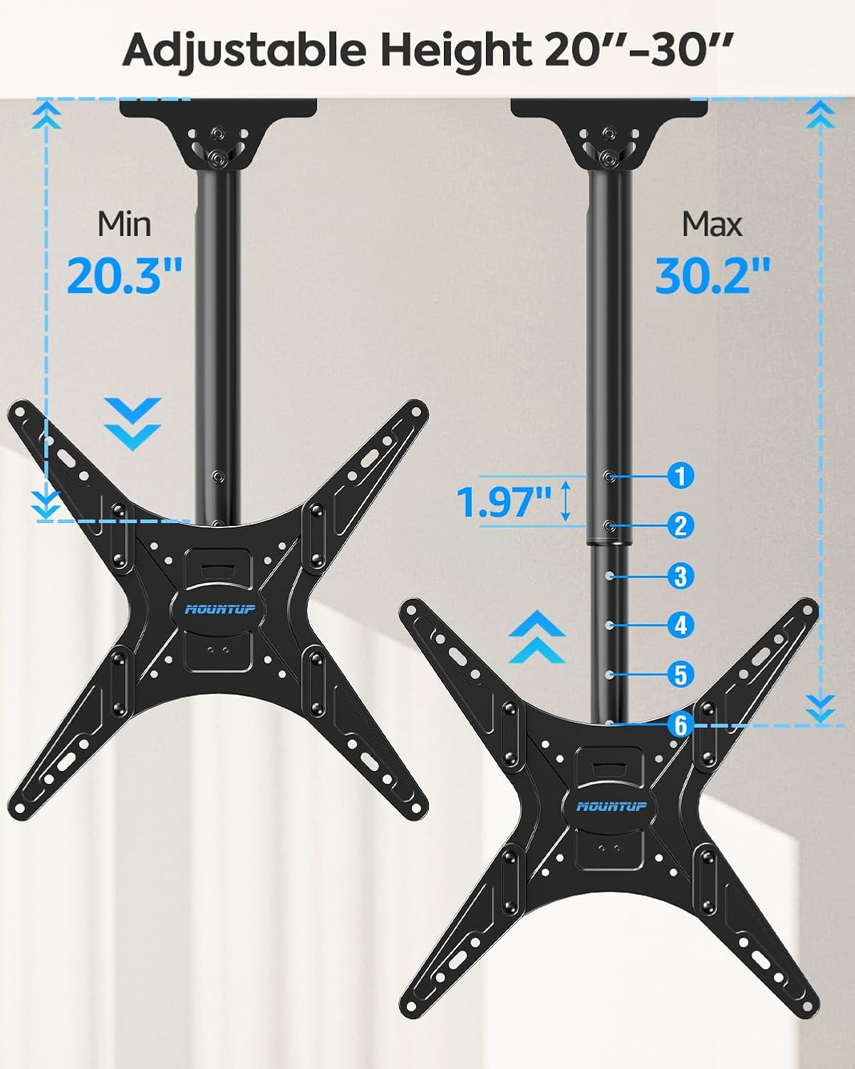 • FULL MOTION FLEXIBILITY: +/-3°post-installation adjustment for perfect TV leveling, +5°/-15° tilt for anti-glaring, and 360° swivel to provide better viewing angles, up to 120° of swivel at the base fits for flat or slanted ceilings and 20.33” to 30.18” pole height adjustment for flexible movement and space-saving