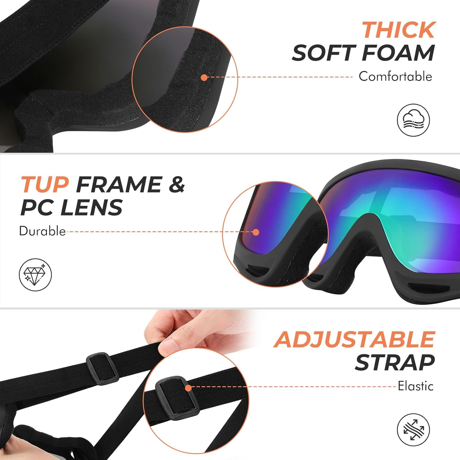- WIDE APPLICATION --- 3 pack Motorcycle Ski Goggles Set comes with 1pcs black clear glass, 1pcs black colored glass and 1pcs white colored glass, which is suitable for teens, youths, adults and kids on costume party or outdoor activities including motorcycle, motocross, dirt bike, mountain bike, off-road protective combat, snow skiing, kite surfing, jet skiing, air-soft, paintball, snowboarding, climbing, skydiving, bungee jumping, playing shooting games.