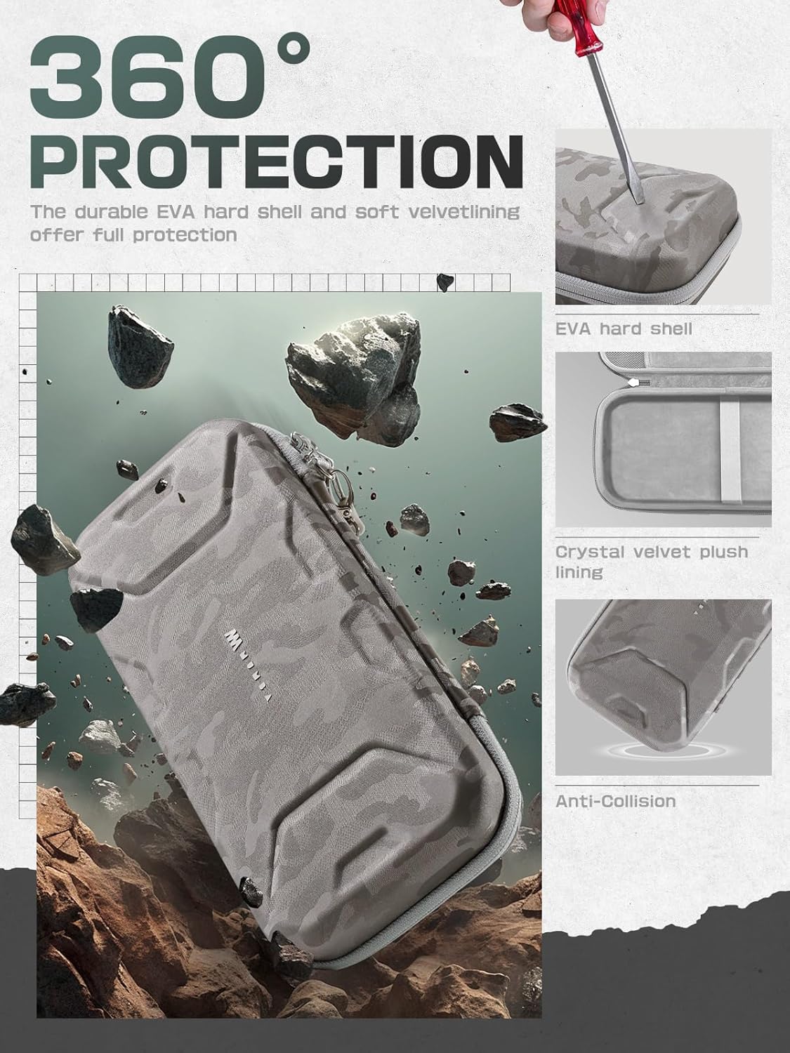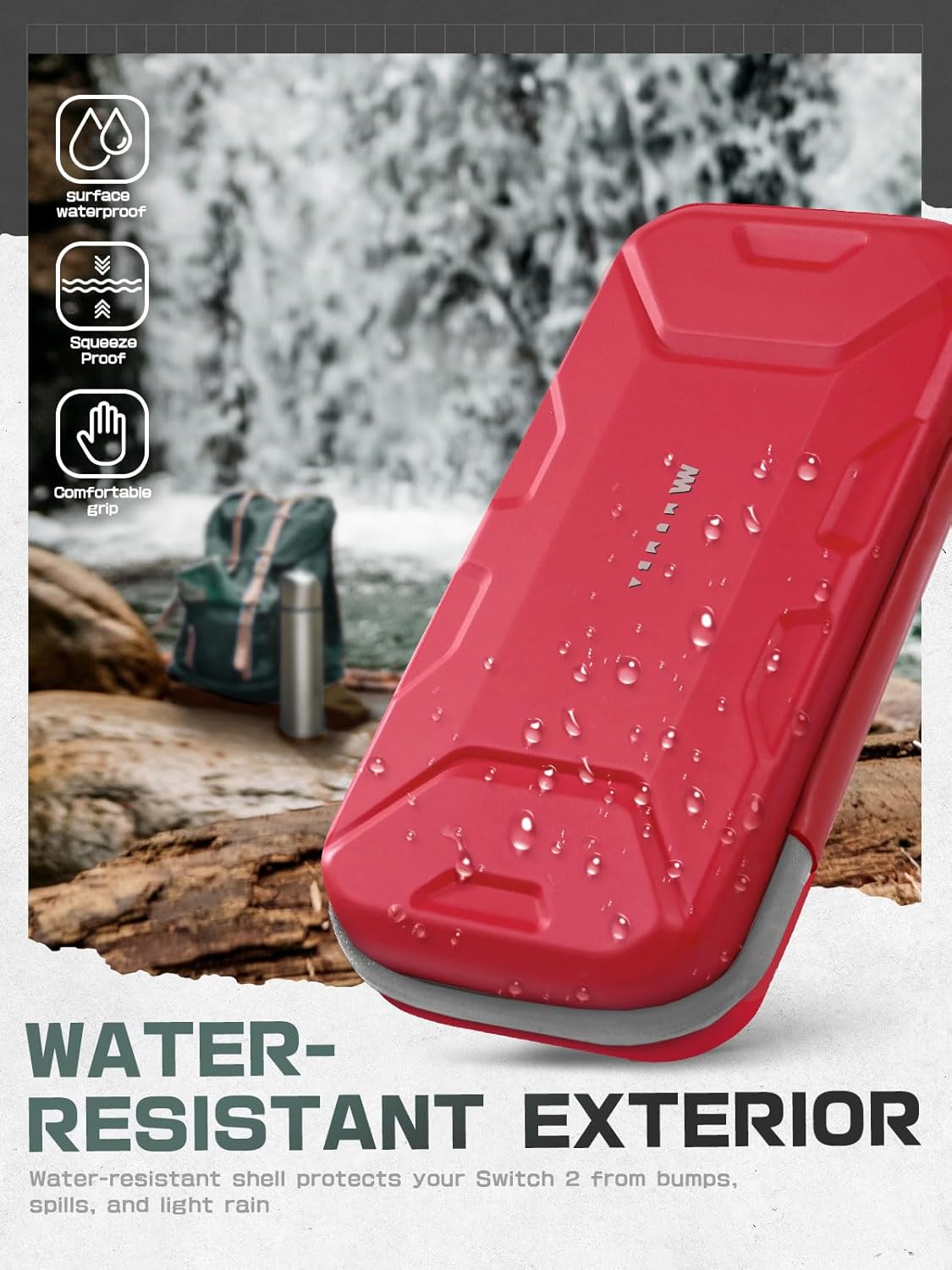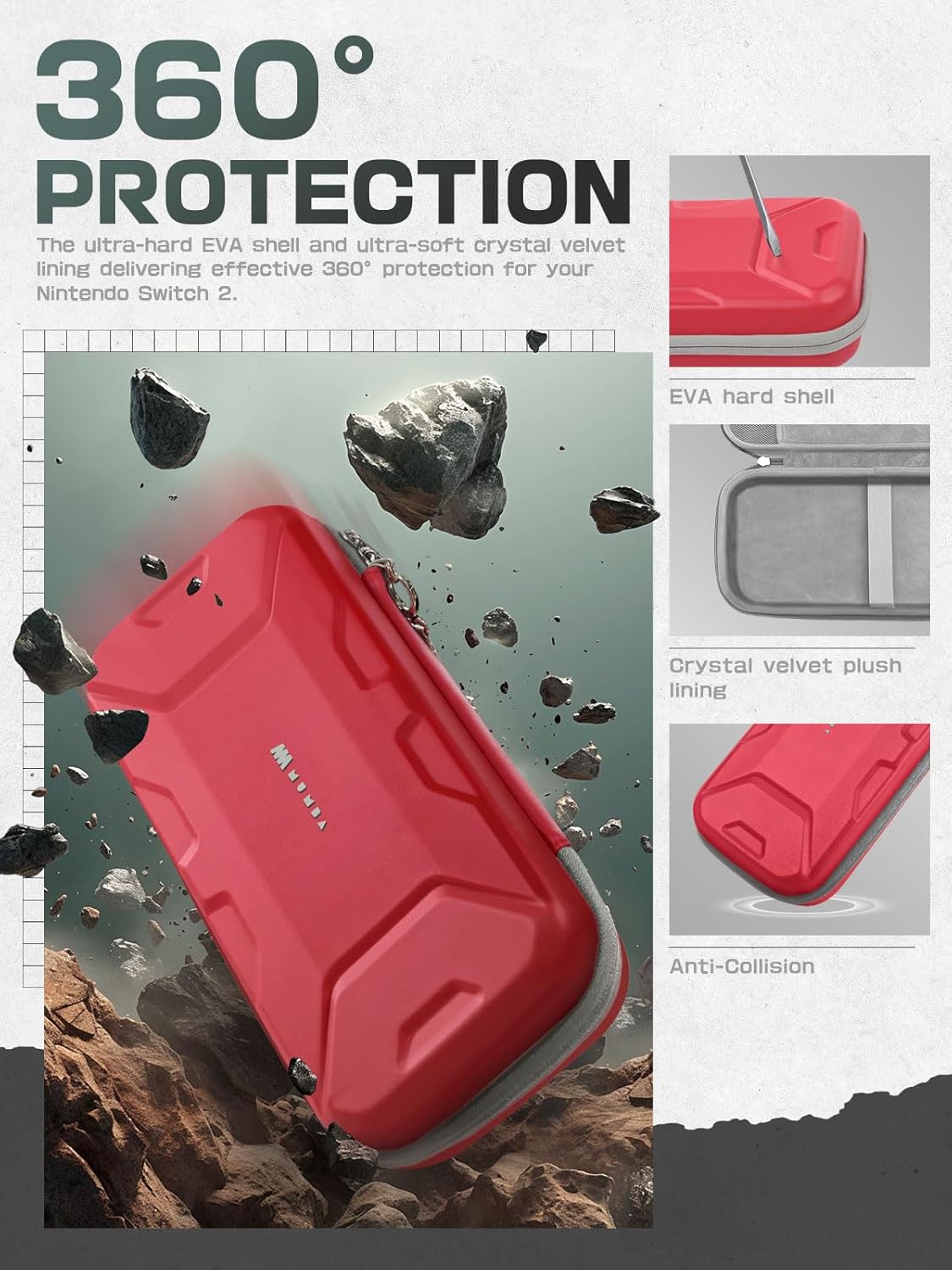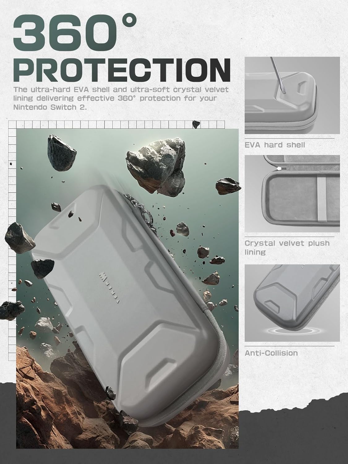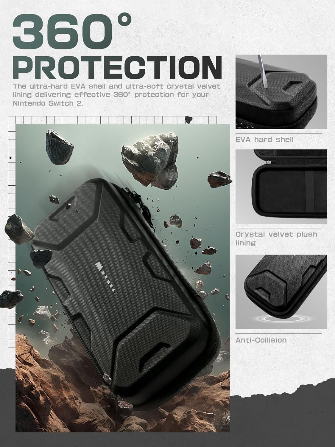 • EVA Hard Shell+Plush Crystal Velvet Interior: The exterior is made of an ultra-hard EVA shell, providing pressure resistance, drop protection, and waterproof surface to prevent damage to the Switch 2 from falls or water exposure. The interior features ultra-soft crystal velvet lining to prevent scratches on the console body and screen, delivering effective 360° protection for your device.