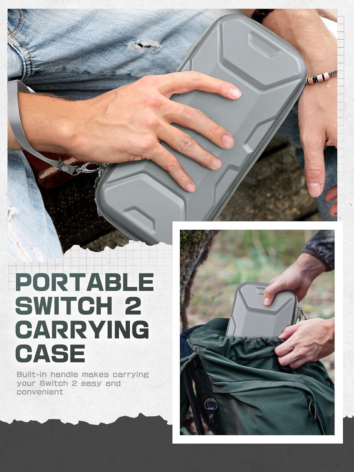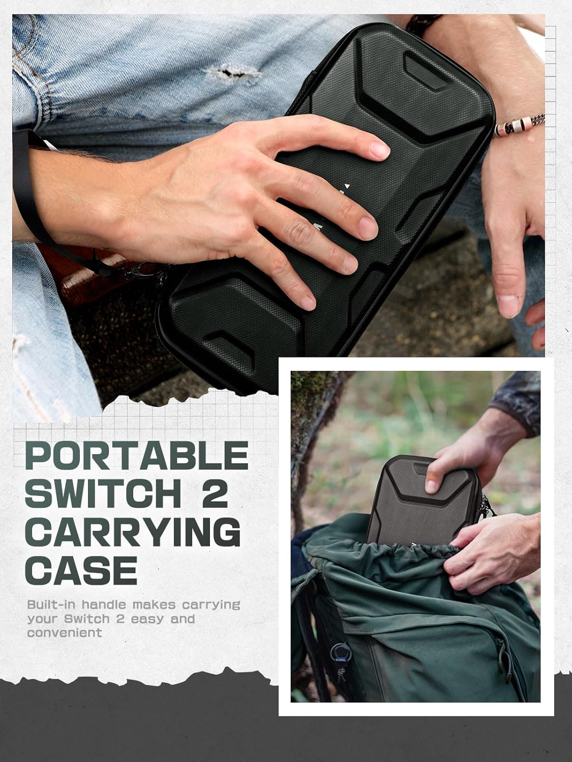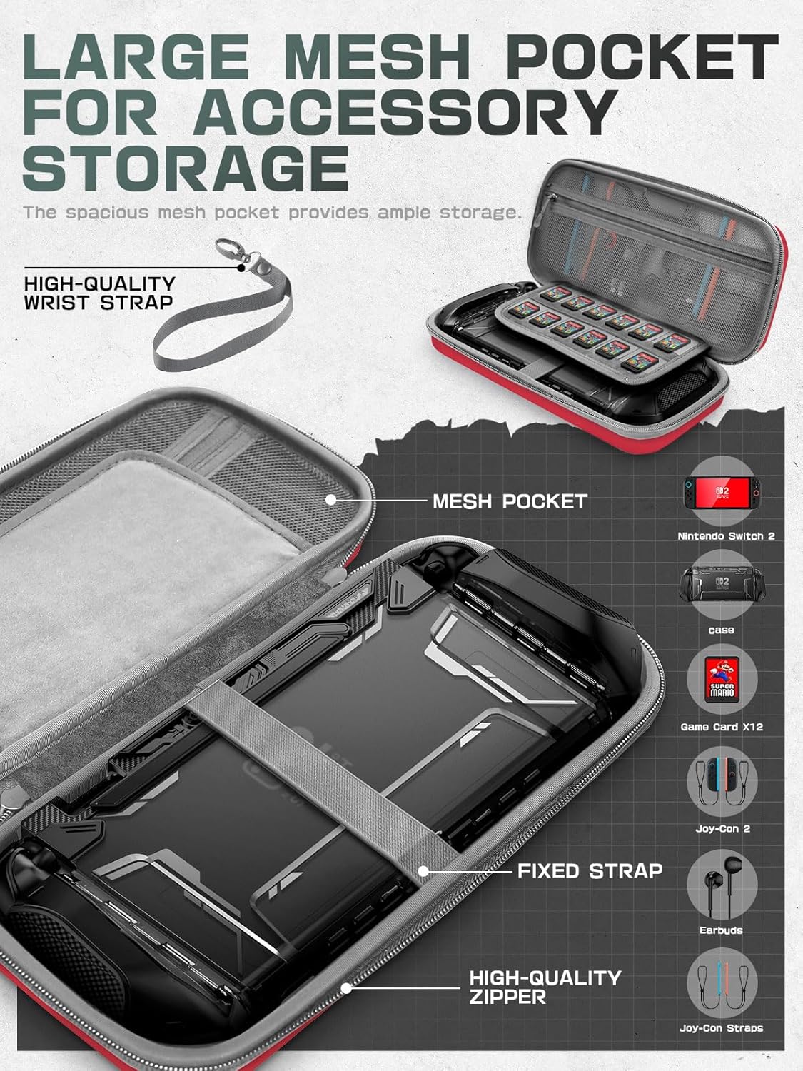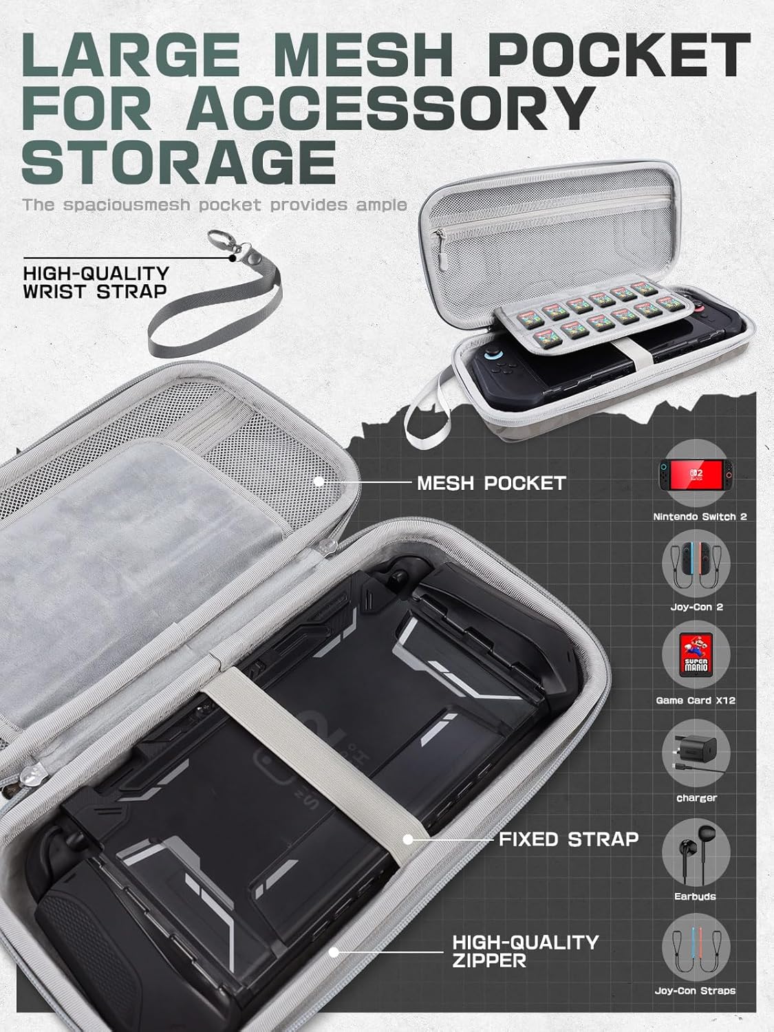 • Maximum storage capacity: Fits for Nintendo Switch 2, features a large storage compartment for the Joy-Cons, cables, and up to 10 game cartridges. The interior mesh pocket keeps accessories neat and easily accessible.