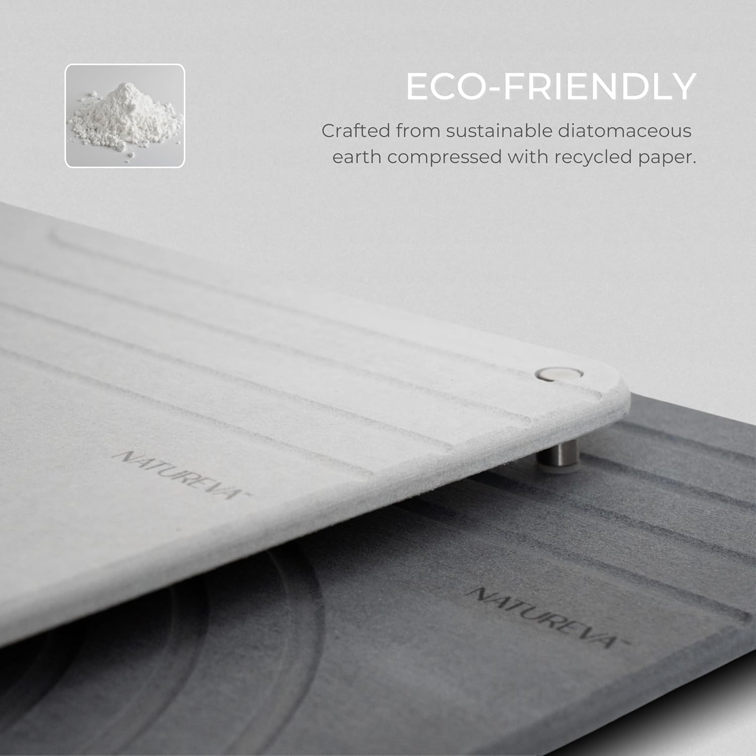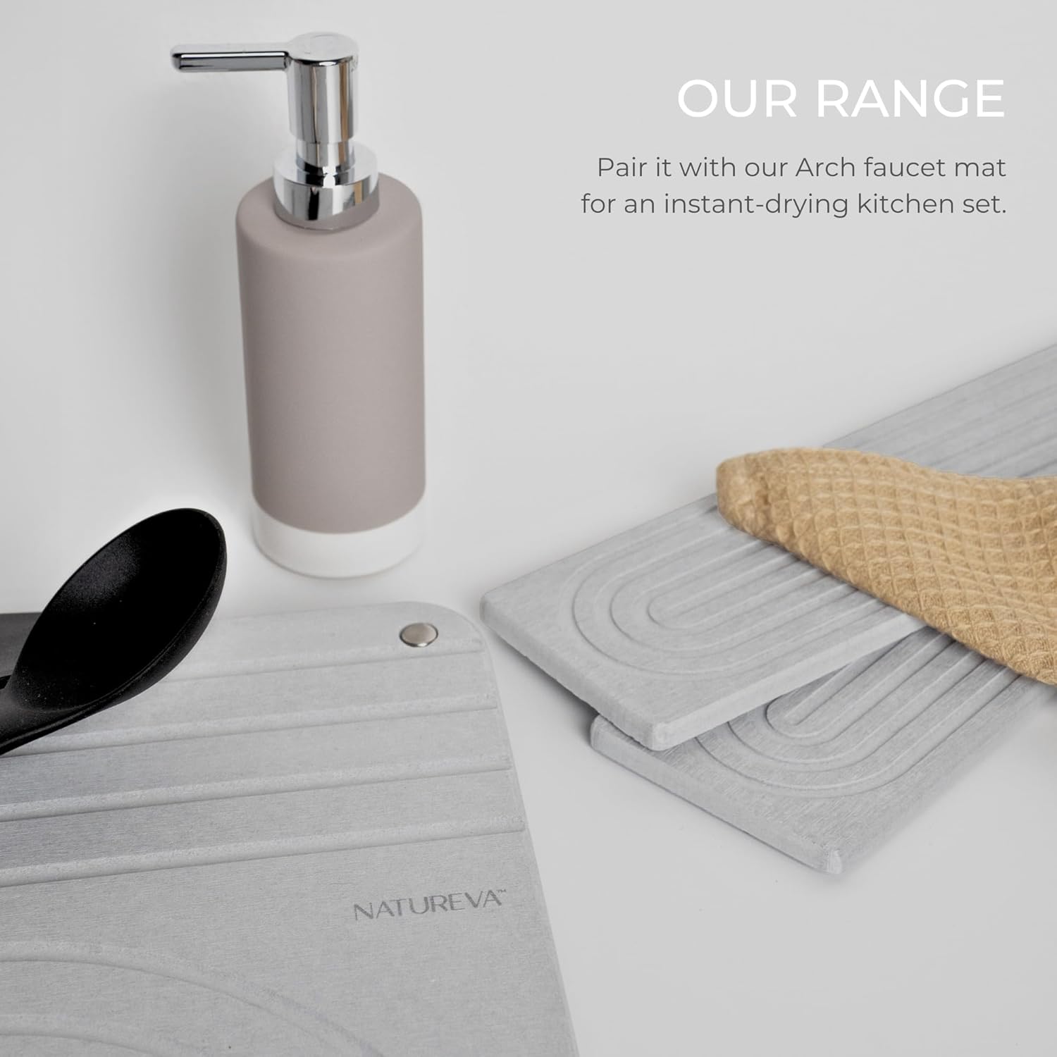 • ECO-FRIENDLY MATERIAL - Crafted from Natureva all-natural combination of diatomaceous earth and recycled paper, this quick drying stone dish mat is sure to elevate your kitchen's style. Get your own today and start enjoying the luxurious eco-chic touch of our stone mat for dishes!
