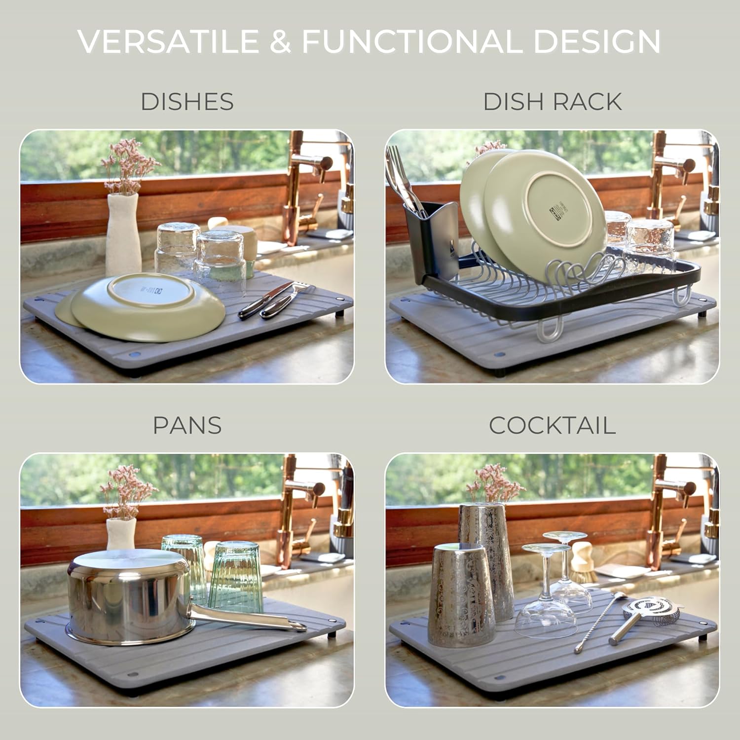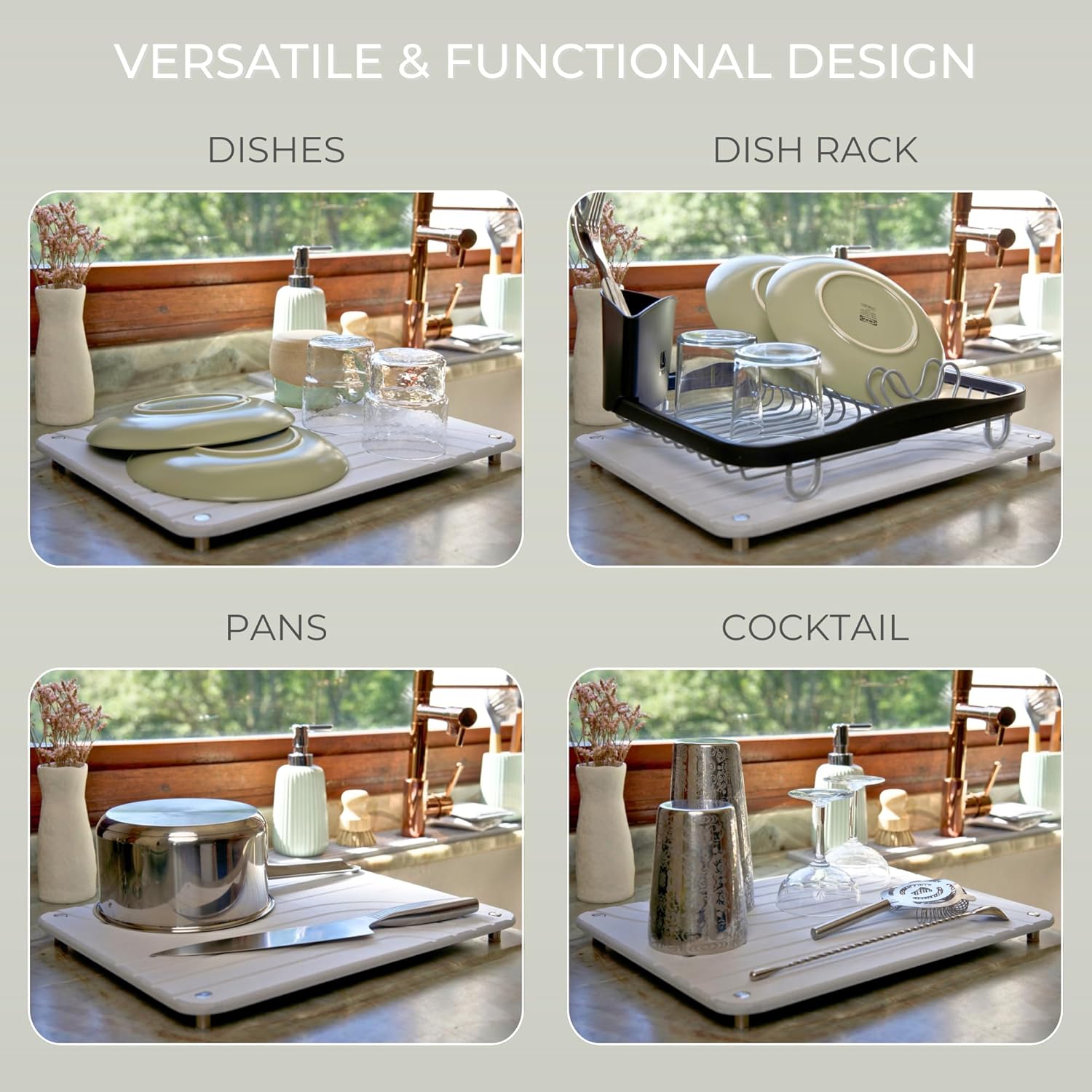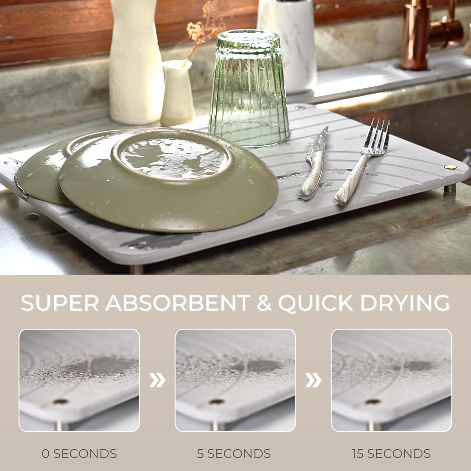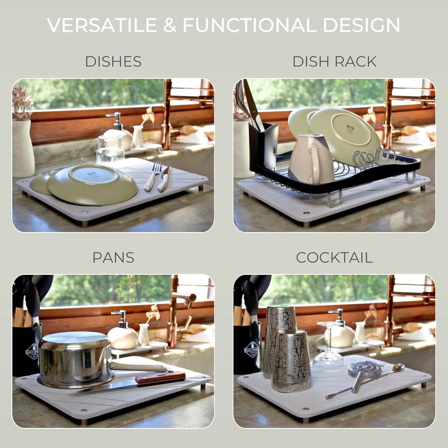 • NON-SLIP FEATURES – Our stone drying mat for kitchen includes raised legs with six non-slip rubber pads for a stable grip, even in wet conditions. Deep grooves capture excess water, while the elevated design ensures quick 360° drying, keeping your countertop organised and safe.