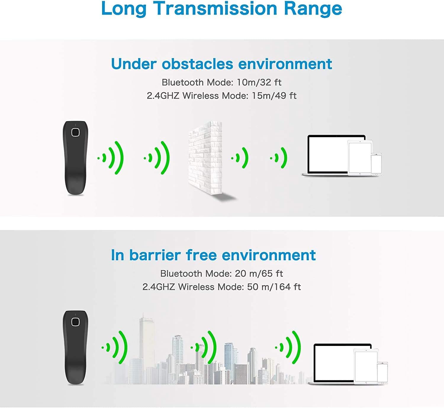 The Pocket bar code scanner comes with 3-in-1 Connection Design:Compatible with Bluetooth Function; 2.4G Wireless connection receiver; Wired connection. Easily connected with your laptop, PC, mobile phone, tablet, iphone, ipad, POS. Work with Windows XP/7/8/10, Mac OS, Windows Mobile, Android OS, iOS