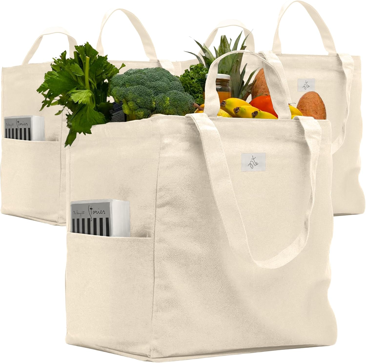 Nook Theory 3 Pcs Reusable Grocery Bags - Heavy Duty Canvas Bags, Large Reusable Shopping Bag, Picnic, 100% Cotton (Cream)