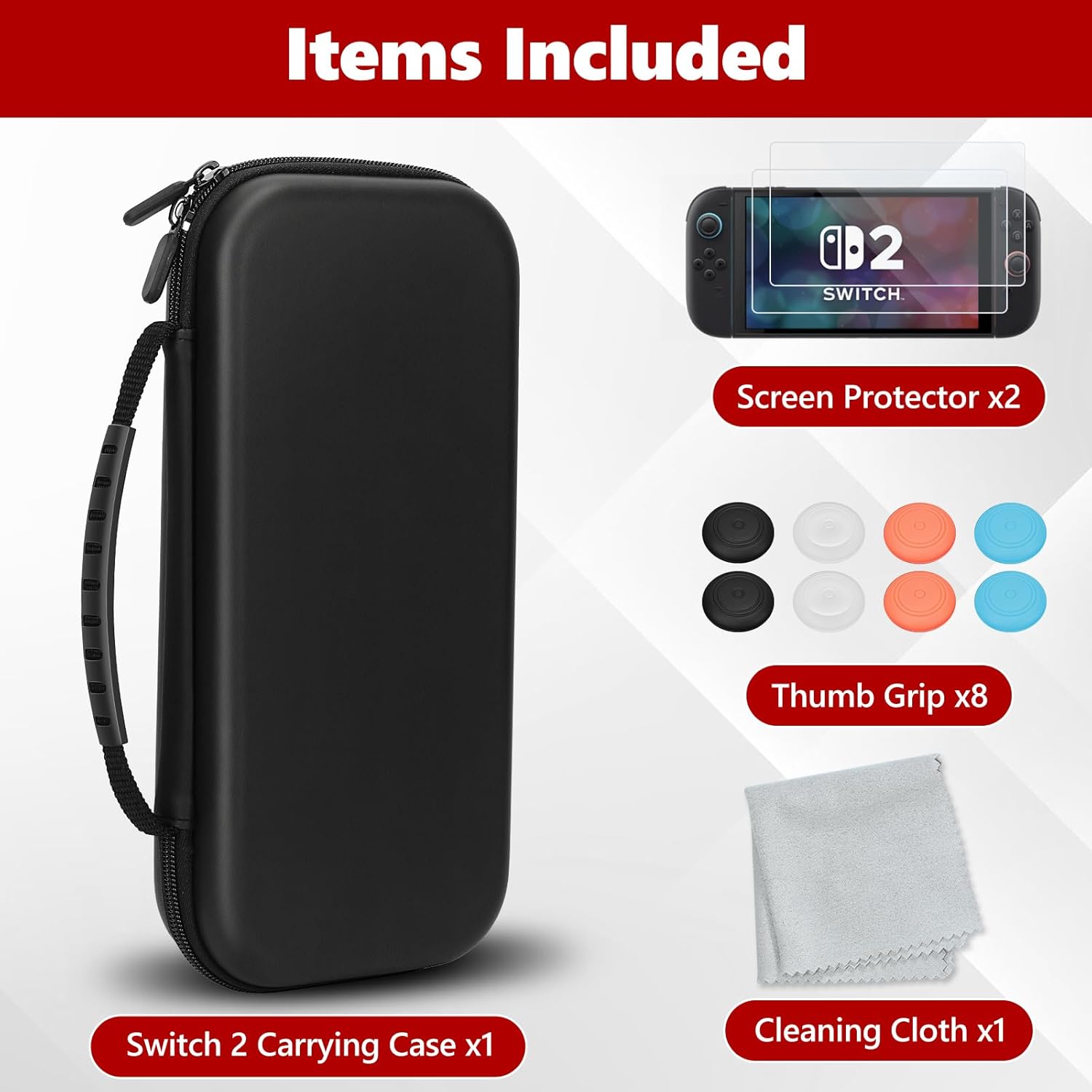 - Switch 2 Accessory Kit: Includes 1 durable Switch 2 carrying case, 2 high-quality tempered glass screen Protectors, 8 Switch 2 thumb grips, and 1 screen cleaning cloth.