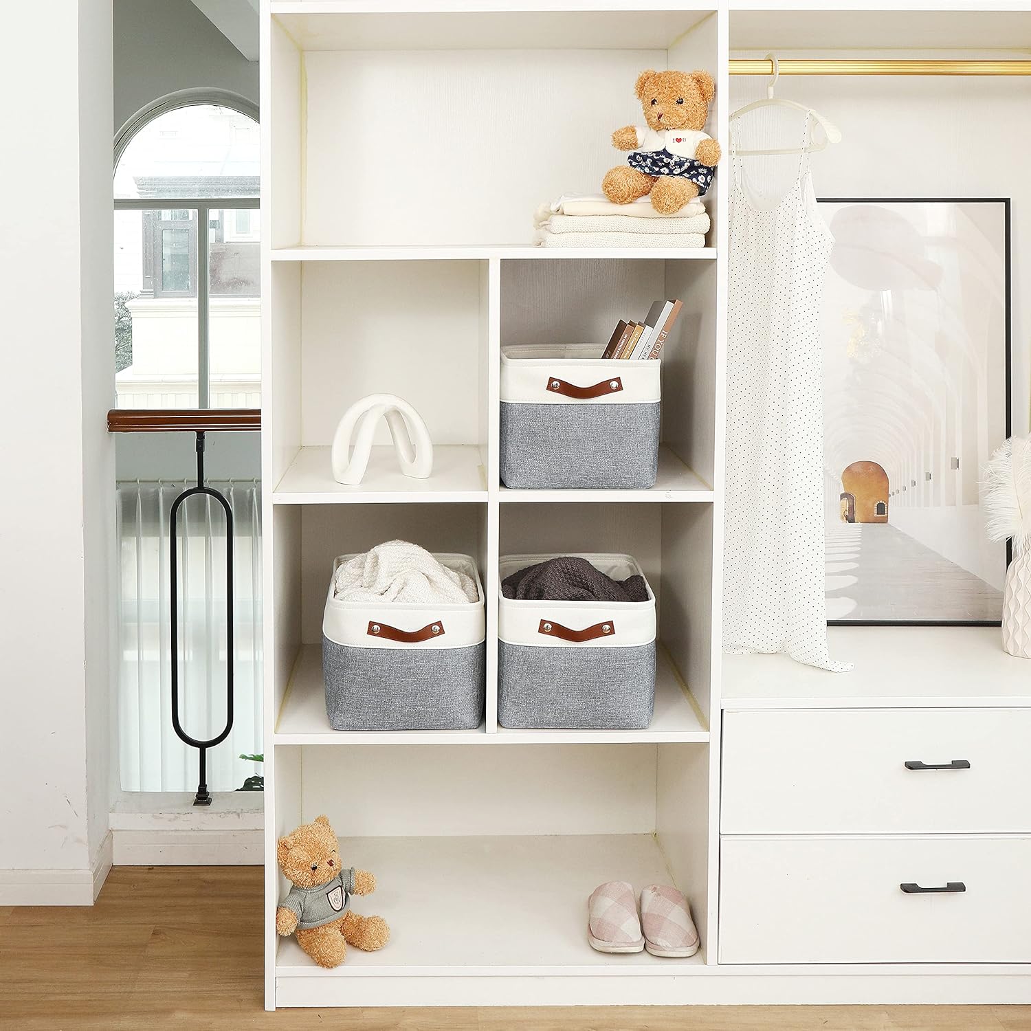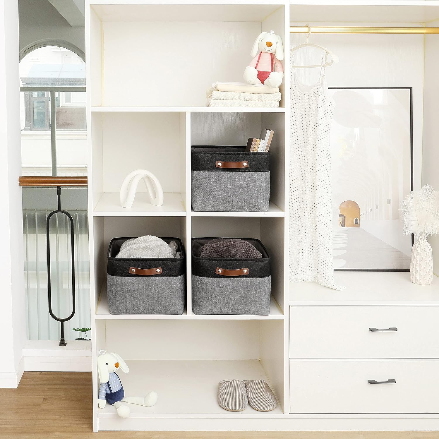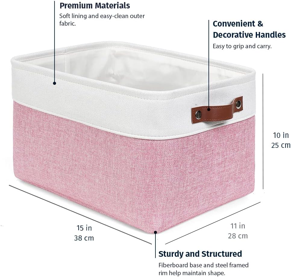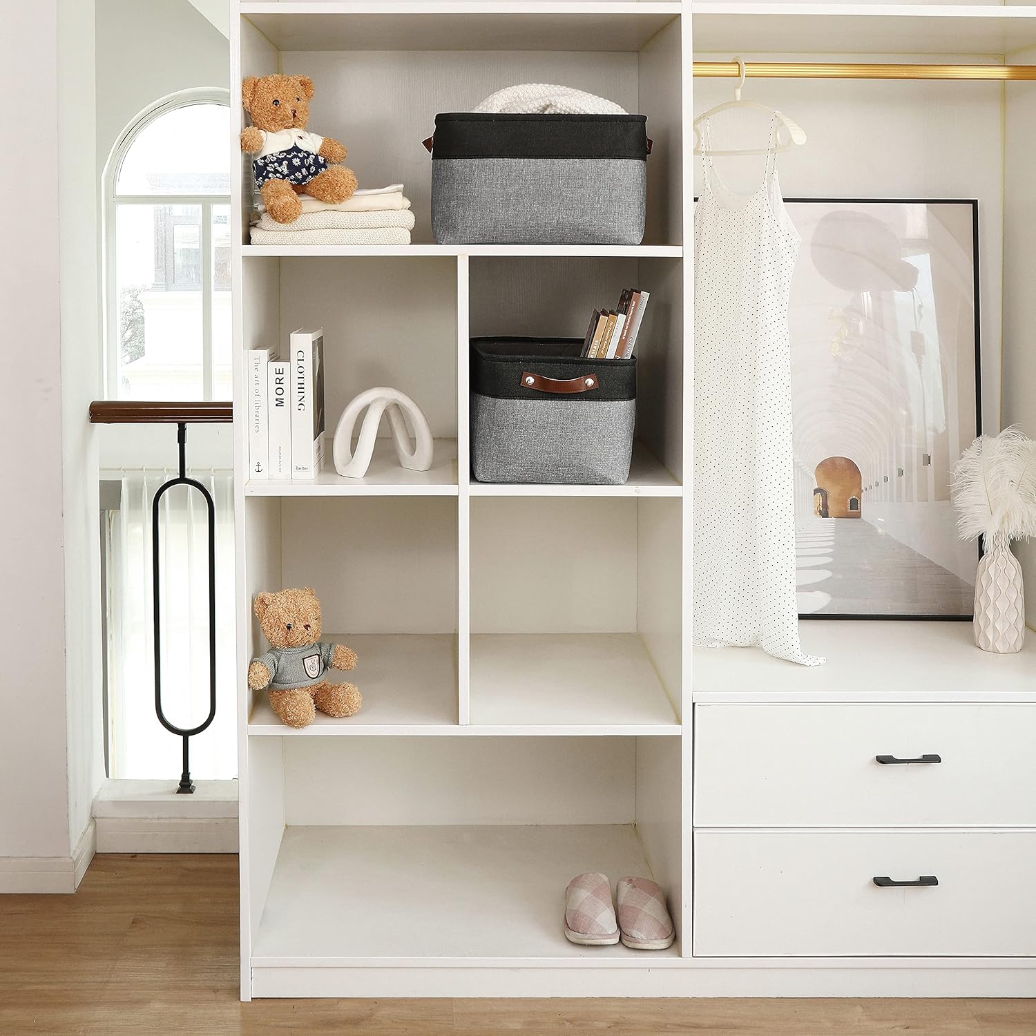 Multipurpose Closet Storage Bins – A smart choice for keeping your life neat and organized these storage bins for shelves and closet spaces can be used for clothes, kid’s toys, nursery room items, extra linens, laundry, towels, sheets, and more. - Decorative Fabric and Vegan Leather – These versatile storage baskets for organizing your everyday life are made with a thick, high-quality fabric and fitted with leather handles to add a stylish touch to a living room, bedroom, office, or personal space.