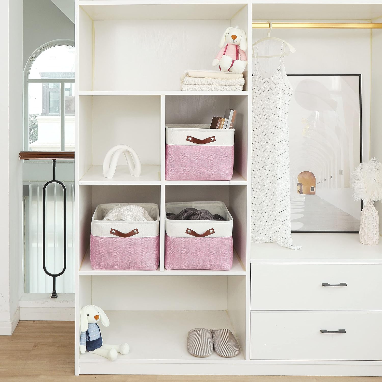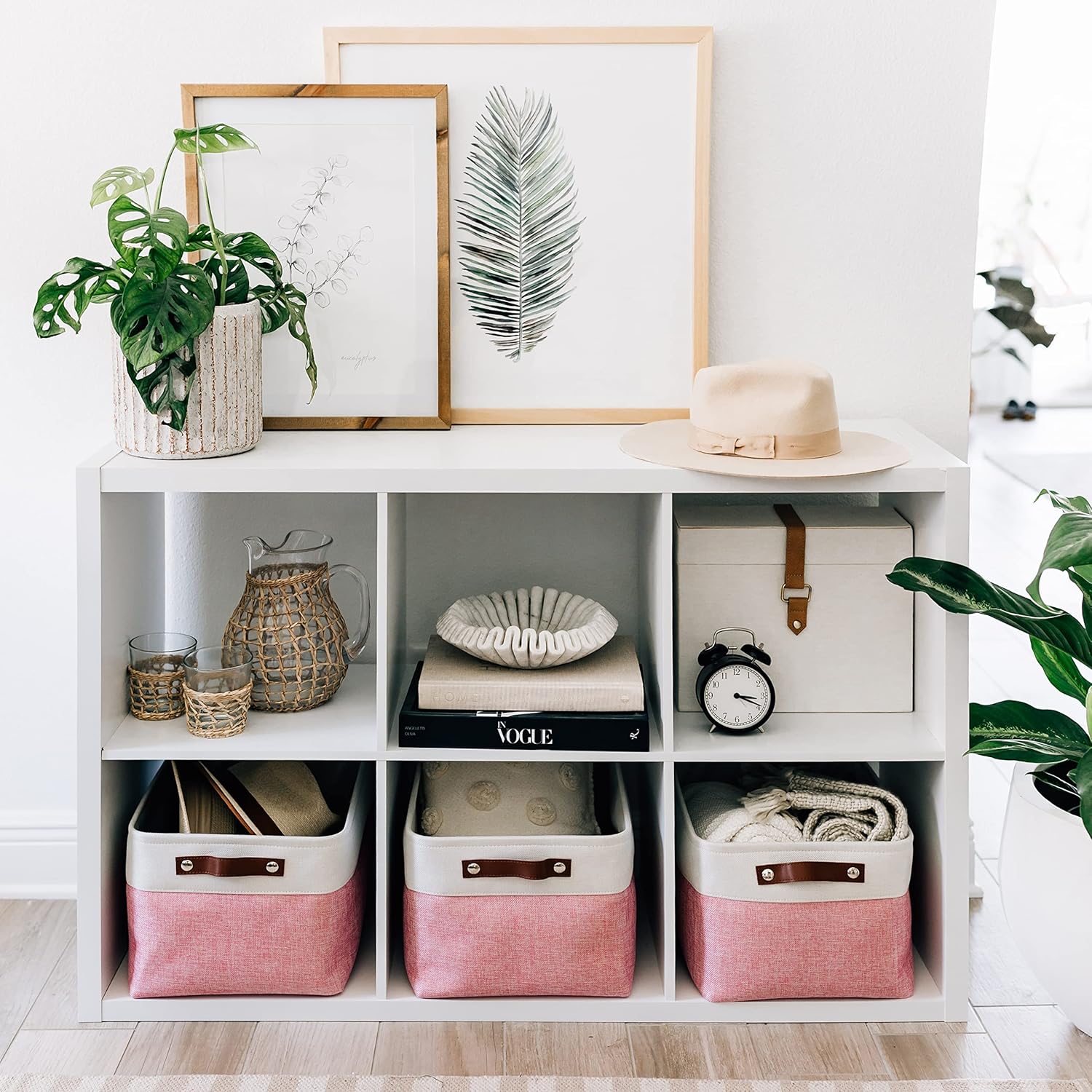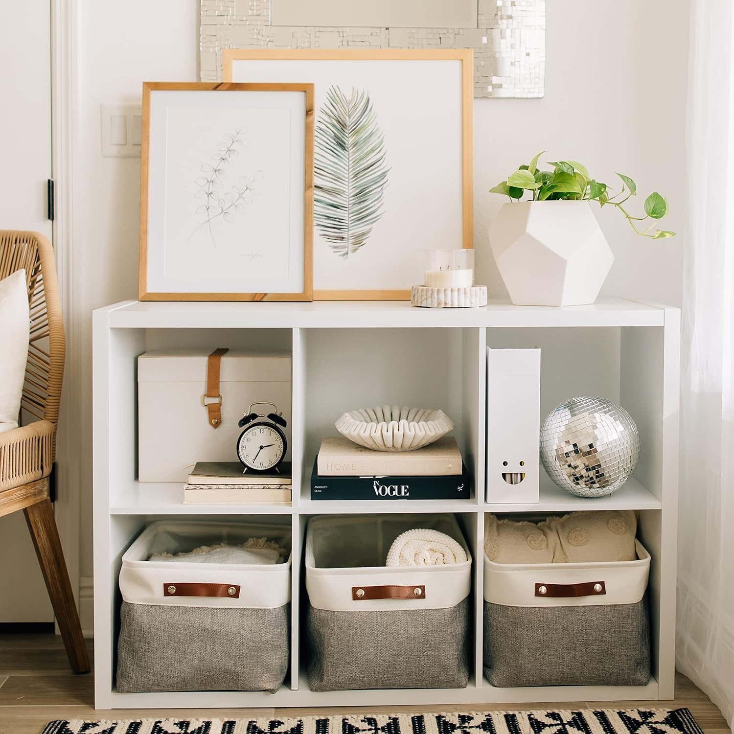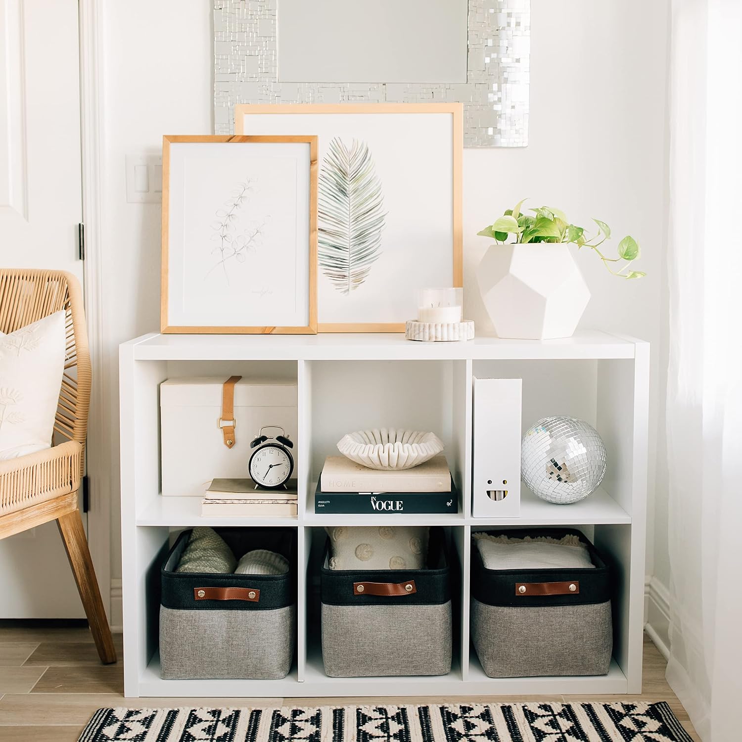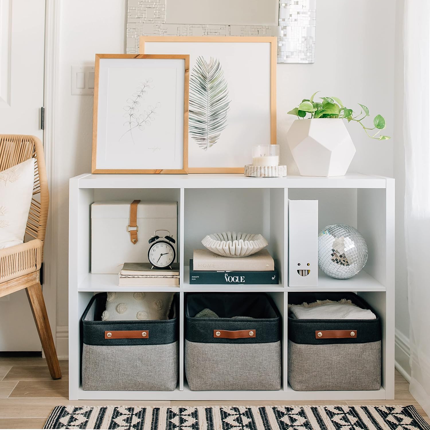 Multipurpose Closet Storage Bins – A smart choice for keeping your life neat and organized these storage bins for shelves and closet spaces can be used for clothes, kid’s toys, nursery room items, extra linens, laundry, towels, sheets, and more. - Decorative Fabric and Vegan Leather – These versatile storage baskets for organizing your everyday life are made with a thick, high-quality fabric and fitted with leather handles to add a stylish touch to a living room, bedroom, office, or personal space.