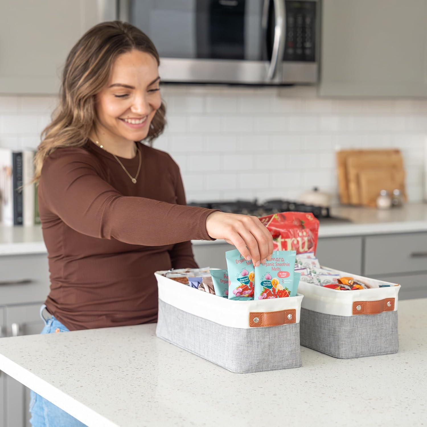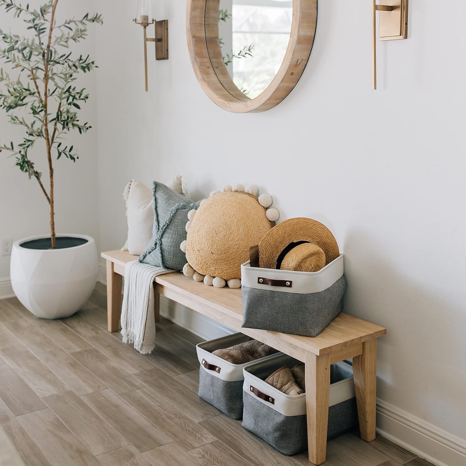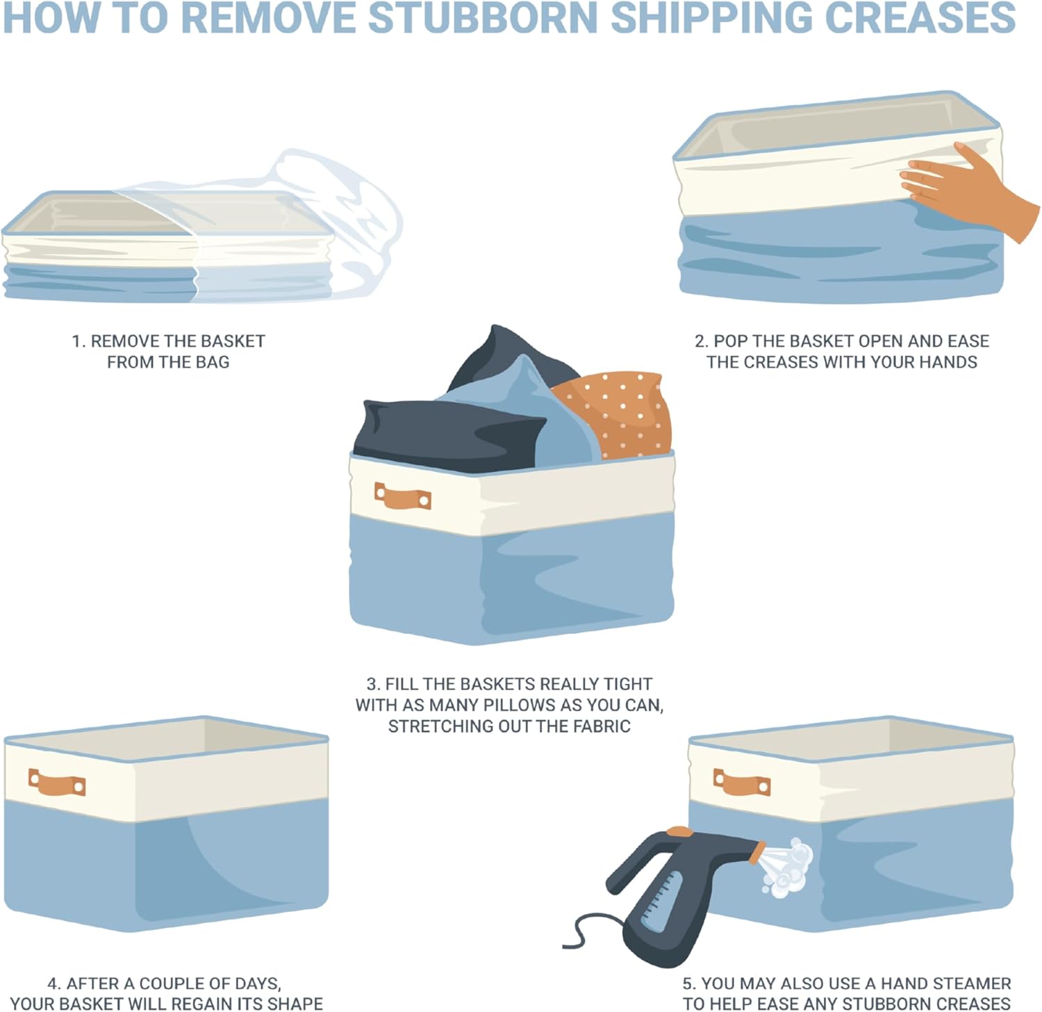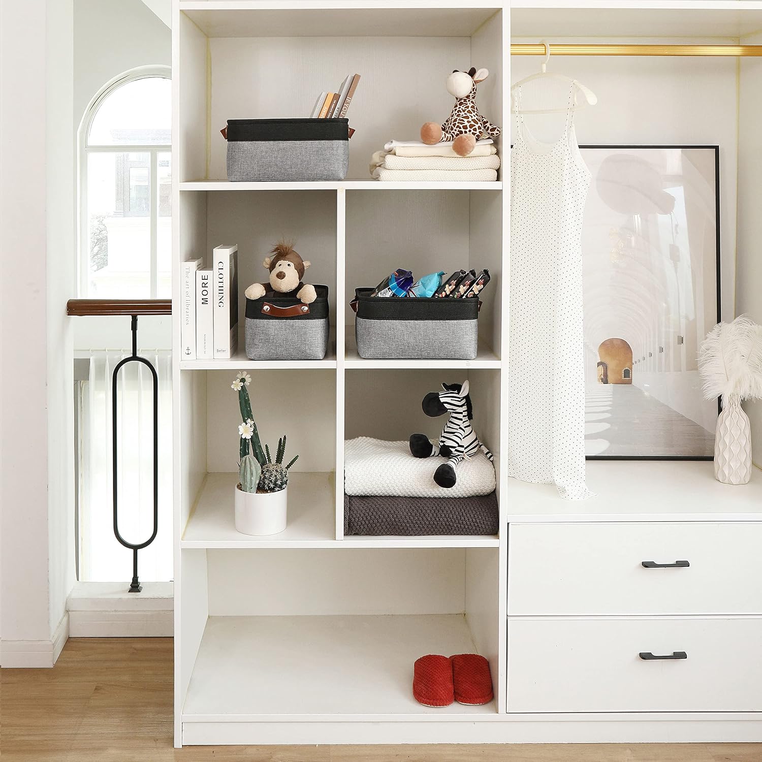 Multipurpose Closet Storage Bins – A smart choice for keeping your life neat and organized these storage bins for shelves and closet spaces can be used for clothes, kid’s toys, nursery room items, extra linens, laundry, towels, sheets, and more. - Decorative Fabric and Vegan Leather – These versatile storage baskets for organizing your everyday life are made with a thick, high-quality fabric and fitted with leather handles to add a stylish touch to a living room, bedroom, office, or personal space.