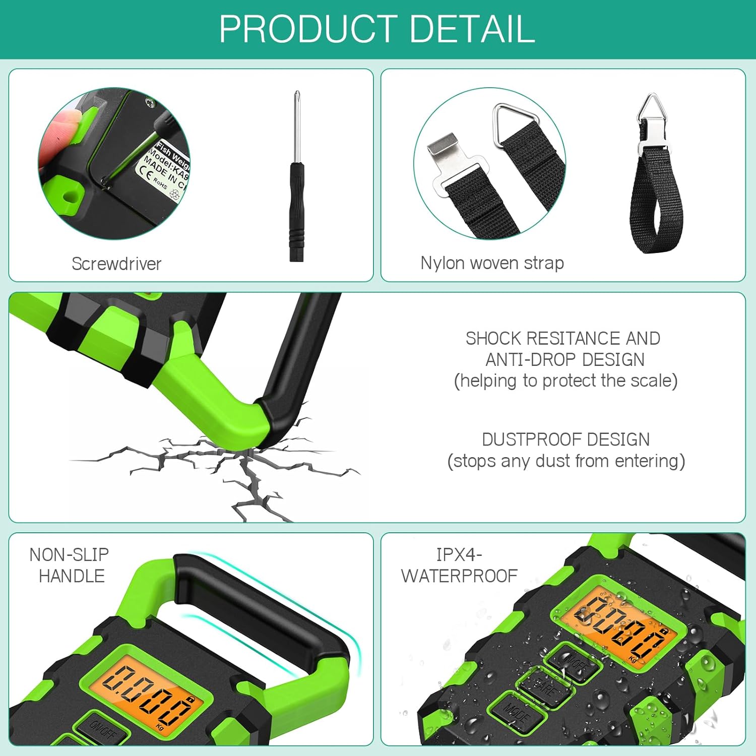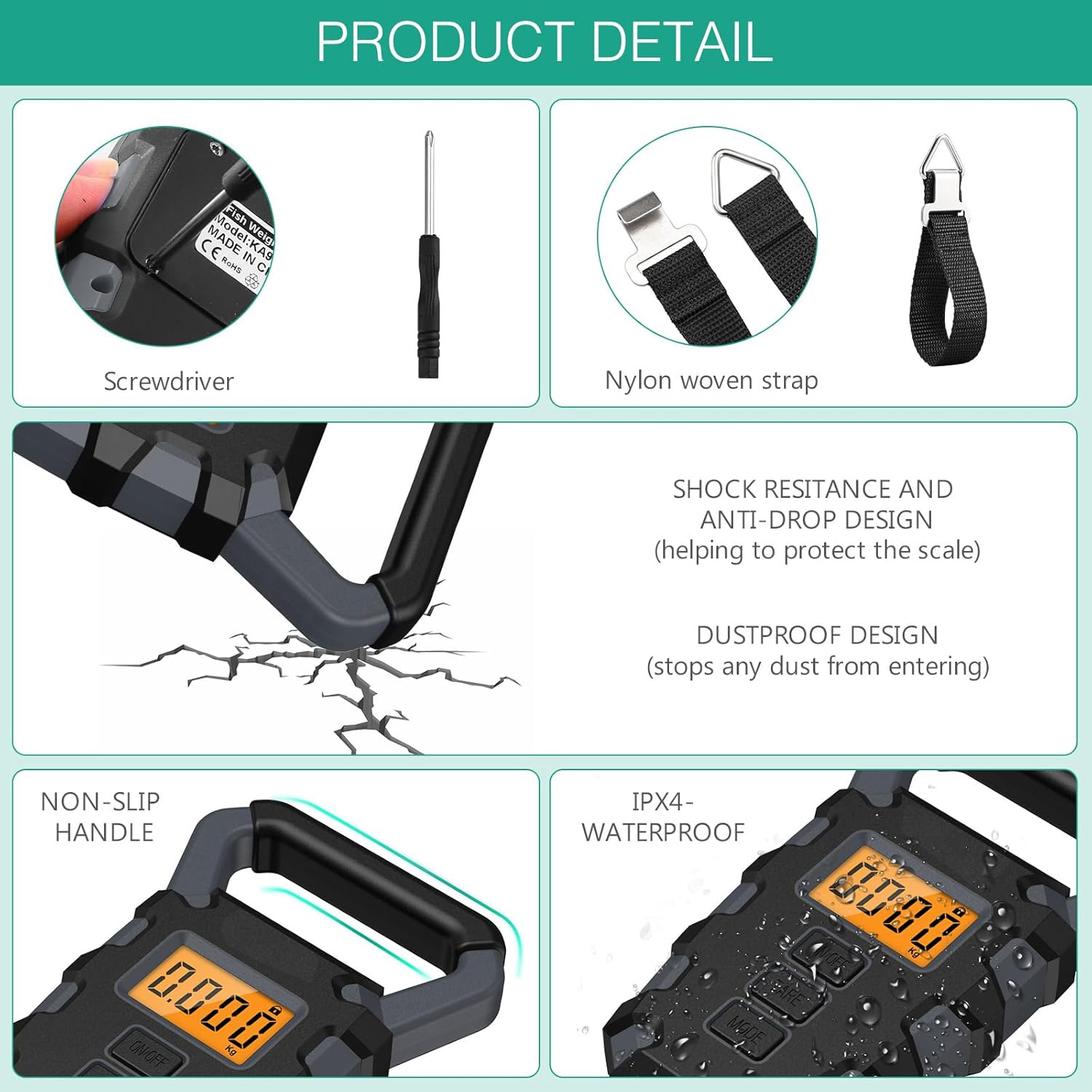 DURABLE HANDLE: The scale adopts a high-strength ABS frame, which is not easy to damage. The sides and handshake are coated with a non-slip process. Additionally, it has a strong stainless steel hook and luggage hook for fixing fish, luggage or parcels