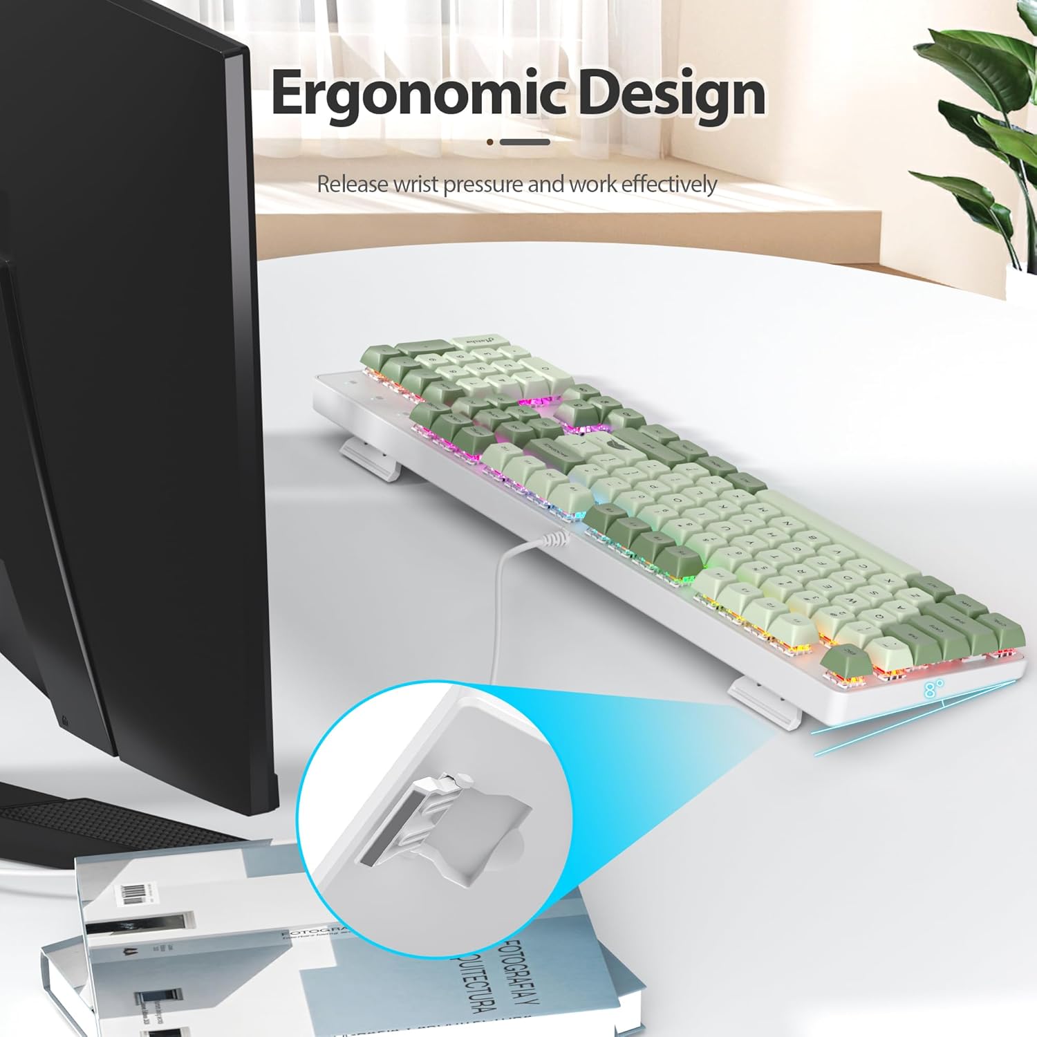 • 【Ergonomic Comfort】The design of this mechanical gaming keyboard is based on ergonomics, the keyboard kickstands provide comfortable angle for typing and effectively reduces the burden on the wrist.
