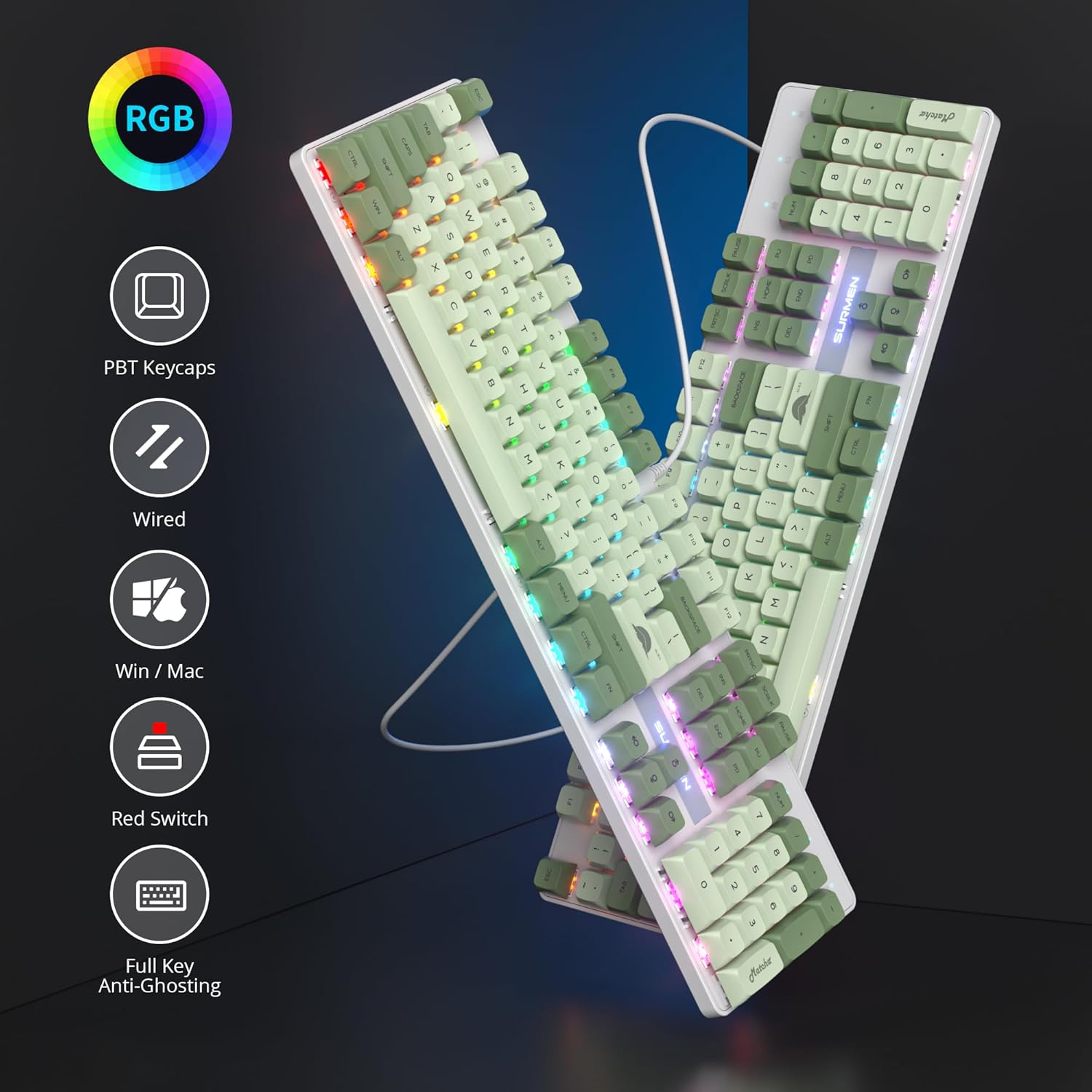 Owpkeenthy Full Size Green Mechanical Gaming Keyboard with Number Pad, Wired 100% Office NKRO Keyboard RGB Backlit 104 Keys with Red Switch for PC Gamer (104 Matcha)