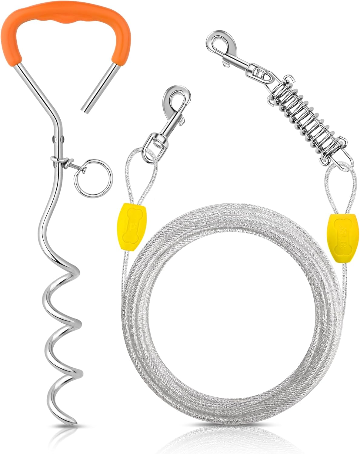 • Easy to Install and Use: The stainless steel stake adopts a spiral shape, with a yellow rubber handle, it can be easily screwed in and out of the ground by hand, and you can move it to any position. Dogs do not easily pull out the 16in stakes. Hang one end of the leash on the loop of the stake and the other end on the dog harness. Your dog will have plenty of room to roam