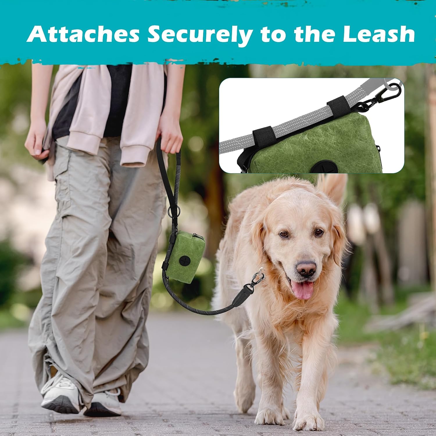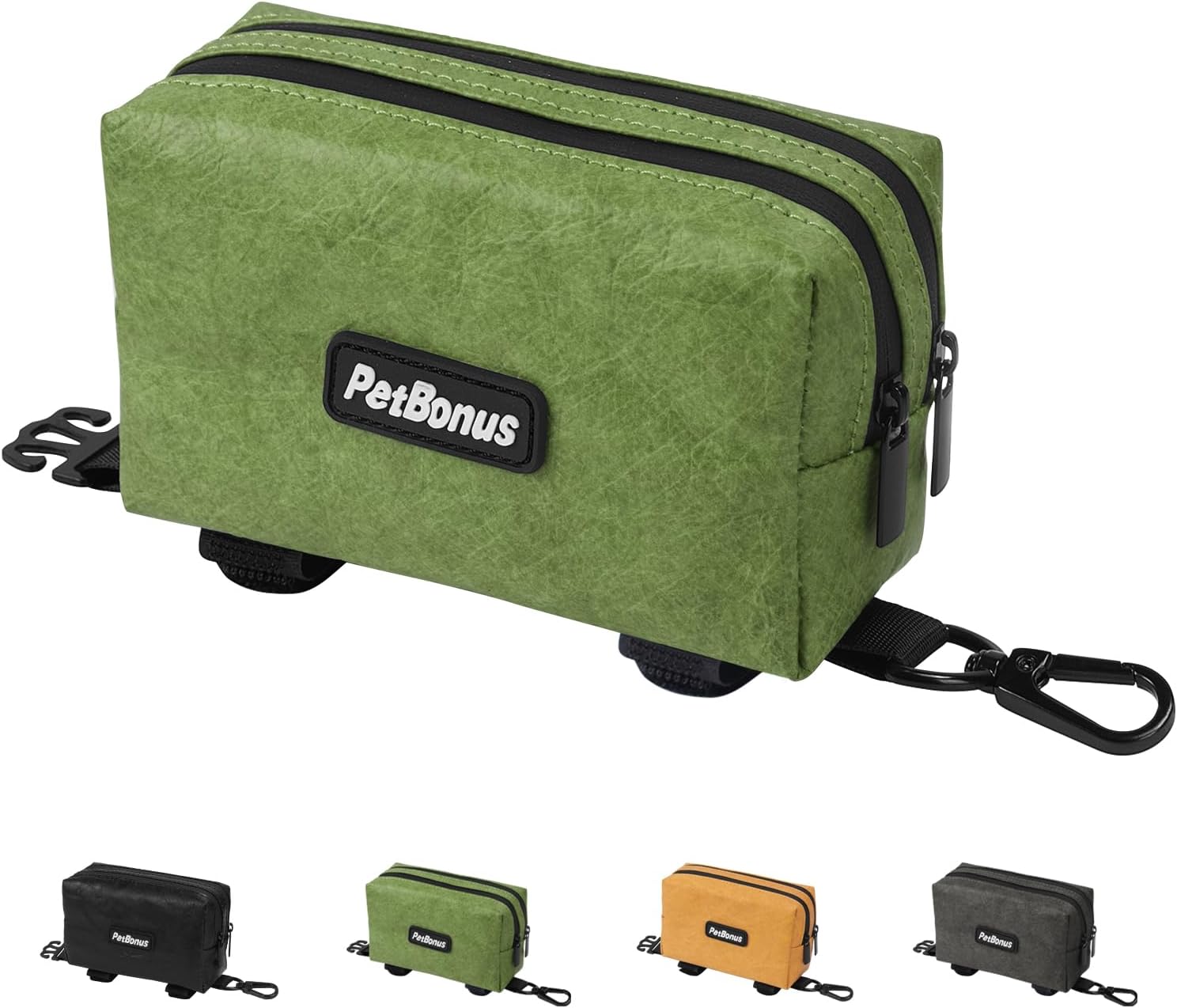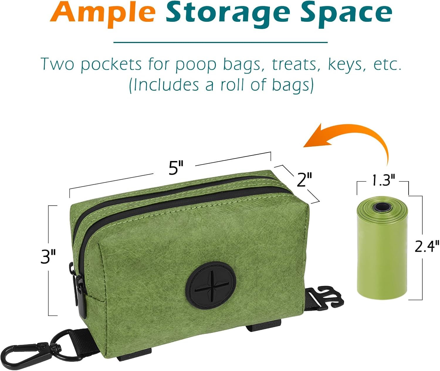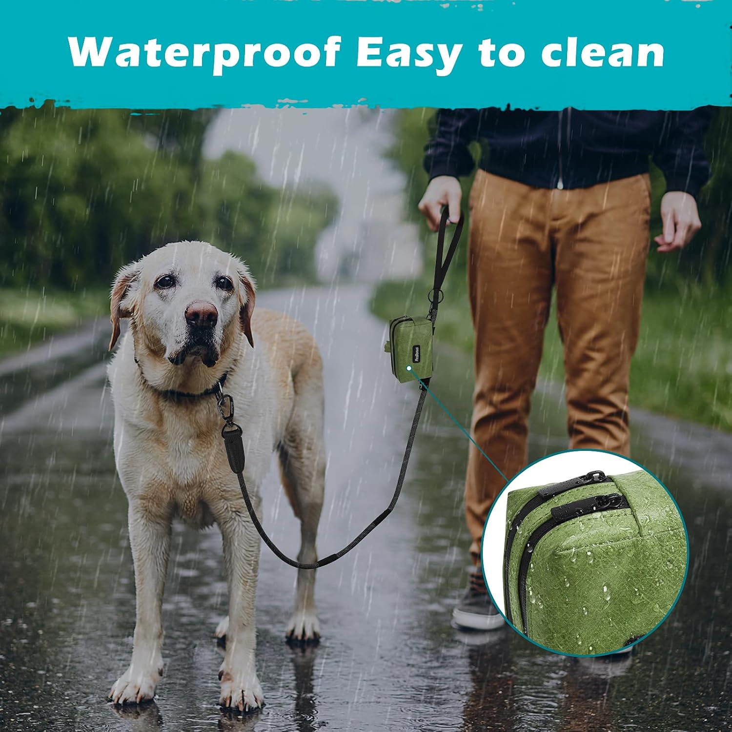 PetBonus Waterproof Dog Poop Bag Holder for leashes, Portable Pet Waste Bag Dispenser, 2 Pouches for Treat Holder and Walking Accessories, Fit All Leashes, Includes 1 Roll of Dog Poop Bags (Green)