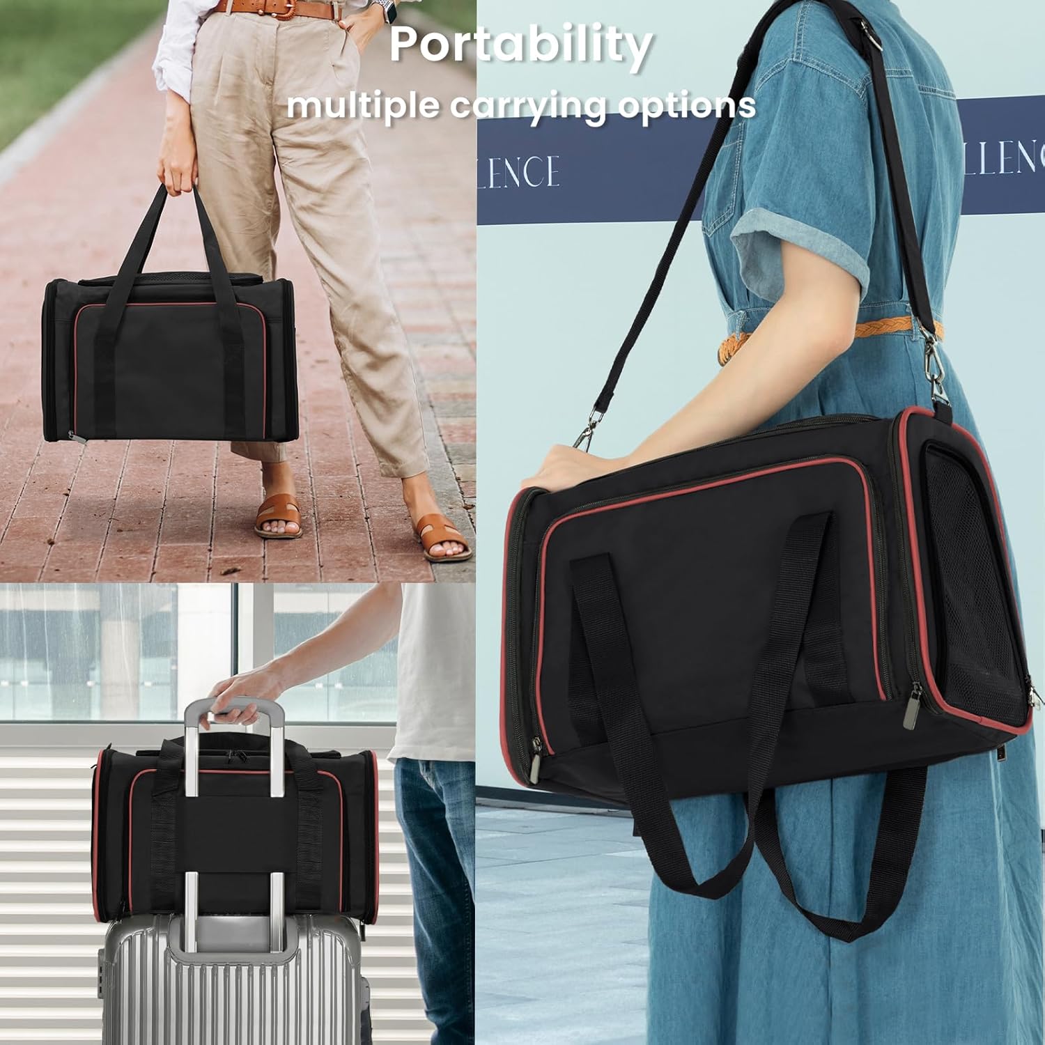 - 【Multiple Carrying Options】The self-locking zipper and built-in leash ensures pets stay secure. Slide the strap around the extendable handle of rolling luggage for easy maneuvering. Two flexible handles offer convenient hand-carrying. Additionally, a longer, detachable shoulder strap is included, and there’s a side pocket for storage.