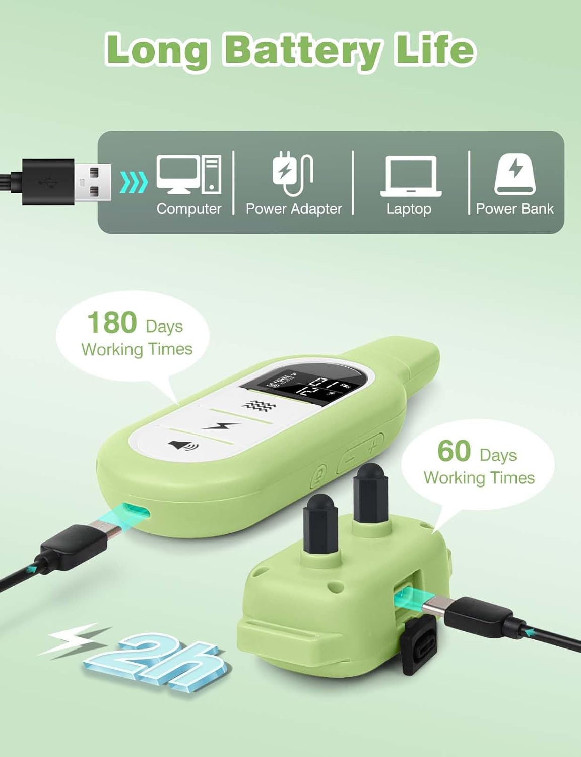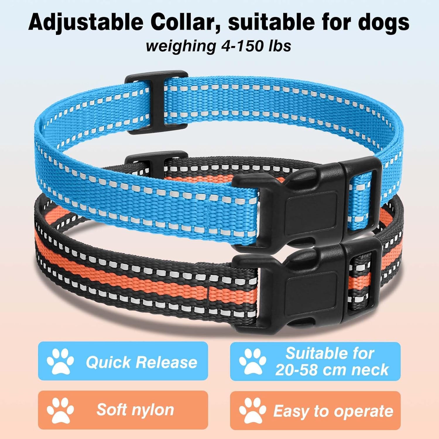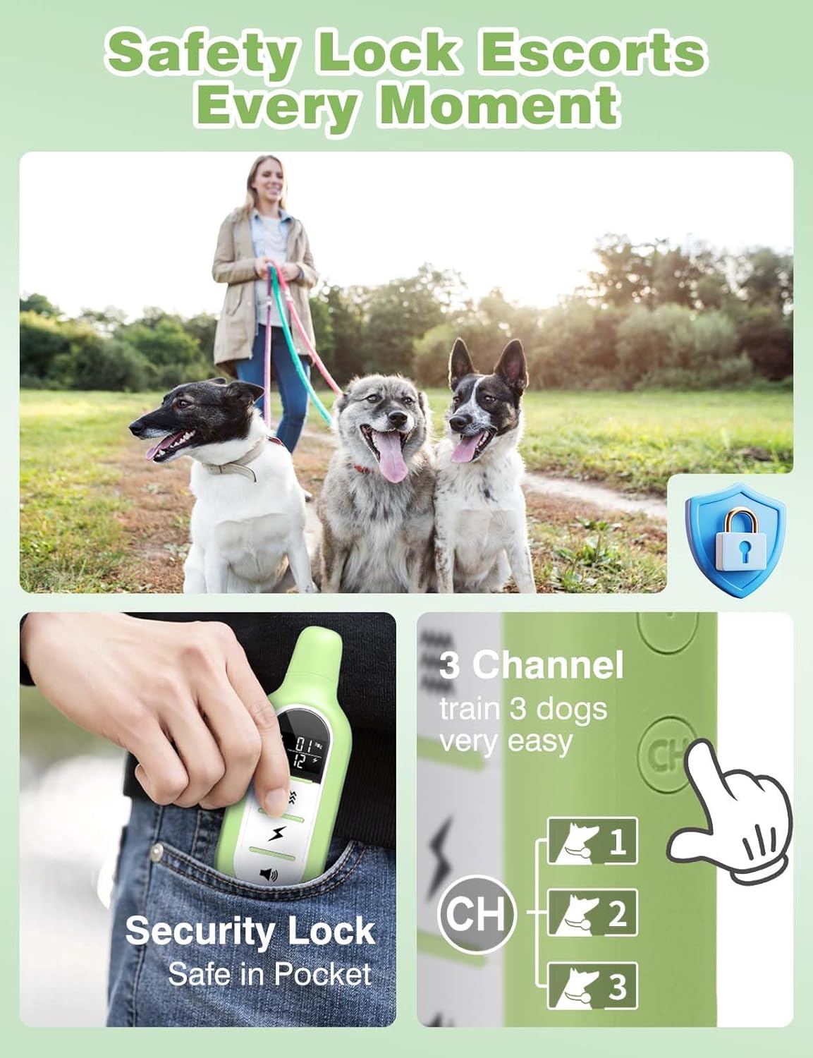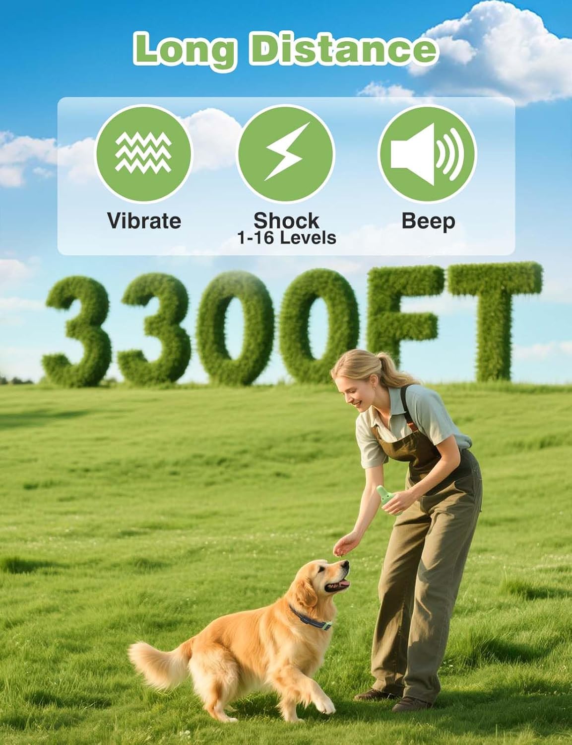 Looking for a reliable way to train your dog — whether they’re a playful pup or a big, strong breed? This remote dog training collar is the perfect tool to help you communicate clearly and effectively with your furry friend, both at home and outdoors. Our Shock Collar With a long range of up to 3300FT, this training collar for large dogs gives you the freedom to train in open spaces without losing control. Whether you're working on obedience, recall, or behavior correction, this shock collar with remote makes it easy to stay connected with your pet — even from a distance. This shock collar large breed offers 3 training modes - beep, vibration and adjustable shock (1-16 levels), so you can choose the best setting for your dog's personality and sensitivity. The 1-16-level static stimulation is especially suitable for large dogs with thick hair.For small and medium dogs, just choose the gentle vibration and beep mode, which is a great small dog shock collar. This waterproof electric beep collar for dogs is IP67 waterproof, so it can handle whatever your pup throws at it—whether they’re splashing in puddles, diving into the pool, or playing in the rain. Even bath time is no problem! Designed for active dogs and all kinds of weather, this collar is durable, reliable, and ready for action.(Tips: The remote isn’t waterproof, so keep it dry!) The remote is small and lightweight, making it easy to carry on walks, hikes, or training sessions — perfect for anyone using this as a training collar small medium dog solution. This electric dog collar comes with a convenient battery check feature, so you always know the power status at a glance. The remote includes an LCD screen that clearly displays its current battery level. To check the receiver’s battery, simply press the receiver’s power button twice quickly — it will beep 4 times to indicate a full charge, with each beep representing 25% battery life.When the receiver is completely out of power, it will emit a continuous beeping sound to alert you. What’s more, this dog training collar with remote comes with a channel lock function, so you can easily train or manage multiple dogs at the same time. And if you have more than three pups, you can add extra receivers for even more control. Adjustable Fit for All Dogs – This training collar for dogs fits neck sizes from 8 to 27 inches and works for dogs as small as 8 lbs up to 120 lbs. Just adjust or cut the strap to size for a perfect fit. Whether you're exploring the vast wilderness or taking a long drive, the last thing you want is your training collar to run out of power. Our dog vibration training collar comes with a rechargeable USB cable that fully charges in just 2 hours, allowing you to continue your training.