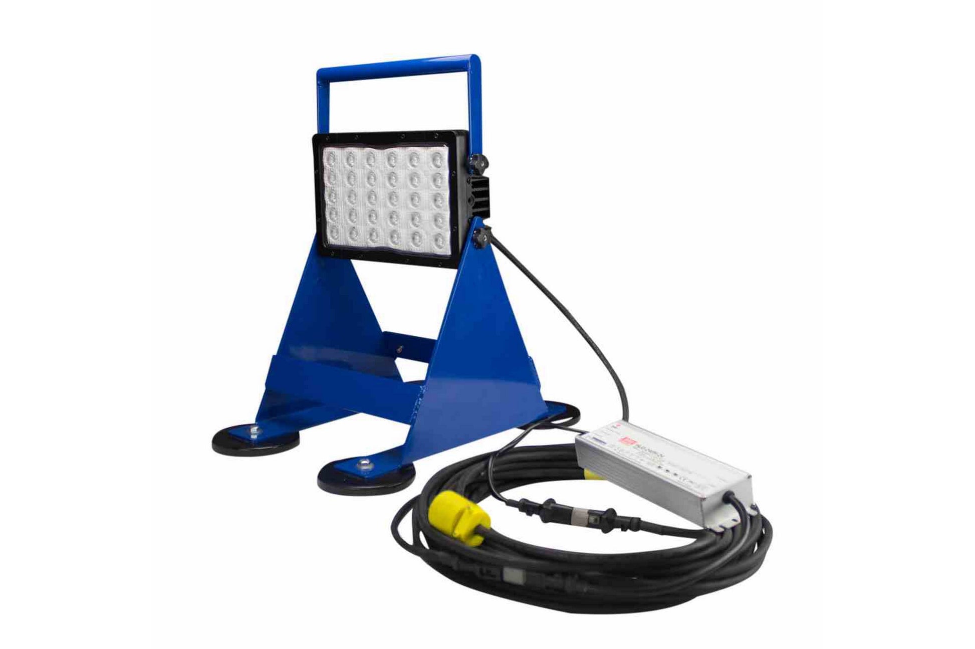 These pedestal mounted LED work lights are waterproof to 3 meters, sealed against intrusion by dust and dirt, and very ruggedly constructed to withstand the most demanding environments, conditions and applications. BML-150LED-LV-50 LED work lights are ideal replacements for fragile and hot running portable 400 watt metal halide lamps as they run cooler, are more durable, and use less power. These magnetic mount LED pedestal lights are a superior lighting solution for applications where power, reliability, and the ability to mount the light in places where positioning a normal pedestal light without a magnetic base would be unstable.