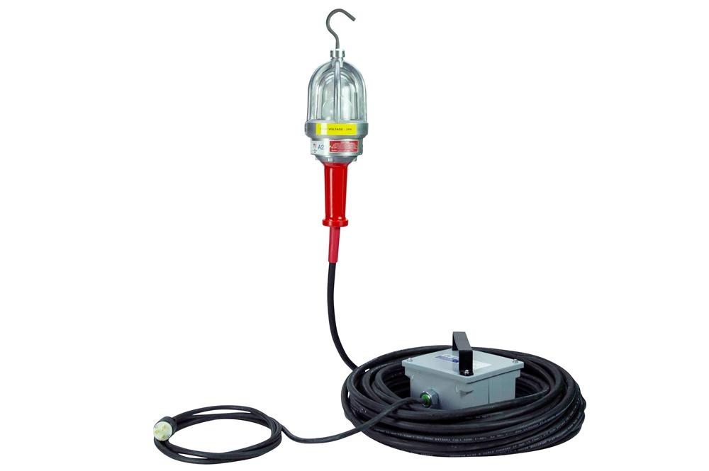 This drop light operates on 240V AC and steps down the voltage to 24 Volts AC or DC for the light and is suitable for use in areas where petrochemical vapors and various dusts are present. This unit is rated Class I Division 1 and Class II Division 1 and comes with 100` of SOOW 16/3 AWG cord and an inline transformer that steps down 240V AC to 24V AC or 24V DC.