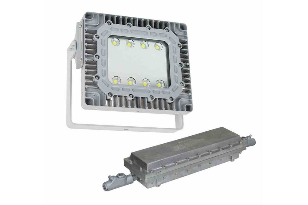 This emergency LED light works, mounts and is wired like our EPL-LED-100W-RT LED light fixtures. The main difference is that we add a remote mounted battery backup unit that adds emergency light functionality to the fixture. This emergency LED light will run at the standard UL suggested 90 minutes after power is lost at 2,625 lumens. The light recharges the battery once electrical power is restored. Standard configuration includes a single emergency battery backup that is automatically recharged and kept in a ready state. The explosion proof LED light fixture features multiple LED drivers which helps to increase the operational life of the fixture. With traditional LED lights, in the event an LED array or driver fails, the entire fixture no longer illuminates. This new series of LED lamps contains eight individual LED boards configured in a series of banks. Each bank contains two LED boards with an individual driver. In the event of a driver failure, only one bank of LEDs will be effected while the other banks will continue to operate. In the event that of an LED failure, the mating LED will continue to operate. LED Benefits: Unlike gas burning and arc type lamps that have glass bulbs, LEDs have no filaments or fragile housings to break during operation and/or transportation. Instead of heating a small filament or using a combination of gases to produce light, light emitting diodes (LEDs) use semi-conductive materials that illuminate when electric current is applied, providing instant illumination with no warm up or cool down time before re-striking. Because there is no warm up period, this light can be cycled on and off with no reduction in lamp life. LED lights run at significantly cooler temperatures than traditional metal halide and high pressure sodium lights and contain no harmful gases, vapors, or mercury, making them both safer and more energy efficient. No extra energy is wasted in cooling enclosed work areas due to external heat emissions from bulb type lights, and the operator risks associated with traditional lighting methods, such as accidental burns and exposure to hazardous substances contained in the glass bulbs, are eliminated. In addition, LEDs are also safer for the environment as they are 100% recyclable, which eliminates the need for costly special disposal services required with traditional gas burning and arc type lamps. This light is universal voltage capable and can be operated with 100-277 VAC, 50/60Hz. We also offer a low voltage version of this LED fixture that operates on AC/DC voltages from 11-25 Volts. This explosion proof LED light fixture is IP67 rated, dust-proof, and protected against high pressure jets and temporary submersion. The cast aluminum body and LED lamp give this light excellent durability and resistance to vibration and impacts. The housing is specially designed to dissipate heat which increases the efficiency and lifespan of the LEDs and electronics.