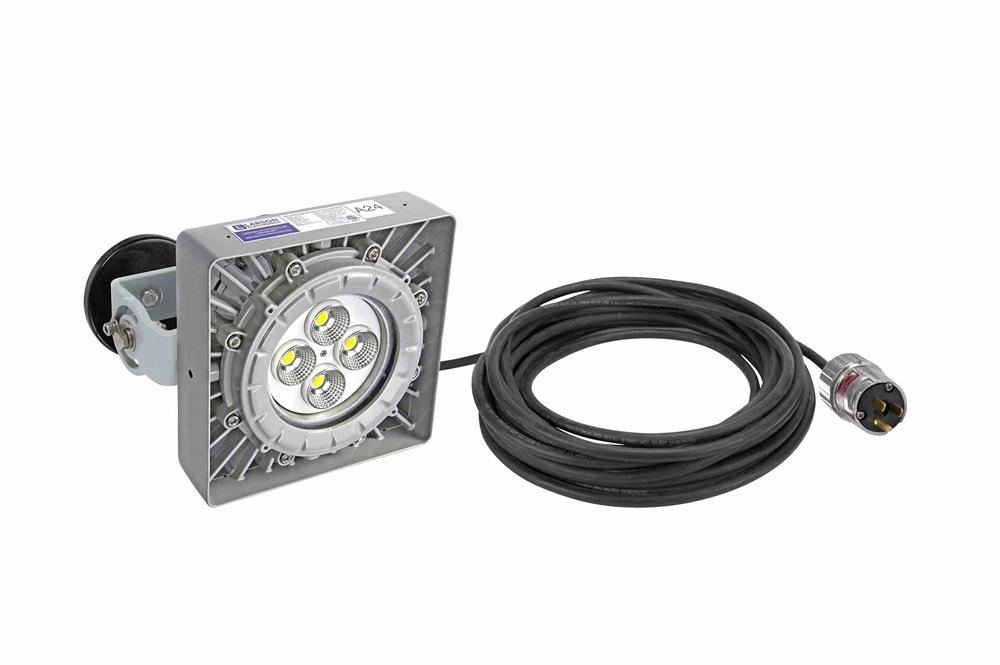 Wiring & Plug: This explosion proof flood light is equipped with 50 feet of 16/3 chemical and abrasion resistant SOOW cord that is fitted with an explosion proof cord cap for easy connection to explosion proof outlets. Plug options include a 5-15 15 amp straight blade plug for use with 120V explosion proof outlets, a 5-20 20 amp straight blade plug for use with 120V explosion proof outlets, or a 6-20 20 amp straight blade plug for use with 220-240V explosion proof outlets. **PLEASE NOTE** voltage ratings on plugs and outlets are MAXIMUM voltage. For low voltage applications, proper voltage must be applied to the outlet or damage to the light fixture will occur. Mounting: The EPL-MB-70LED-50 explosion proof remote low bay LED light fixture is typically mounted to flat ferrous surfaces for observation. The included adjustable magnetic bracket features two 100 lb grip magnets for temporarily attaching to ferrous surfaces. This adjustable bracket has two set screws on the bracket, allowing operators to loosen the mounting bracket, adjust the camera`s tilt orientation, and retighten to hold the camera in position after mounting. This magnetic mount solution is ideal for temporary mounting within tanks, and for applications where drilling cannot be done. Alternative surface mounts and pole mounts are available. Suggested Applications: Paint spray booths, aircraft maintenance, oil drilling rigs, refineries, solvent and cleaning areas, chemical manufacturing, waste treatment plants, gas processing plants and more.