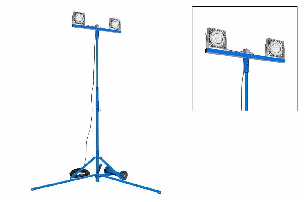 This portable LED light is comprised of two adjustable explosion proof LED light heads mounted atop a three leg tripod fabricated from non-sparking powder coated aluminum. This adjustable and collapsible tripod can be extended to 9.42 feet, collapsed to 6.8 feet, and includes solid wheels allow the operator to tilt the unit back and simply roll the entire assembly to a new location when fully deployed. The LED light fixture assembly can be removed by releasing the hand knob and sliding the light and mounting bracket off of the center support while the legs can be collapsed, aiding in deployment, storage and transport. The lamp can be easily adjusted vertically and locked into position.