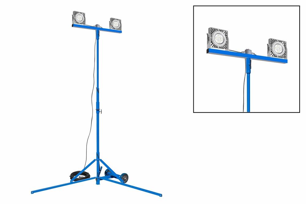 This portable LED light is comprised of two adjustable explosion proof LED light heads mounted atop a three leg tripod fabricated from non-sparking powder coated aluminum. This adjustable and collapsible tripod can be extended to 9.42 feet, collapsed to 6.8 feet, and includes solid wheels allow the operator to tilt the unit back and simply roll the entire assembly to a new location when fully deployed. The LED light fixture assembly can be removed by releasing the hand knob and sliding the light and mounting bracket off of the center support while the legs can be collapsed, aiding in deployment, storage and transport. The lamp can be easily adjusted vertically and locked into position.
