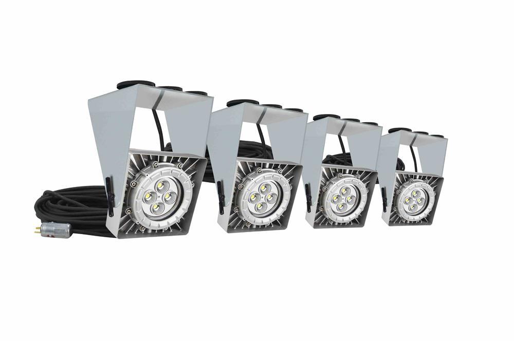 This unit incorporates four explosion proof 50 watt LED lamps connected in series and is suitable for use in areas where petrochemical vapors and various dusts are present. The cast aluminum housings, tempered glass lens, and abrasion resistant cord make this a very durable unit that will resist damage from chemicals, abrasion, vibrations and impacts. This string lighting solution will provide the lighting you require in a flexible, easy to manage configuration for job site illumination. The lamps can be moved around and mounted to different points within the work area. The lights, however must remain within 20 feet of one other.