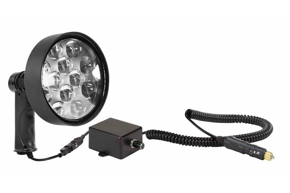The HL-85-LED-CPR-D super bright handheld 10 million candlepower inine dimmer spotlight from Larson Electronics is lightweight, ultra rugged, and features a comfortable ergonomic design. This unit uses seven high output Cree LEDs and an advanced reflector and lens configuration to generate 3,200 lumens with a beam reach of over 1,600 feet while drawing only 36 watts of power. Equipped with a cigarette plug that operates on 12-24V DC, this IP67 rated waterproof spotlight is ideal for hunting, camping, marine and boating use as well as for first responders and emergency services. The HL-85-LED-CPR-D features a continual on/off switch that requires one press to stay on and another press to turn off, as well as a pulse width modulator controller allowing operators to directly control the brightness of the LED light. Light Features: The HL-85-LED-CPR-D super bright handheld spotlight delivers an impressive 3,200 lumens while drawing only 36 watts of energy. With a combination seven high output Cree LEDs and a 5" reflector, this spotlight cuts through the darkness with a beam length of over 1,600 feet. The Cree LED units in this light have been chosen for their high lumen per watt ratio and extreme longevity. Inline Dimmer Switch: The HL-85-LED-CPR-D features a pulse width modulator, which functions as an inline dimmer, to regulate the voltage and control the brightness of the LED using an easy to use dial. This dimmer produces 135Hz and is equipped with male and female Deutscch connectors. The use of this "dimmer" switch allows operators to regulate energy usage and change the brightness of the handheld light for different applications. These Cree LEDs generate 56 lumens per watt effective lumen output and have a 70% lumen retention at 50,000 hours, giving them better efficiency and operational life than traditional light sources. The unique shape and shallow contour of the 120mm reflector is paired with a convex lens and inset lens position to efficiently capture and project a focused beam of light while reducing the light spillage and waste that is common with many spotlights. This efficient design also reduces casting, a phenomenon that occurs when wasted light "spills" around the light source. Often times, when surrounded by water, snow or other reflective surfaces, this light spillage prevents the human eye from adjusting properly and seeing objects at distance. With the HL-85-LED-CPR-D spotlight configuration, 90% of the emitted light is captured and focused, clearly and sharply illuminating objects all the way to the end of the beam reach. This IP67 rated waterproof spotlight features an ultra-durable ABS shockproof polymer body, an aluminum alloy light head housing, and an impact resistant polycarbonate lens. While the HL-85-LED-CPR-D is built to withstand rugged use and harsh outdoor conditions, comfort and ease of operation haven`t been sacrificed. This unit is ergonomically designed for balanced and comfortable handling. The 4.5"L x 1.5"D and 5/8 inch thick nylon handle has a no-slip textured surface that ensures a firm grip even in wet conditions. The booted push button is conveniently placed to allow operators easy forefinger access to the switch for quick on/off action. On/Off Switch Operation: The HL-85-LED-CPR-D LED handheld inline dimmer spotlight features a continual on/off switch. This means that the spotlight will stay on after a single button press and remain on until the power button is pressed again. Operators simply press the button once and will have a continual source of high-intensity LED light for their illumination needs until the on/off switch is pressed again to turn the light off. There is no need to keep pressure on the on/off switch at all times when light is desired unlike other spotlight models on the market that feature a trigger type switch. This operation of the on/off switch makes the HL-85-LED-CPR-D an easy to use and convenient source of portable LED light.