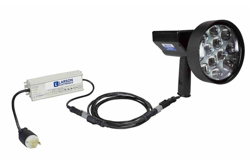 The HL.RL-85-LED-36W-CPR-1227 super bright handheld 10 million candlepower spotlight from Larson Electronics is lightweight, ultra rugged, and features a comfortable ergonomic design. This unit uses seven high output Cree LEDs and an advanced reflector and lens configuration to generate 3,200 lumens with a beam reach of over 1,600 feet while drawing only 36 watts of power. What sets this LED spotlight apart from other models is that it charges while it is plugged into a power source even when it is in use. The cord can be detaached from the light by disconnecting it from the power supply to use this light like a rechargeale unit. Operating on 120-277V AC standard wall voltage that is stepped down via waterproof inline transformer to 12-24V DC, this IP67 rated waterproof spotlight is ideal for a wide variety of applications. The HL.RL-85-LED-36W-CPR-1227 features a continual on/off switch that requires one press to stay on and another press to turn off. This unit can be used while plugged in or it can be unplugged and used via battery operation. Light Features: The HL.RL-85-LED-36W-CPR-1227 super bright handheld spotlight delivers an impressive 3,200 lumens while drawing only 36 watts of energy. With a combination seven high output Cree LEDs and a 5" reflector, this spotlight cuts through the darkness with a beam length of over 1,600 feet. The Cree LED units in this light have been chosen for their high lumen per watt ratio and extreme longevity. This IP65 rated spotlight features an ultra-durable ABS shockproof polymer body, an aluminum alloy light head housing, and an impact resistant polycarbonate lens. While the HL.RL-85-LED-36W-CPR-1227 is built to withstand rugged use and harsh outdoor conditions, comfort and ease of operation haven`t been sacrificed. This unit is ergonomically designed for balanced and comfortable handling. The nylon handle has a no-slip textured surface that ensures a firm grip even in wet conditions. The booted push button is conveniently placed to allow operators easy forefinger access to the switch for quick on/off action. Larson Electronics offers additional options for the HL.RL-85-LED-36W-CPR-1227 spotlight, including red and green lenses. For more information, contact .