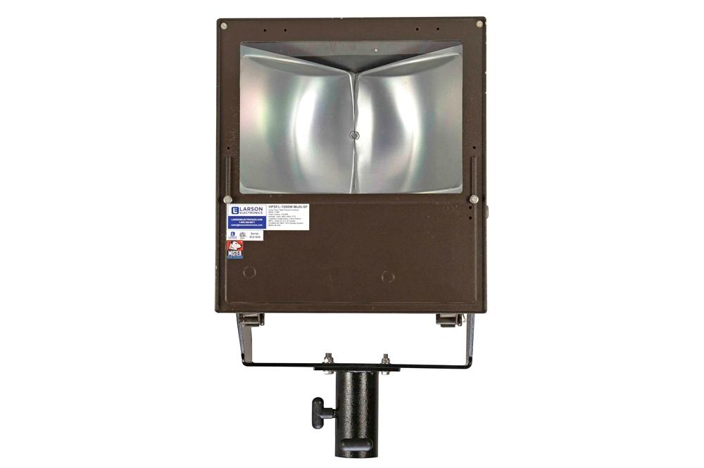 | Made in the USA The powerful and efficient HPSFL-1000W high pressure sodium light fixture from Larson Electronics produces 110,000 lumens of light in a wide flood pattern, is wet area rated and ideal for illuminating work spaces and open areas on a large scale.  This attractive high pressure sodium fixture from Larson Electronics is weatherproof and suitable for use in wet areas, making it an ideal lighting solution for parking lots, small fields, building exteriors and outdoor work areas. The lamp housing is constructed of die cast aluminum and features an anodized aluminum reflector, captive held lamp door, separate ballast compartment, stainless steel hardware and an attractive polyester powder coat finish. This unit is multi-voltage capable with an integral quad voltage ballast that is isolated within the housing. 1000 Watt high pressure sodium floodlights are also popular for use in hazardous locations and we carry a variety of such units. Please contact us using the information below for more information on hazardous location metal halides. | |||||