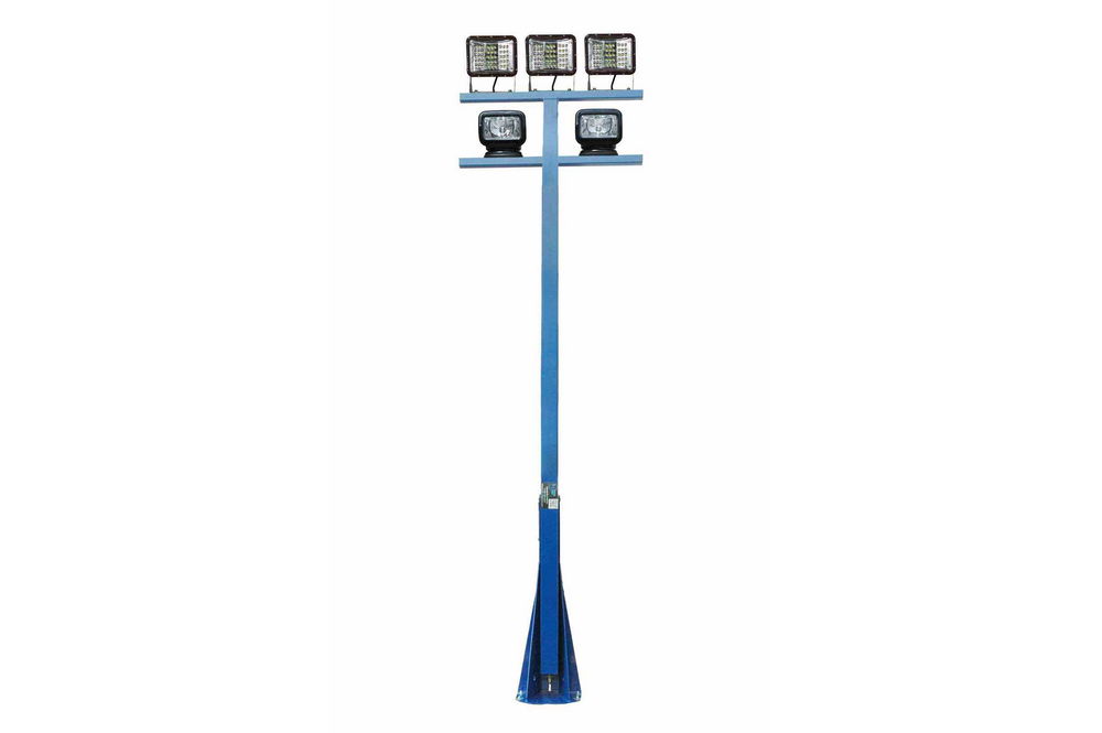 | Made in the USA The Larson Electronics LM-10-1S-3XWP60E-2XGLR fold over single stage light mast provides a safe and effective way for operators to quickly deploy the equipped flood lights to elevation of ten feet. This light tower features three 60 watt LED flood lights, two remote control halogen flood lights, and electric winch for raising and lowering the light mast. *PLEASE NOTE: ANY FREE SHIPPING OFFERS DO NOT APPLY TO LIGHT MASTS OR LIGHT TOWERS* This telescoping single stage steel light mast from Larson Electronics’ is designed to allow operators to quickly and safely deploy the equipped flood lights in locations where this equipment must be elevated to heights up to 10 feet for effective coverage. This light mast stands 10` tall when stood upright in the deployment position, and 32" when in laid down in the transportation position. The tower is constructed of square 3" by 3" by 1/8" thick steel tubing. The mast is extended to its full height using an included 600 lbs electric winch with 3/16" galvanized cable. Included with this light tower is three of our wet area suitable LEDWP-600E LED high output 60 watt LED flood light fixtures producing a combined total of approximately 16,200 lumens at 180 watts. The LEDWP-600E consists of forty-five LEDs housed within a waterproof aluminum housing that is powder coated for added durability and resistance to corrosion. The housing incorporates integral cooling fins for efficient heat dissipation and increased LED longevity. The LED lamp assembly is protected by a shatterproof polycarbonate lens which is secured to the housing with a waterproof seal. A 1/2" waterproof connector provides a secure and sealed power connection point and rounds out this unit`s weather resistant construction. Each floodlight is securely fastened to the light boom and stainless steel coated bracket and stainless steel hardware to provide secure mounting and resistance to rust and corrosion. The mounting assembly provides for 360/180 degrees of rotation and tilt to allow the user to position the unit as desired. This light tower also features two 65 watt remote control floodlights that each produce 6.5 million candle power, 1,300 lumen beam for a combined a total of 13 million candle power at 2,600 lumens and drawing 130 watts. Each light features 370° rotation and 140° tilt while producing a wide flood beam with limited spread or light spillage. Both light heads move simultaneously, requiring only one remote to operate both lights. These remote control lights are for hunting and demanding outdoor use with a weather resistant housing constructed of a high quality ASA Luran thermoplastic that is heat resistant, impact resistant, UV resistant, and able to withstand rugged use and abusive conditions. | ||||||||||