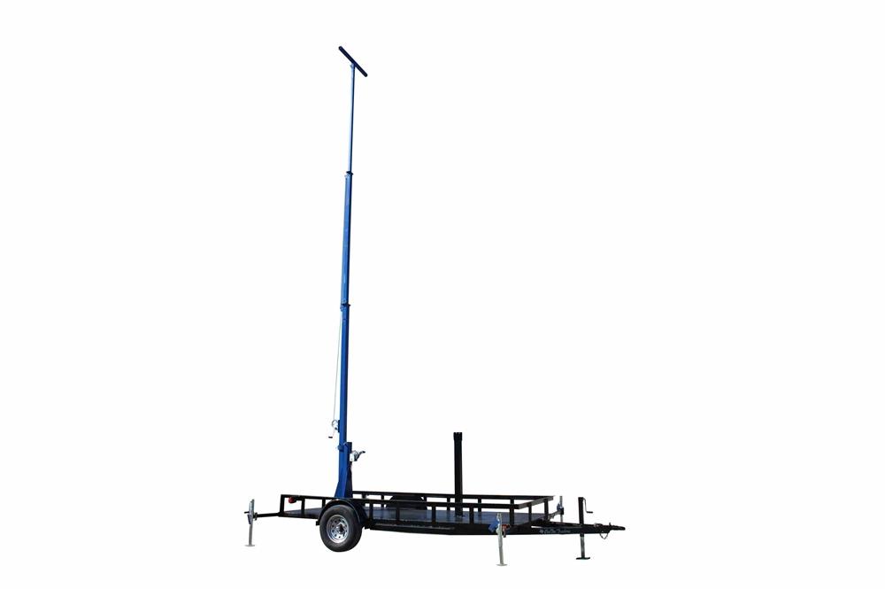 Made in the USA The Larson Electronics LM-11-4-5S-FM-300LB-TLR12 trailer mounted 5-stage light mast provides a safe and effective way for operators to quickly deploy lights, security cameras and other equipment to elevations up to eleven feet. This light tower collapses down to four feet for easy transportation, features an articulating boom that allows for 360° of rotation and a removable mast head for storing mounted equipment when not in use. The entire assembly is mounted onto a 8` single axle trailer, allowing operators to transport this fixed mount (no folding over)  boom from location to location. *PLEASE NOTE: ANY FREE SHIPPING OFFERS DO NOT APPLY TO LIGHT MASTS OR LIGHT TOWERS* This telescoping five stage steel light mast from Larson Electronics is designed to allow operators to quickly and safely deploy lighting, cameras, and other electrical equipment in locations where this equipment must be elevated to heights up to 11' for effective coverage. This light boom can be extended to 11' for maximum area coverage and collapsed to 4' for applications where a smaller footprint is required. The tower is constructed of square steel tubing with a base section 2.39' in length and 7" by 7" by 1/4" thick, lower section 2.65' in length and 5" by 5" by 1/8" thick, middle section 2.92' in length and 4" by 4" by 1/8" thick, upper section 3.19' in length and 3" by 3" by 1/8" thick, and top section 3.77' in length and 2" by 2" by 1/8" thick. Each section has a 1'+ overlap. The mast is extended to its full height using an included 2,500 lb hand winch with 3/16" galvanized steel cable.