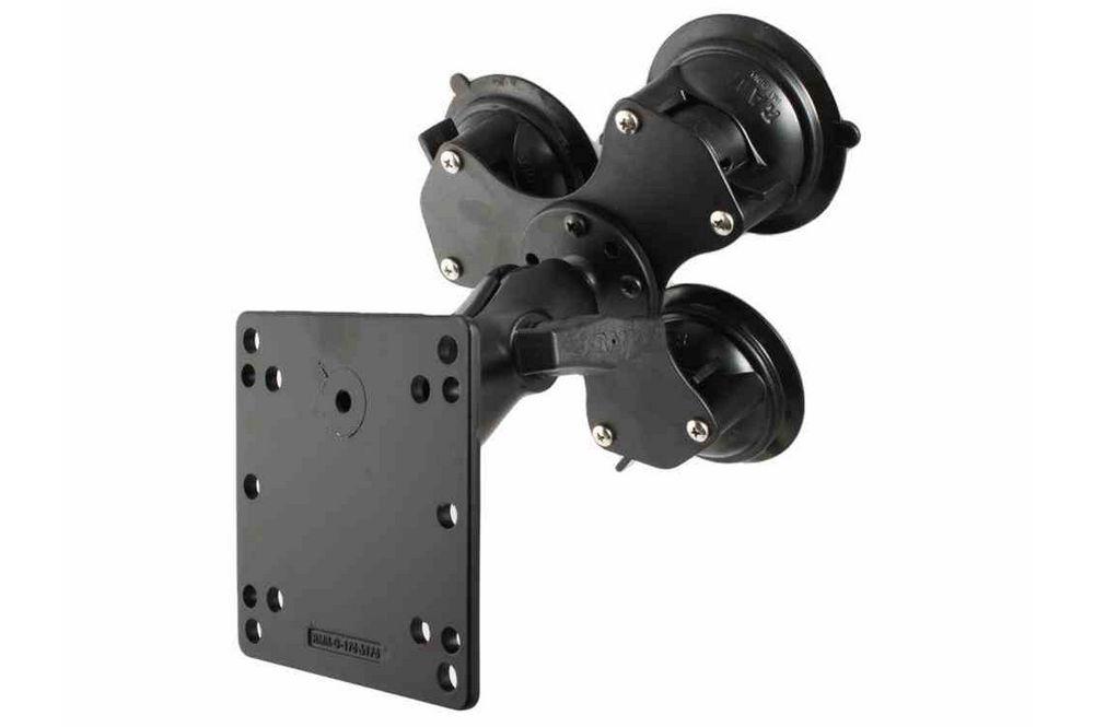 Made in the USA The MMP-DBSCM from Larson Electronics is a Suction Cup Mount with Magnetic Plate that allows operators to attach the mount to surfaces such as glass, plastic, aluminum and stainless steel work surfaces. Once the suction cup mount is mounted securely to the desired surface, operators can then attach magnetic mount equipment such as strobe lights and cameras. This suction cup mount with magnetic plate offers versatility and mounting ability where other mounting systems might fail or simply not work. The MMP-DBSCM consists of three 3.3" suction cups on a locking base and a short length double socket arm. The triple suction cup design offers secure mounting ability on plastic and other non-porous surfaces. This suction cup mount with magnetic plate also features a 1.5" rubber ball and socket system with adjustment points on both sides of the socket arm. This means that equipment attached to the magnetic plate on the front of this suction cup mount can be adjusted to the ideal angle or position required. The MMP-DBSCM has a weight capacity of approximately 10 pounds. The MMP-DBSCM suction cup mount from Larson Electronics is constructed from high strength composite marine grade aluminum that is powder coated for durability and resistance to corrosion. The magnetic mounting plate on the front of this suction cup mount is built from steel and is also powder coated for durability. The magnetic plate measures 4.75" square to accomodate a wide variety of magnetic lighting and other equipment.