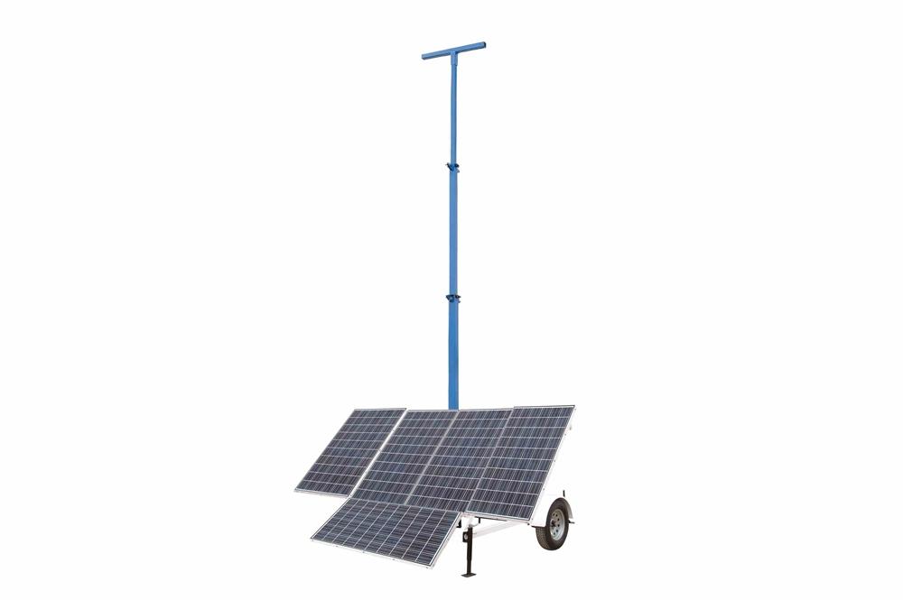 Solar Panel Assembly/Batteries: This unit is comprised of five solar panels, generating a total maximum output of 1.5 KW. The panels slide out to the left, right and downwards during deployment. The panels are wired to the solar charger control box which manages the charging system. These solar panels are mounted to a frame angled at 45° to capture the intensity of the sun for optimized light intake. A 640aH lithium-ion battery pack is included with the assembly. This battery pack consists of eight, 80aH batteries at 12V and provides 7,680kWh at 12V. Operators may power their 120V equipment via a 5-outlet power distribution box with five, 15-amp 5-15R duplex receptacles. The receptacle box enclosure is lockable. Component Control Center: All the electrical components are encapsulated in a NEMA 3R job box that is bolted to the trailer. Since most of these components are not rated for high heat, our component cooling system circulates air within the job box at 1400 CFM when the ambient temperature exceeds 90 degrees Fahrenheit. The job box that contains the component control system includes locks for security purposes. Trailer Assembly: The entire assembly is mounted to a 14` by 7`, single axle trailer via six 1/2" anchor bolts. The two-wheel trailer is equipped with 3,500 lbs axle and leaf springs with 15" trailer tires. A standard 2" ball coupling, two standard safety chains, and 7-pin flat trailer plug allow for easy hookup and towing. The trailer tongue can be removed for long term deployment. A rugged and waterproof job box is included, safely secured to the trailer. Four outriggers mounted to the corners of the trailer allow operators to level the trailer, and provide stabilization during deployment. All trailer lighting complies with DOT/FMVSS regulations.