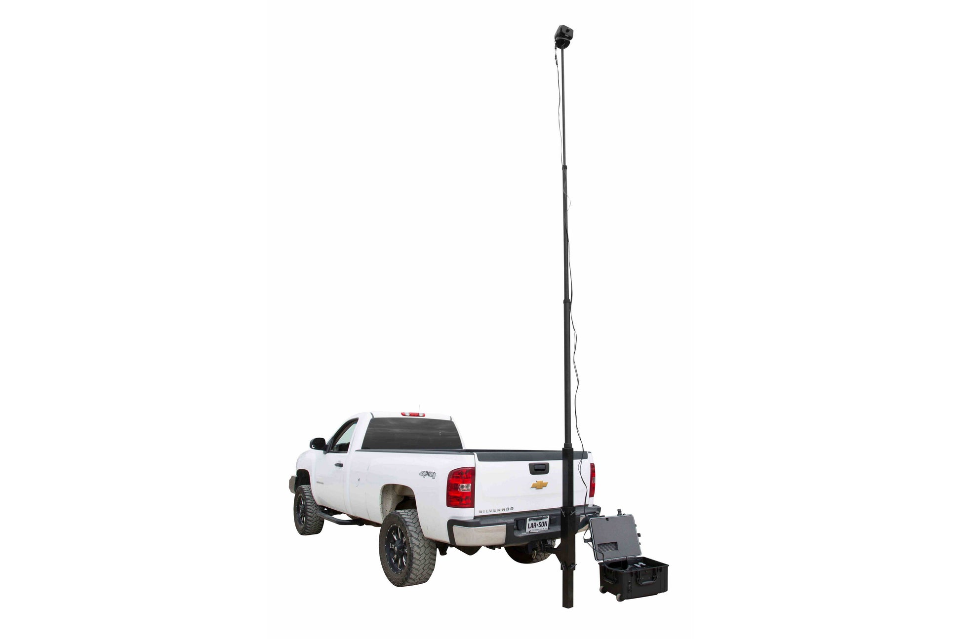 The trailer hitch mount and thermal camera tower are constructed of heavy-duty powder coated aluminum. This unit seamlessly attaches to a standard size trailer hitch and raises to 20` without the need for any tools. The hard case that holds the LCD monitor, rechargeable battery and remote controls is a heavy-duty, waterproof Condition 1 case that can stand up to rough conditions and treatment. The hard case acts as a base for camera operations and storage for the thermal camera monitor, battery, remote controls and camera. The case includes handles and solid no-slip wheels, which lets the operator tilt the unit back and roll/transport the screen, battery and remotes to a new location while fully deployed.
