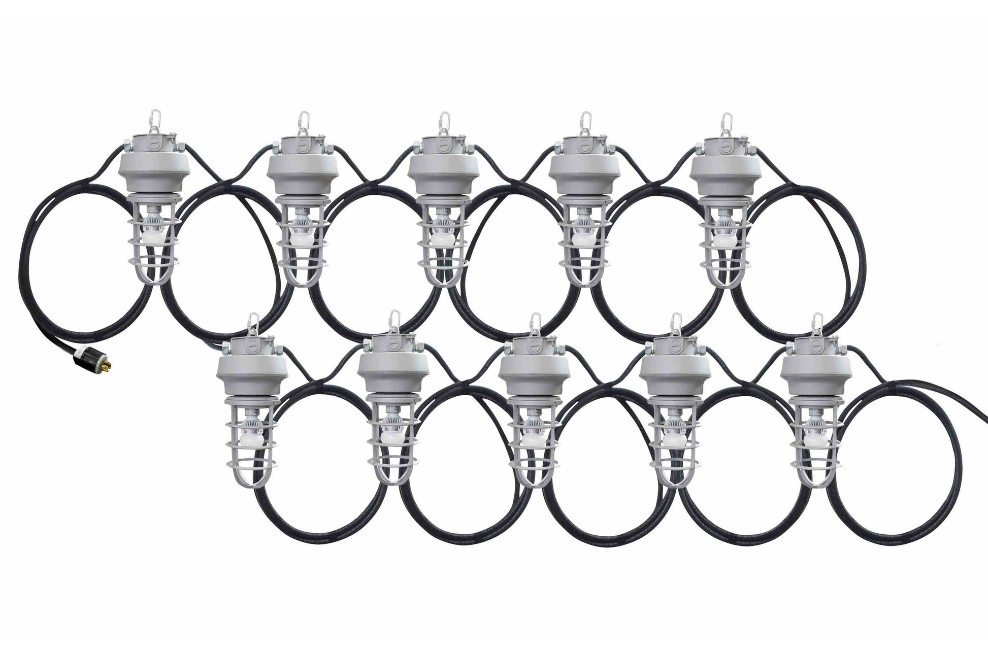 The Larson Electronics WAL-SL-MJ-10-NL-12.3-20-120V Heavy Duty Industrial String Light is designed for high output illumination and daisy chain connections across a total length of 140` away from the power source. The unit accepts customer-provided LED or incandescent lamps for versatile lighting options. This LED light stringer operates on 120V AC and provides operators with a temporary work light solution for tunnels and underpasses.