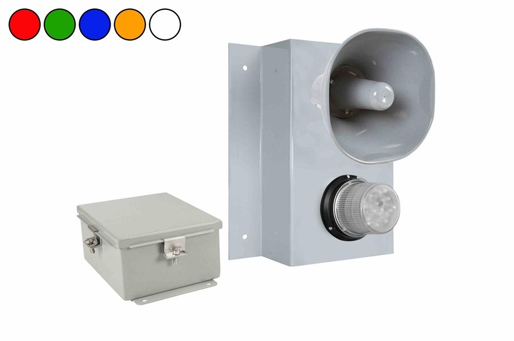 This LED beacon has 30 flash patterns including four simulated rotating patterns. This unit also offers alternate or simultaneous flash patterns with up to eight connected LED beacons. This waterproof beacon has a black powder coated die cast base that contains a fully potted circuit board. A clear polycarbonate lens protects the LED assembly and the housing is waterproof, shock resistant and built for for reliable and durable operation. This LED beacon draws only 12 amps on 120 volts DC. LED Benefits: Unlike gas burning and arc type lamps that have glass bulbs, LEDs have no filaments or fragile housings to break during operation and/or transportation. Instead of heating a small filament or using a combination of gases to produce light, light emitting diodes (LEDs) use semi-conductive materials that illuminate when electric current is applied, providing instant illumination with no warm up or cool down time before re-striking. Because there is no warm up period, this light can be cycled on and off with no reduction in lamp life. LED lights run at significantly cooler temperatures than traditional metal halide and high pressure sodium lights and contain no harmful gases, vapors, or mercury, making them both safer and more energy efficient. No extra energy is wasted in cooling enclosed work areas due to external heat emissions from bulb type lights, and the operator risks associated with traditional lighting methods, such as accidental burns and exposure to hazardous substances contained in the glass bulbs, are eliminated. In addition, LEDs are also safer for the environment as they are 100% recyclable, which eliminates the need for costly special disposal services required with traditional gas burning and arc type lamps. Horn Features: The audible warning horn on the WAL-TL-1XCL1B-C-PA-120V includes 8 different tones which can reach peak output of 110dBA and can be remotely operated for priority alerts. The housing on this horn is constructed of heavy duty aluminum and the horn is formed fiberglass. This work area horn/siren is weather and dust proof and NEMA 4X rated. Horn Tones: Selectable by switch on sound module. 1) Continuously running train of eight sounds in sequence. 2) Wail - Conventional Siren 3) Yelp - Rapid Siren 4) Two-Tone 5) Whoop - Ascending Low to High 6) Yeow - Descending High to Low 7) Horn - Steady 8) Beep - Slow Intermittent Horn 9) Stutter - Rapid Intermittent Horn 10) Remote - Enables Remote Selection of: 7 - Horn 4 - Two-Tone - Alternating 3 - Yelp - Rapid Siren 1 - Wail - Manual Siren   Mounting: The horn is mounted via an omni directional bracket which allows mounting to flat surfaces and vertical adjustment of the horn for secure placement and optimum sound direction. The strobing beacon includes a permanent mounting system via through holes and self tapping screws. This permanent mounting system provides maximum mounting security and reliable performance. The metal enclosure holding the electrical components of the horn/strobe can be mounted to flat surfaces. Power: The WAL-TL-1XCL1B-C-PA-120V operates on 120V AC voltage current.