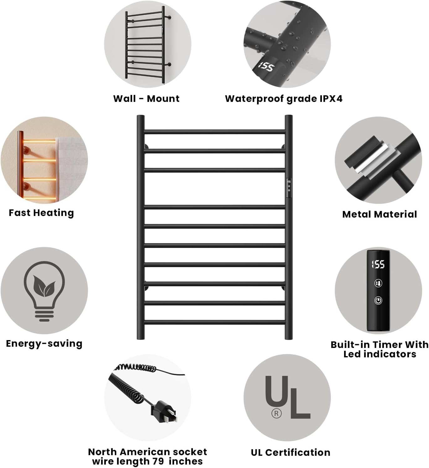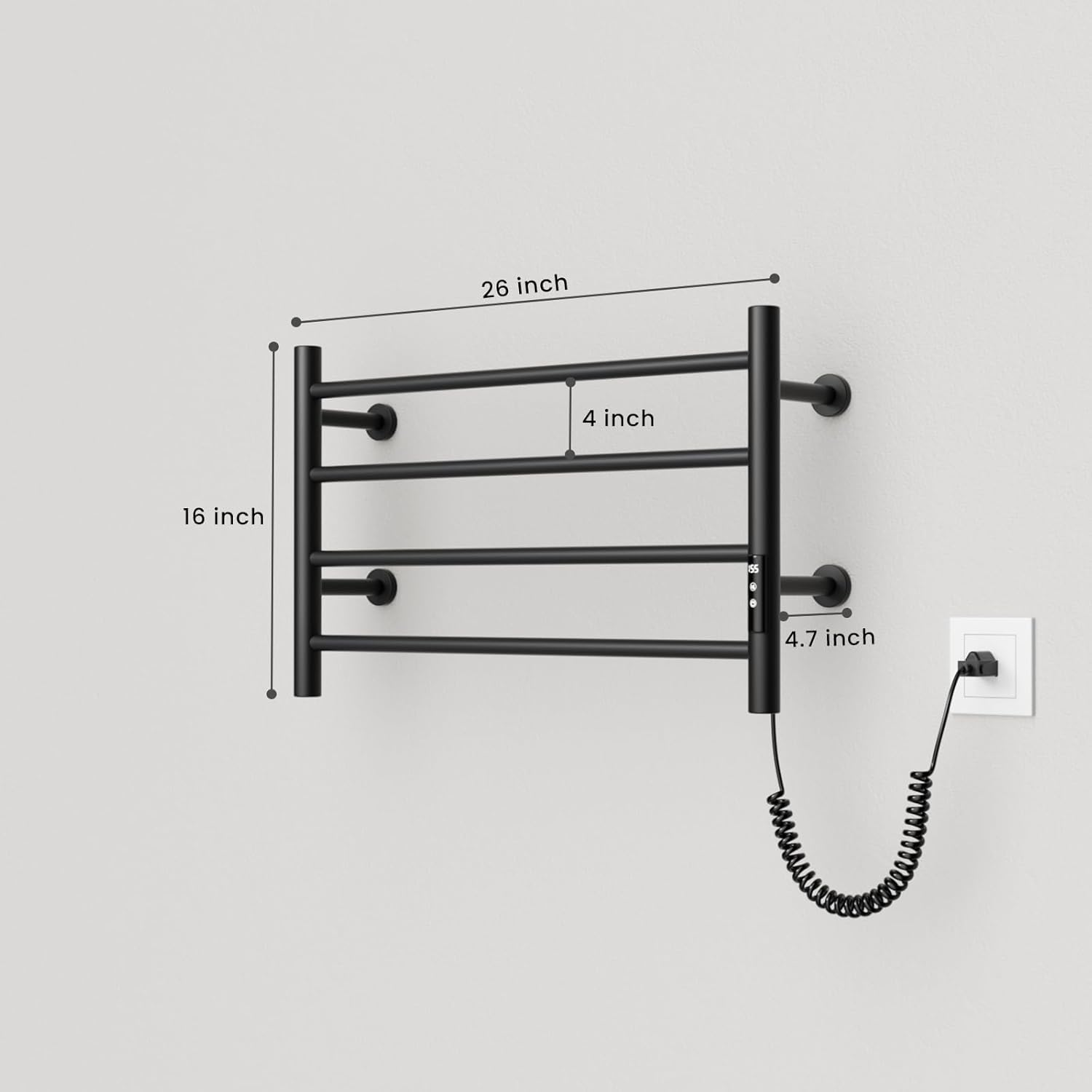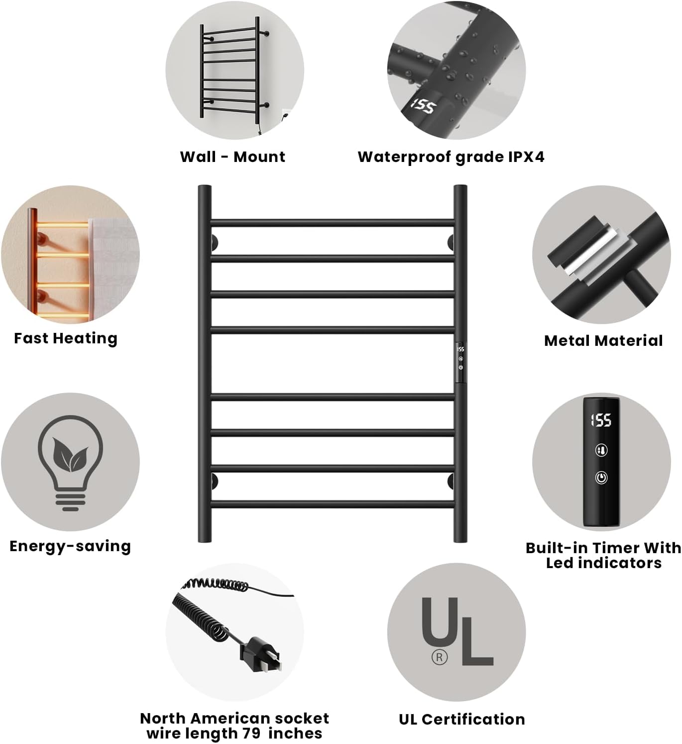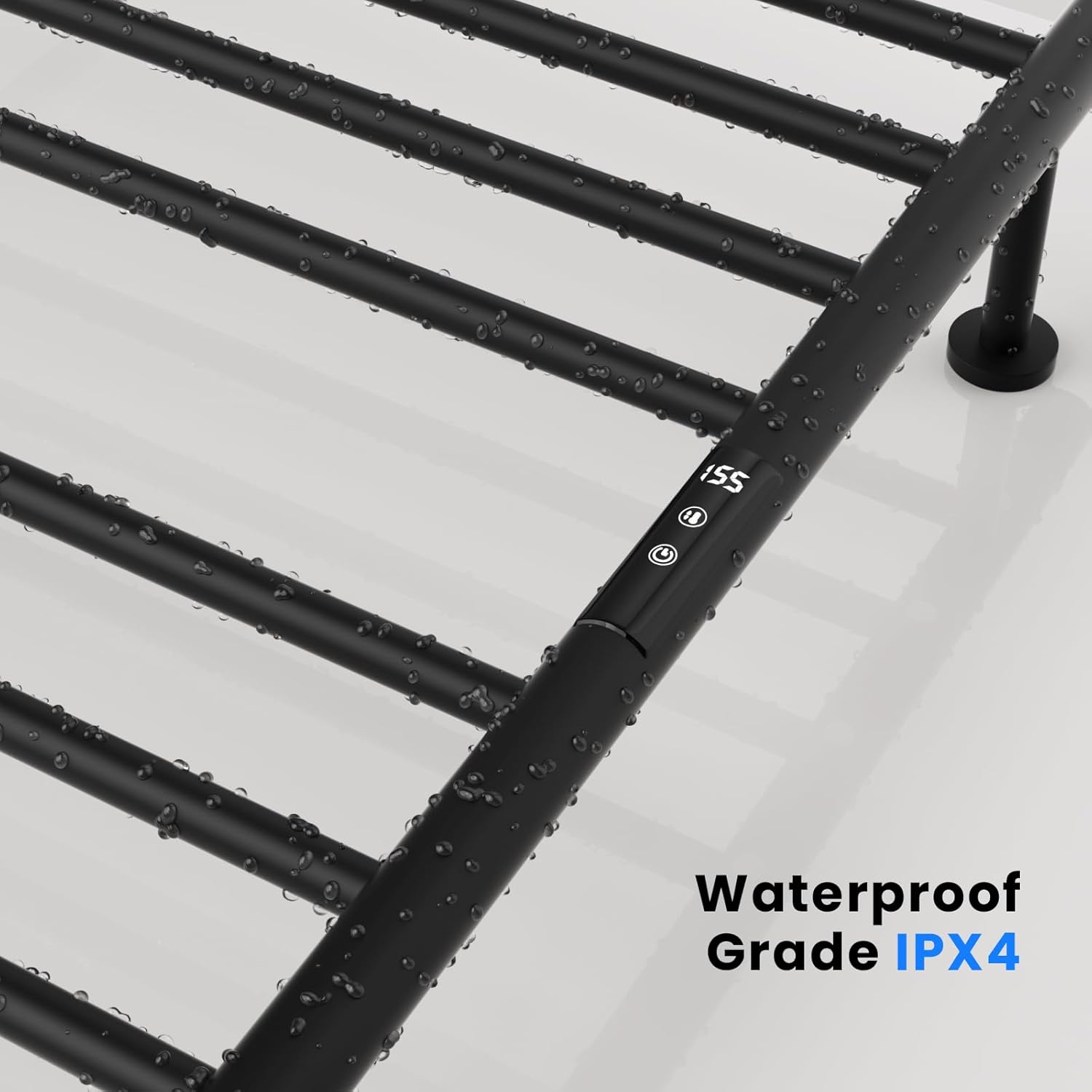 • 【Premium Material】Heated Towel Rack is made of 304 stainless steel, laser welded without any sharp edges. Easy to clean and durable use