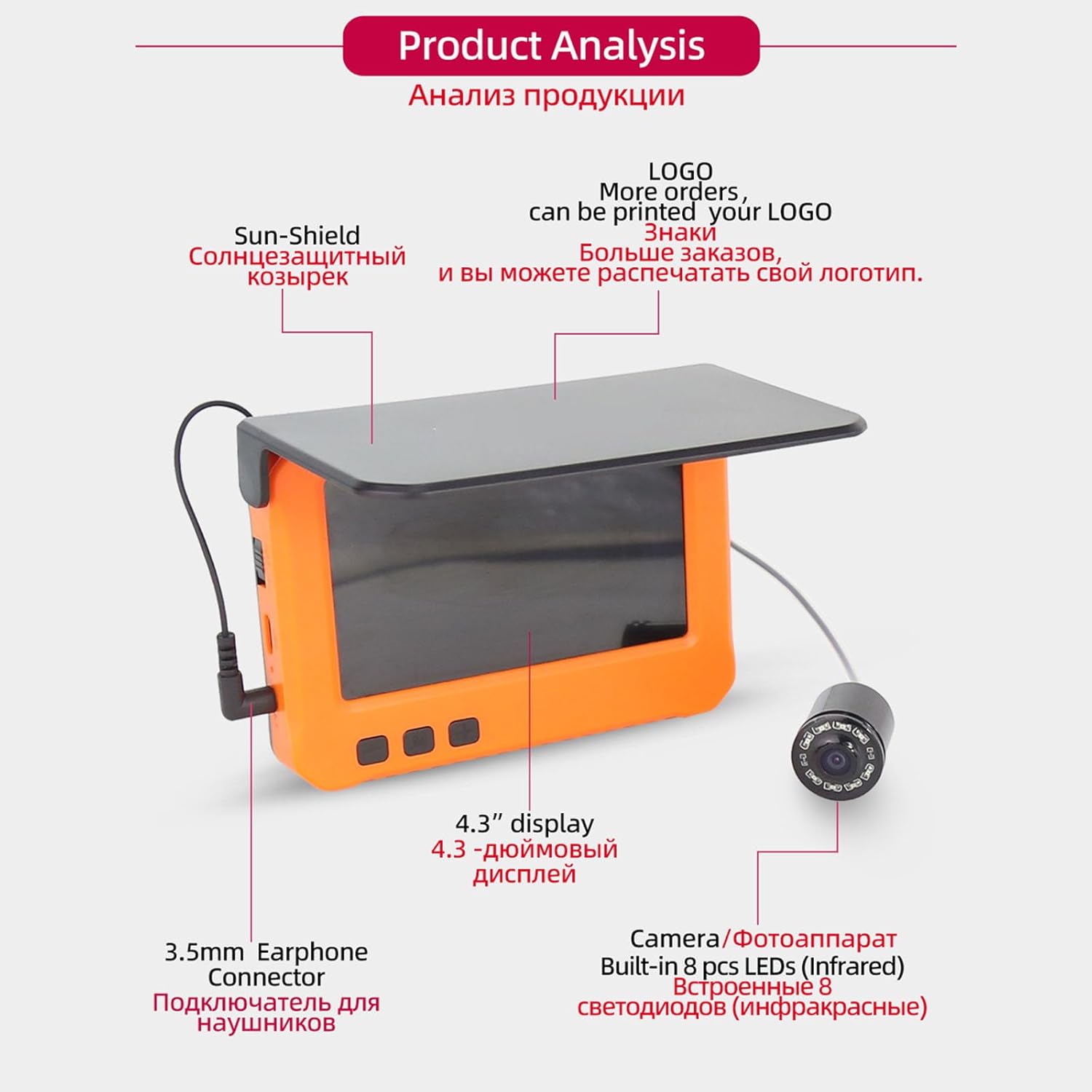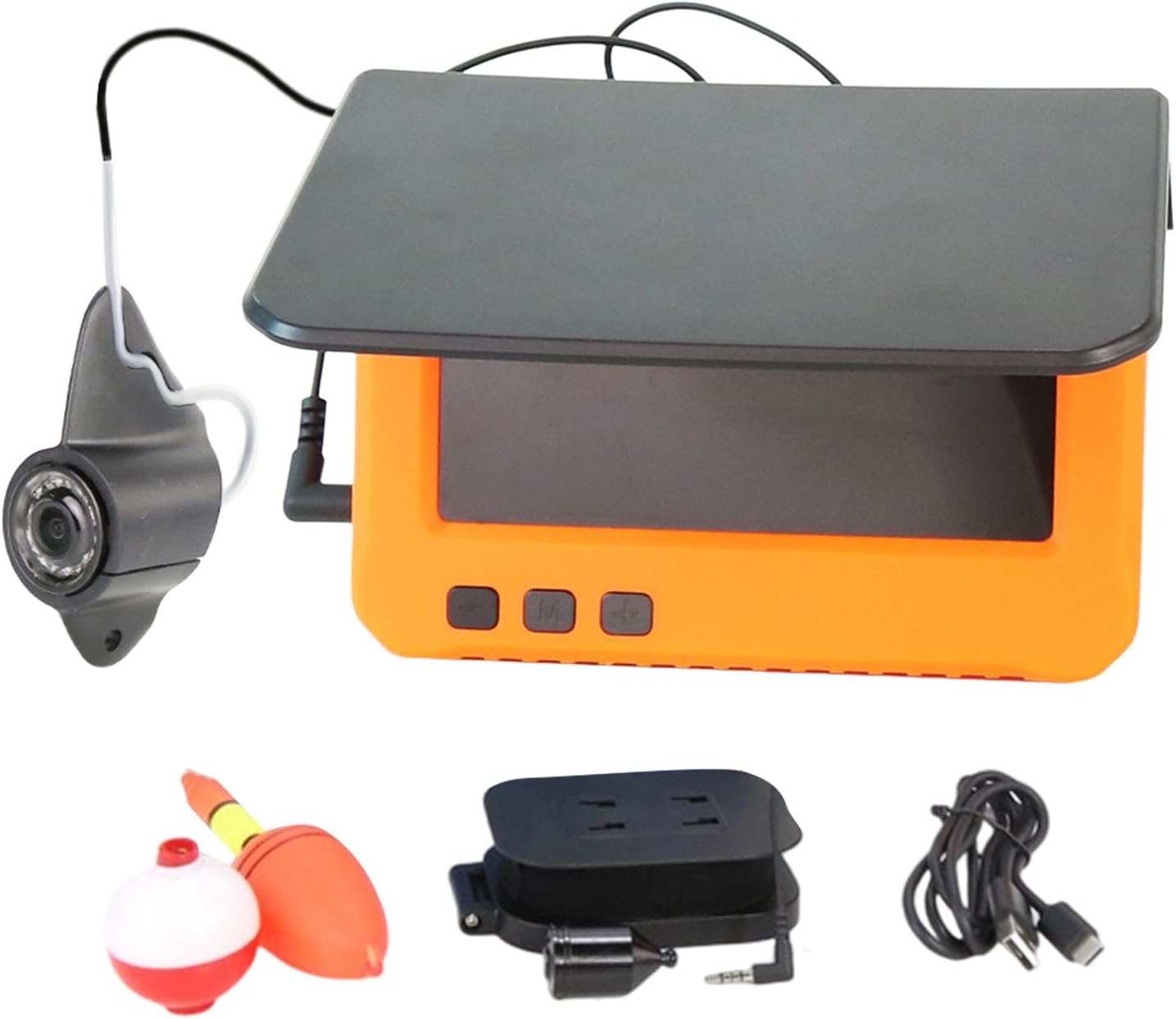 Foldable sunshades ensuring clear visual effects even in bright sun light or snow; A 4.3inch clear screen can help you observe whether the fish is biting the hook.