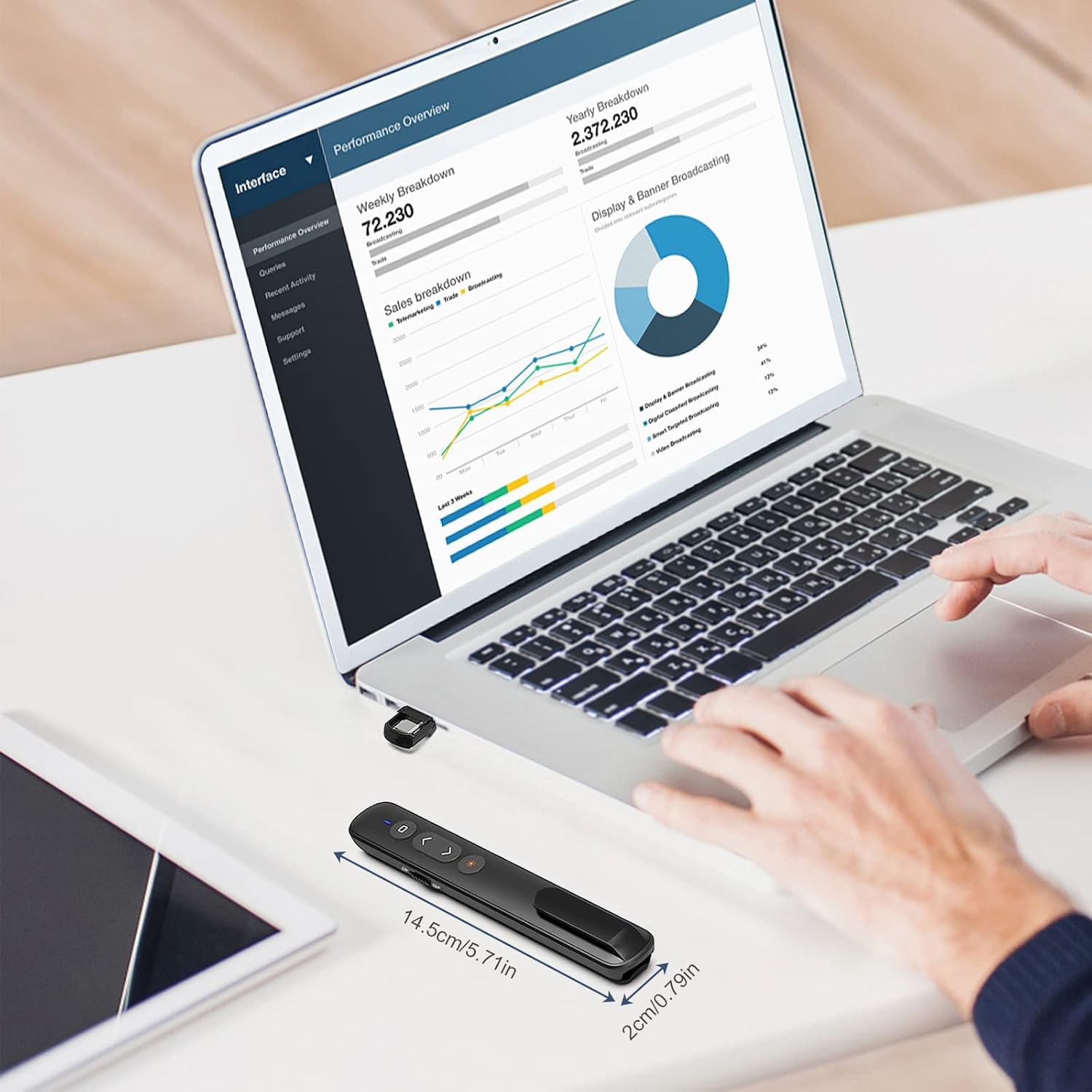 4. Thoughtful Design: The compact size and ergonomic design allows you to comfortably hold the presenter in your hand and easily fit it into your bag for portability.The USB receiver is stored in the PowerPoint Remote Control Presenter so you don't have to worry about losing it.